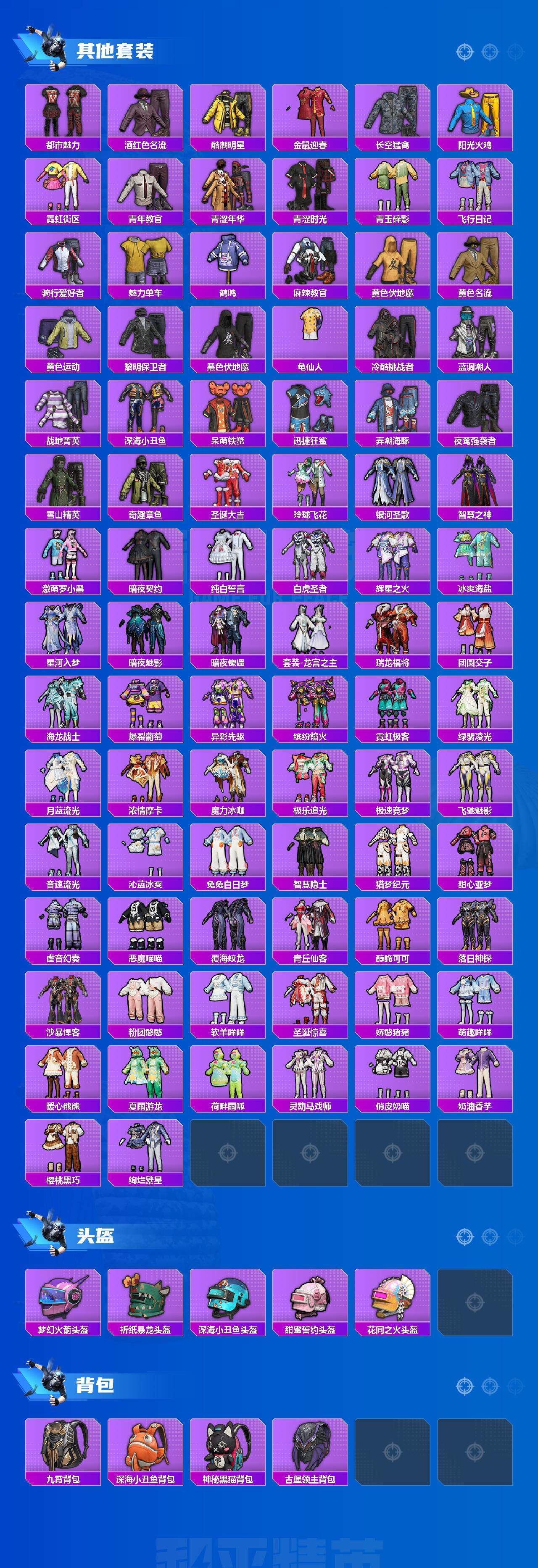 套装-浪漫天命,角色-军刀雅典娜,套装-龟仙人,套装-暗影哥特,套装-粉红小猪,套装-极速红龙,套装-狂沙舞者,套装-破蛋小黄鸡,套装-弄潮海豚,套装-雪山精英,套装-暗夜契约,套装-纯白誓言,套装-白虎圣者,套装-冰爽海盐,套装-瑞龙福将,套装-团圆交子