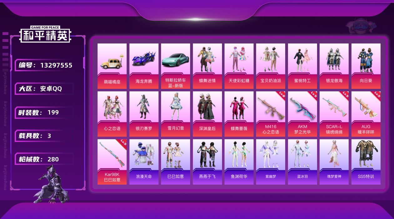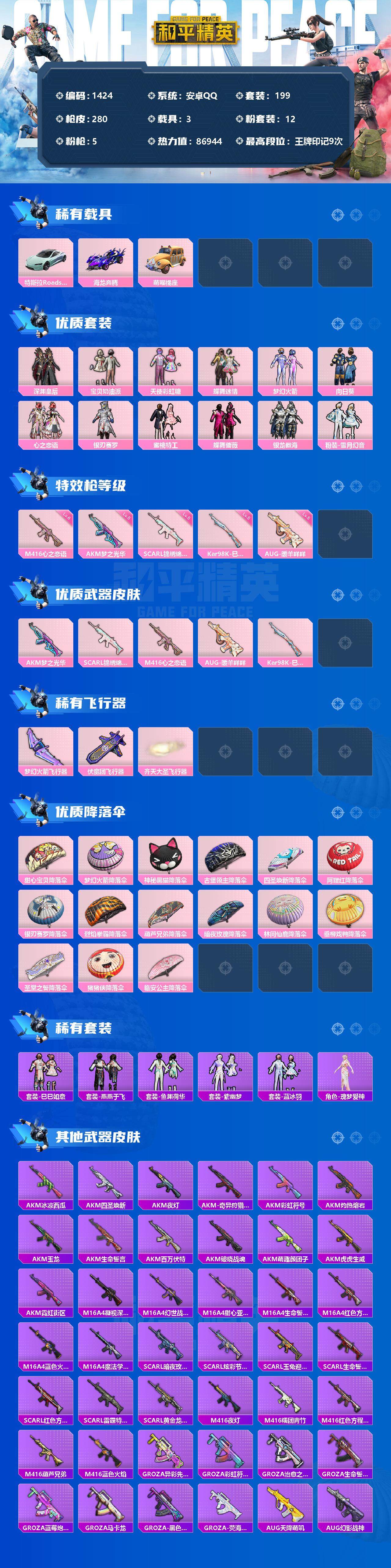 [13297555]安卓 手Q-12粉装-5特效枪-3载具-3粉色飞行器-86944热力值-9王牌印记-199套装-280枪皮 【热门品类】:粉装-梦幻火箭,套装-浪漫天命,套装-潮萌小黄鸭,套装-浪漫波比 【粉色载具】:特斯拉Roadster(水滴蓝),海龙奔腾,萌喵橘座 【粉色套装】:粉装-深渊皇后,粉装-宝贝奶油派,粉装-天使彩虹糖,粉装-蝶舞迷情,粉装-梦幻火箭,粉装-向日葵,粉装-心之恋语,粉装-银刃赛罗,粉装-蜜桃特工,粉装-蝶舞蔷薇,粉装-银龙傲海,粉装-雪月幻音 【粉色枪皮等级】:AKM-梦之光华(五级),SCAR-L-锦绣绵绵(五级),M416-心之恋语(六级),AUG-暖羊咩咩(五级),Kar98K-巳巳如意(五级) 【粉色枪皮】:AKM-梦之光华,SCAR-L-锦绣绵绵,M416-心之恋语,AUG-暖羊咩咩,Kar98K-巳巳如意 【粉色飞行器】:梦幻火箭飞行器,伏魔团飞行器,齐天大圣飞行器 【粉色降落伞】:甜心宝贝降落伞,梦幻火箭降落伞,神秘黑猫降落伞,古堡领主降落伞,四圣焕新降落伞,阿狸红降落伞,银刃赛罗降落伞,烈焰拳霸降落伞,葫芦兄弟降落伞,暗夜玫瑰降落伞,林间仙鹿降落伞,垂柳戏鸭降落伞,圣堂之誓降落伞,猪猪侠降落伞,临安公主降落伞 【稀有套装】:套装-巳巳如意,套装-燕燕于飞,套装-鱼渊荷华,套装-紫幽梦,套装-蓝冰羽,角色-瑰梦爱神 【稀有枪皮】:AKM-冰凉西瓜,AKM-四圣焕新,AKM-夜灯,AKM-奇异狩猎者,AKM-彩虹符号,AKM-灼热熔岩,AKM-玉龙,AKM-生命誓言,AKM-百万伏特,AKM-破晓战魂,AKM-萌趣颜团子,AKM-虎虎生威,AKM-霓虹街区,M16A4-凝视深渊,M16A4-幻世战舞者,M16A4-甜心亚梦,M16A4-生命誓言,M16A4-红色方程式,M16A4-蓝色火焰,M16A4-魔法学院,SCAR-L-暗夜玫瑰,SCAR-L-炫彩节奏,SCAR-L-玉兔迎春,SCAR-L-生命誓言,SCAR-L-红色方程式,SCAR-L-雷霆特警,SCAR-L-黄金龙骨,M416-夜灯,M416-糯团青竹,M416-红色方程式,M416-葫芦兄弟,M416-蓝色火焰,GROZA-异彩先驱,GROZA-彩虹符号,GROZA-治愈之星,GROZA-生命誓言,GROZA-蓝莓炮弹,GROZA-马卡龙,GROZA-黑色刀锋,GROZA-