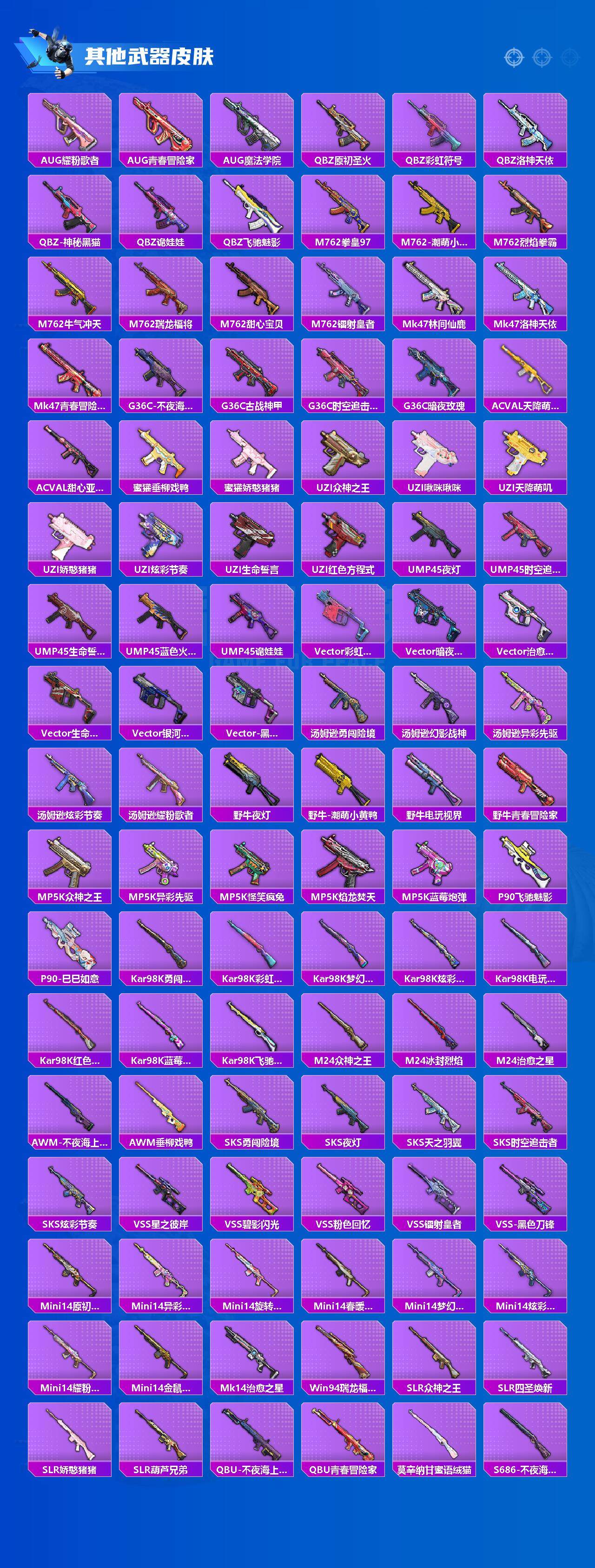 【稀有枪皮】:AKM-冰凉西瓜,AKM-四圣焕新,AKM-夜灯,AKM-奇异狩猎者,AKM-彩虹符号,AKM-灼热熔岩,AKM-玉龙,AKM-生命誓言,AKM-百万伏特,AKM-破晓战魂,AKM-萌趣颜团子,AKM-虎虎生威,AKM-霓虹街区,M16A4-凝视深渊,M16A4-幻世战舞者,M16A4-甜心亚梦,M16A4-生命誓言,M16A4-红色方程式,M16A4-蓝色火焰,M16A4-魔法学院,SCAR-L-暗夜玫瑰,SCAR-L-炫彩节奏,SCAR-L-玉兔迎春,SCAR-L-生命誓言,SCAR-L-红色方程式,SCAR-L-雷霆特警,SCAR-L-黄金龙骨,M416-夜灯,M416-糯团青竹,M416-红色方程式,M416-葫芦兄弟,M416-蓝色火焰,GROZA-异彩先驱,GROZA-彩虹符号,GROZA-治愈之星,GROZA-生命誓言,GROZA-蓝莓炮弹,GROZA-马卡龙,GROZA-黑色刀锋,GROZA-