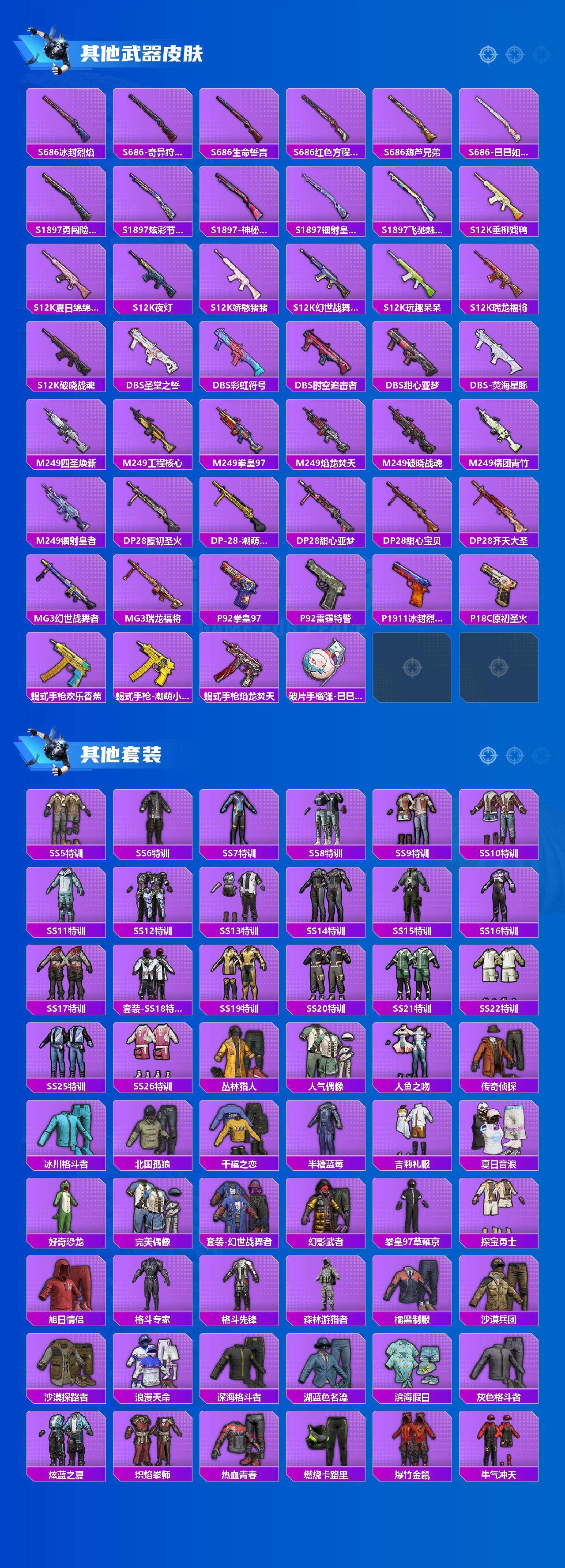 - PX_2106938-6【可二次】【因赛季更新游戏段付以上号为准!】安卓Q-2w热力值 历史不朽星钻Ⅴ 55套装 80枪皮 【1特效枪】 Kar98K-巳巳如意 (4级) 【4热门】 雪山精英 梦魇先生 M416-快乐主宰 Kar98K-深海曼妙 【1头盔】 放客神游头盔 【1背包】 马卡龙背包