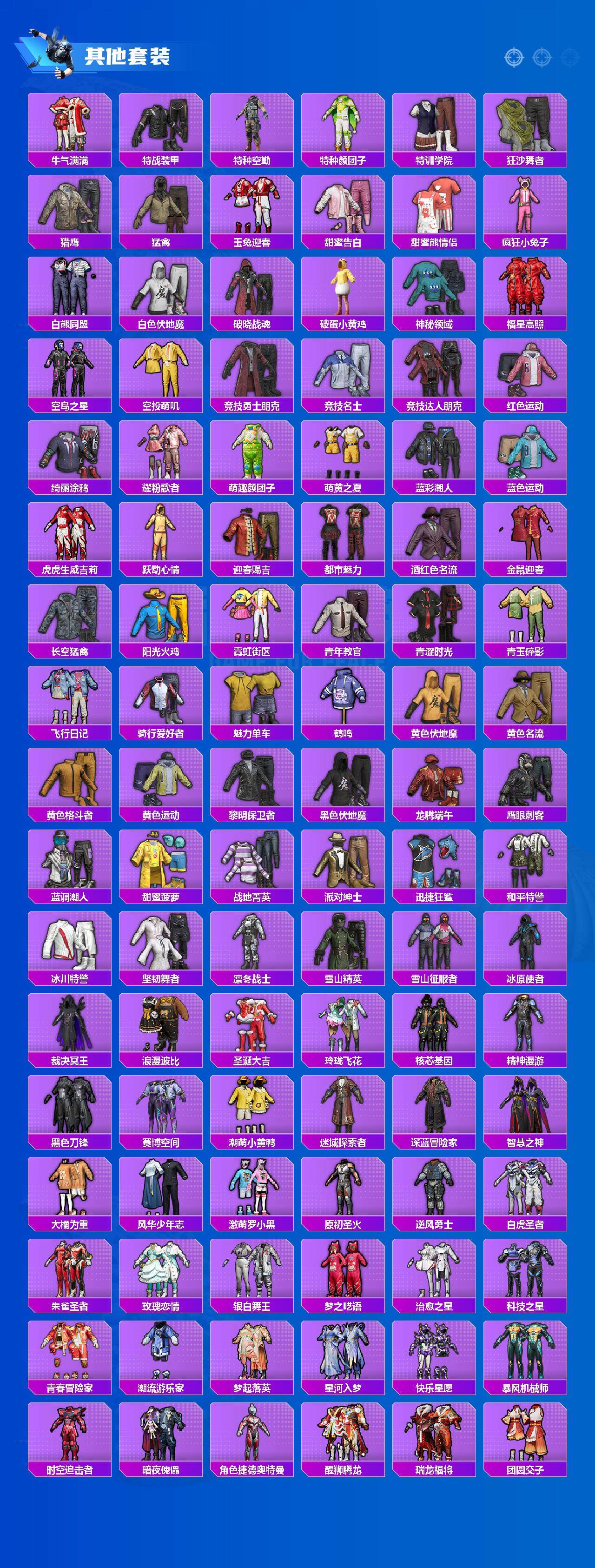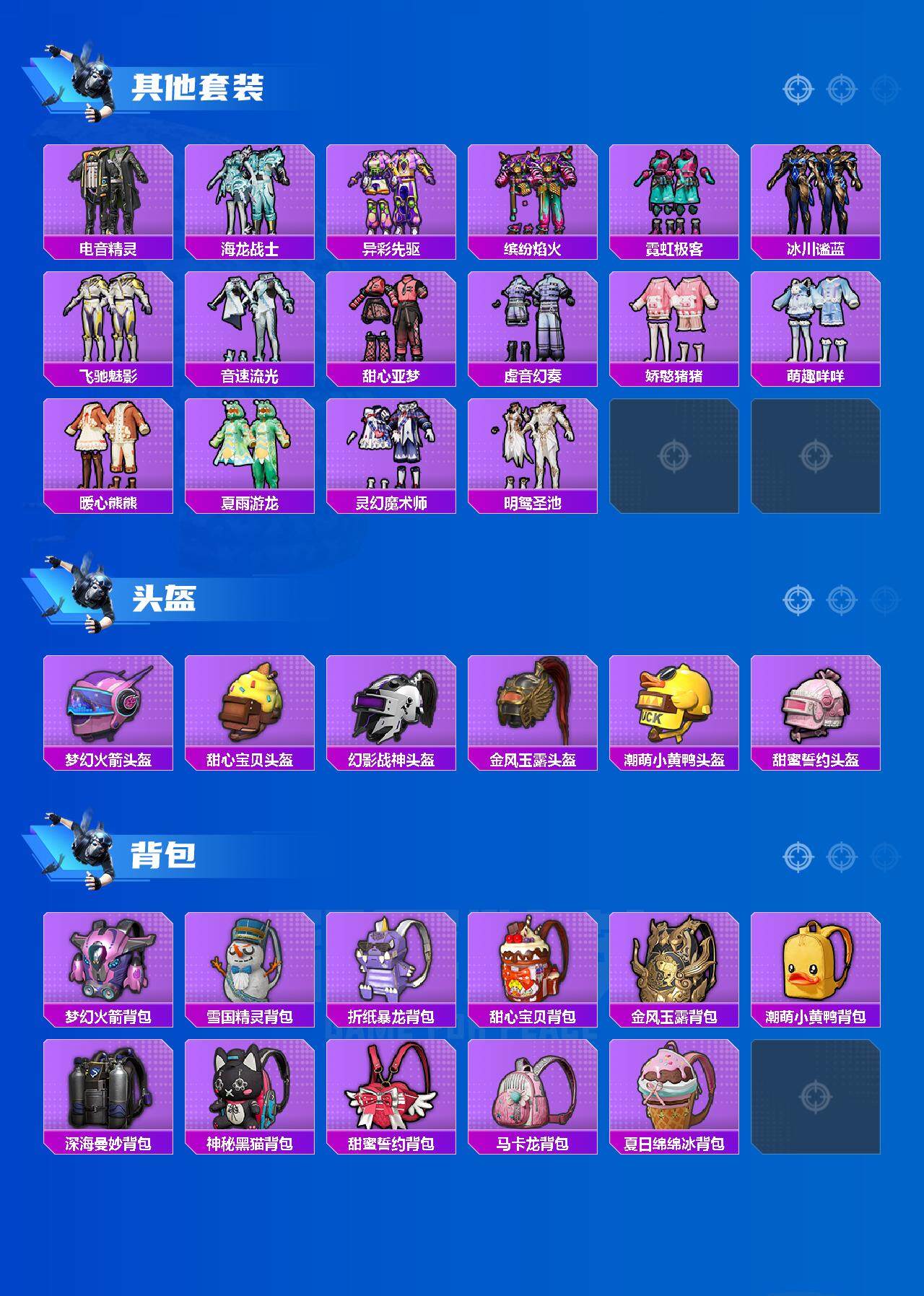 套装-浪漫天命,套装-狂沙舞者,套装-破蛋小黄鸡,套装-雪山精英,套装-黑色刀锋,赛博空间套装,风华少年志套装,套装-白虎圣者,套装-朱雀圣者,套装-梦之呓语,套装-梦起落英,套装-醒狮腾龙,套装-瑞龙福将,套装-团圆交子