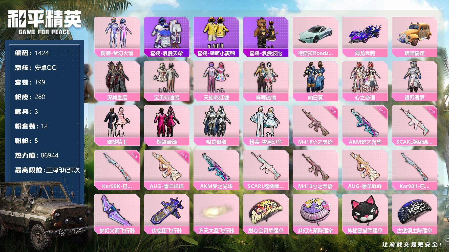 [13297555]安卓 手Q-12粉装-5特效枪-3载具-3粉色飞行器-86944热力值-9王牌印记-199套装-280枪皮