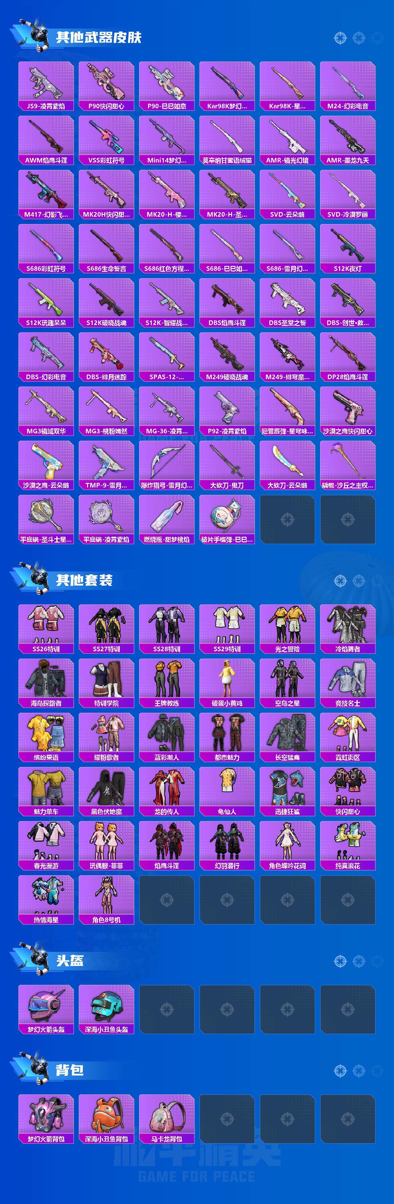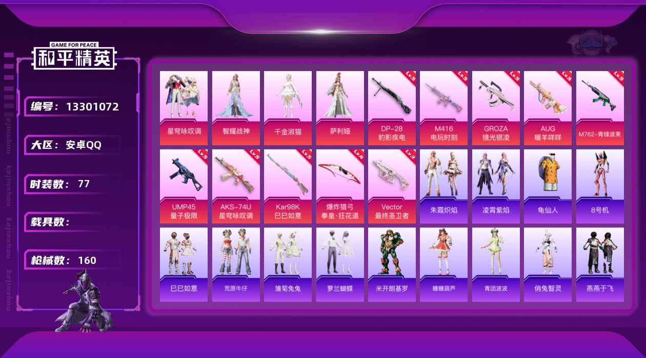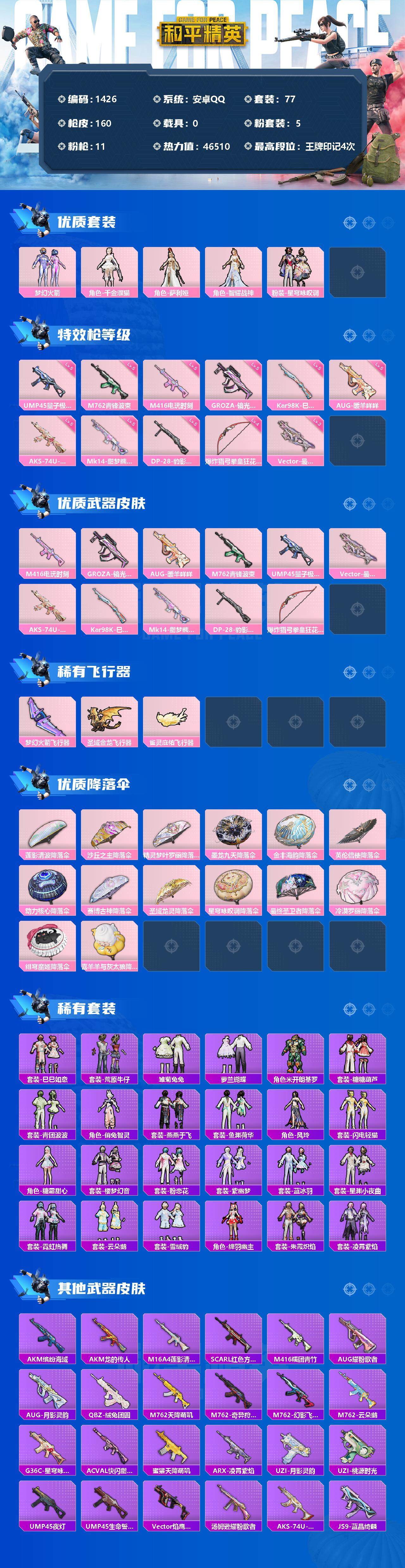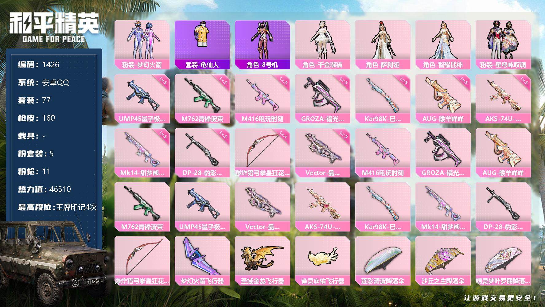 [13301072]安卓 手Q-5粉装-11特效枪-0载具-3粉色飞行器-46510热力值-4王牌印记-77套装-160枪皮 【热门品类】:粉装-梦幻火箭,套装-龟仙人,角色-8号机 【粉色套装】:粉装-梦幻火箭,角色-千金淑猫,角色-萨利娅,角色-智耀战神,粉装-星穹咏叹调 【粉色枪皮等级】:M416-电玩时刻(五级),GROZA-镜光银凌(五级),AUG-暖羊咩咩(五级),M762-青锋波束(五级),UMP45-量子极限(五级),Vector-最终圣卫者(三级),AKS-74U-星穹咏叹调(五级),Kar98K-巳巳如意(五级),Mk14-甜梦熊击(五级),DP-28-豹影疾电(五级),爆炸猎弓-拳皇·狂花道(四级) 【粉色枪皮】:M416-电玩时刻,GROZA-镜光银凌,AUG-暖羊咩咩,M762-青锋波束,UMP45-量子极限,Vector-最终圣卫者,AKS-74U-星穹咏叹调,Kar98K-巳巳如意,Mk14-甜梦熊击,DP-28-豹影疾电,爆炸猎弓-拳皇·狂花道 【粉色飞行器】:梦幻火箭飞行器,圣域金龙飞行器,雀灵庇佑飞行器 【粉色降落伞】:莲影清波降落伞,沙丘之主降落伞,精灵梦叶罗丽降落伞,墨龙九天降落伞,金丰海韵降落伞,英伦信使降落伞,动力核心降落伞,赛博古神降落伞,圣域龙灵降落伞,星穹咏叹调降落伞,最终圣卫者降落伞,冷漠罗丽降落伞,绯穹魔姬降落伞,喜羊羊与灰太狼降落伞 【稀有套装】:套装-龟仙人,套装-巳巳如意,套装-荒原牛仔,套装-雏菊兔兔,套装-萝兰蝴蝶,角色-米开朗基罗,套装-糖糖葫芦,套装-青团波波,角色-俏兔智灵,套装-燕燕于飞,套装-鱼渊荷华,角色-风玲,套装-闪电轻猫,角色-糖霜甜心,套装-樱梦幻音,套装-粉恋花,套装-紫幽梦,套装-蓝冰羽,套装-星渊小夜曲,套装-霓虹热舞,套装-云朵鹅,套装-雪绒豹,角色-绛羽幽主,套装-朱霞炽焰,套装-凌霄紫焰 【稀有枪皮】:AKM-缤纷海域,AKM-龙的传人,M16A4-莲影清波,SCAR-L-红色方程式,M416-糯团青竹,AUG-耀粉歌者,AUG-月影灵韵,QBZ-绒兔团圆,M762-天降萌叽,M762-奇异狩猎者,M762-云朵鹅,M762-幻影飞狐,G36C-星穹咏叹调,AC-VAL-快闪甜心,蜜獾-天降萌叽,ARX-凌霄紫焰,UZI-桃源时光,UZI-月影灵韵,UMP45-夜灯,UMP45-生命誓言,