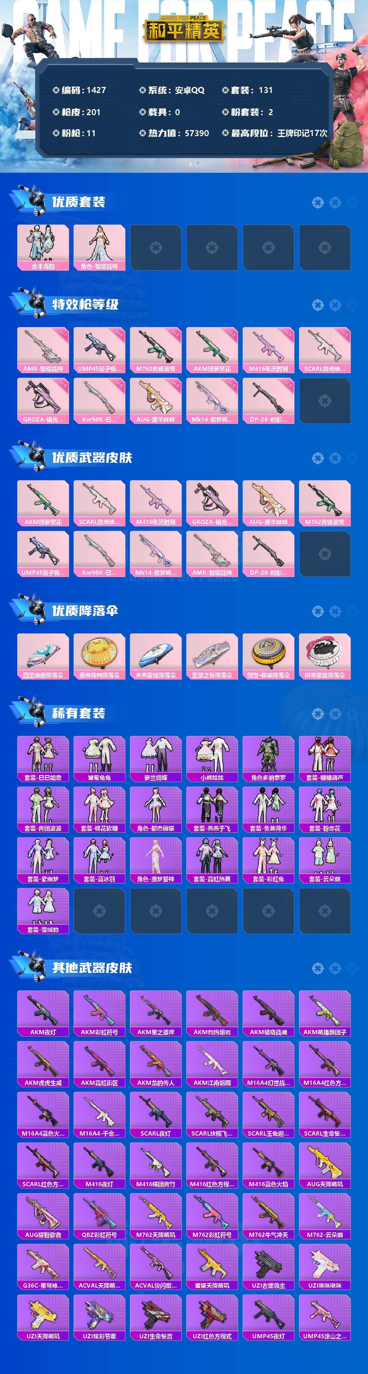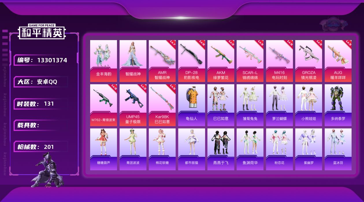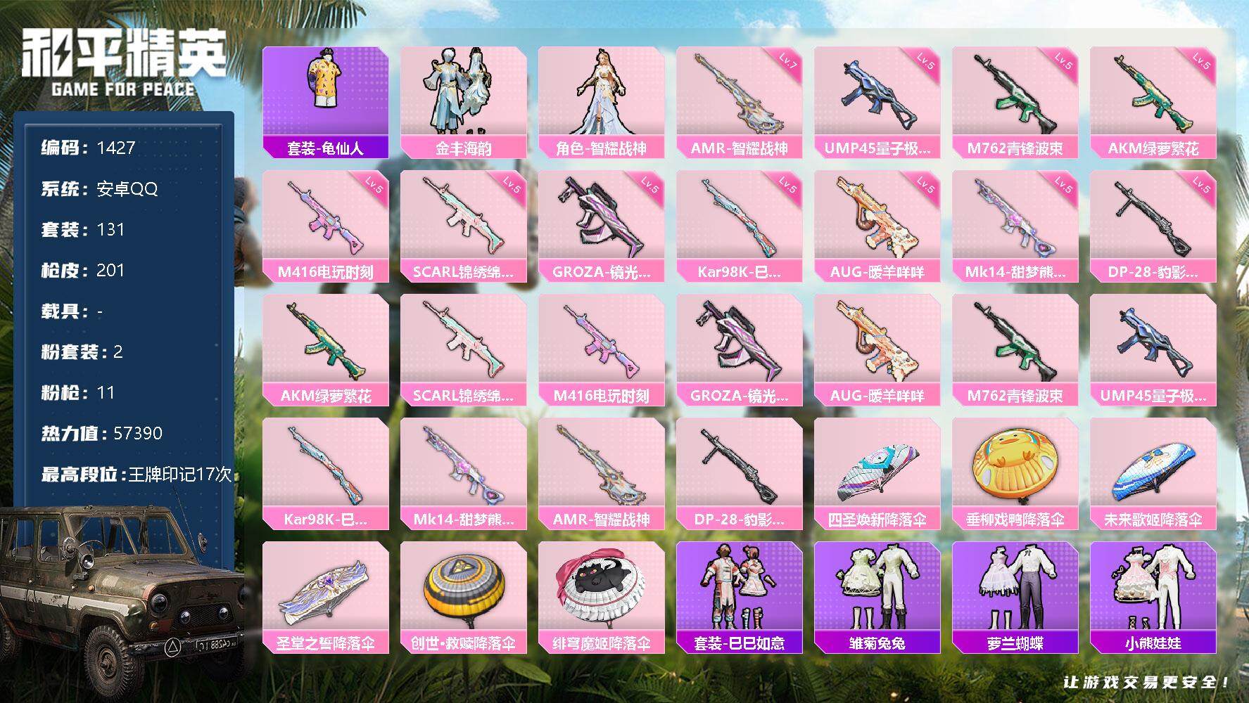 [13301374]安卓 手Q-2粉装-11特效枪-0载具-0粉色飞行器-57390热力值-17王牌印记-131套装-201枪皮 【热门品类】:套装-龟仙人 【粉色套装】:粉装-金丰海韵,角色-智耀战神 【粉色枪皮等级】:AKM-绿萝繁花(五级),SCAR-L-锦绣绵绵(五级),M416-电玩时刻(五级),GROZA-镜光银凌(五级),AUG-暖羊咩咩(五级),M762-青锋波束(五级),UMP45-量子极限(五级),Kar98K-巳巳如意(五级),Mk14-甜梦熊击(五级),AMR-智耀战神(七级),DP-28-豹影疾电(五级) 【粉色枪皮】:AKM-绿萝繁花,SCAR-L-锦绣绵绵,M416-电玩时刻,GROZA-镜光银凌,AUG-暖羊咩咩,M762-青锋波束,UMP45-量子极限,Kar98K-巳巳如意,Mk14-甜梦熊击,AMR-智耀战神,DP-28-豹影疾电 【粉色降落伞】:四圣焕新降落伞,垂柳戏鸭降落伞,未来歌姬降落伞,圣堂之誓降落伞,创世·救赎降落伞,绯穹魔姬降落伞 【稀有套装】:套装-龟仙人,套装-巳巳如意,套装-雏菊兔兔,套装-萝兰蝴蝶,套装-小熊娃娃,角色-多纳泰罗,套装-糖糖葫芦,套装-青团波波,套装-棉花软糖,角色-都市丽猫,套装-燕燕于飞,套装-鱼渊荷华,套装-粉恋花,套装-紫幽梦,套装-蓝冰羽,角色-瑰梦爱神,套装-霓虹热舞,套装-彩虹兔,套装-云朵鹅,套装-雪绒豹 【稀有枪皮】:AKM-夜灯,AKM-彩虹符号,AKM-星之彼岸,AKM-江南烟雨,AKM-灼热熔岩,AKM-破晓战魂,AKM-萌趣颜团子,AKM-虎虎生威,AKM-霓虹街区,AKM-龙的传人,M16A4-幻世战舞者,M16A4-红色方程式,M16A4-蓝色火焰,M16A4-千金淑猫,SCAR-L-夜灯,SCAR-L-扶摇飞仙,SCAR-L-玉兔迎春,SCAR-L-生命誓言,SCAR-L-红色方程式,M416-夜灯,M416-糯团青竹,M416-红色方程式,M416-蓝色火焰,AUG-天降萌叽,AUG-耀粉歌者,QBZ-彩虹符号,M762-天降萌叽,M762-彩虹符号,M762-牛气冲天,M762-云朵鹅,G36C-星穹咏叹调,AC-VAL-天降萌叽,AC-VAL-快闪甜心,蜜獾-天降萌叽,UZI-古堡领主,UZI-啾咪啾咪,UZI-天降萌叽,UZI-炫彩节奏,UZI-生命誓言,UZI-红色方程