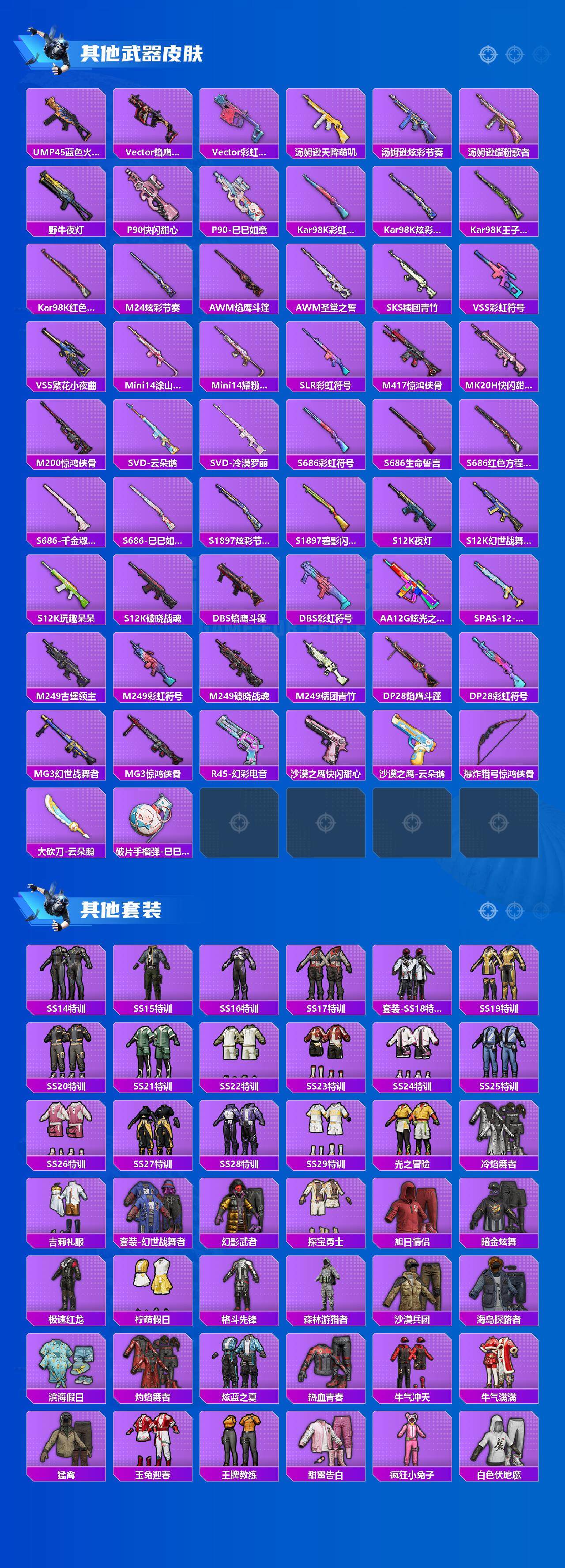 【稀有枪皮】:AKM-夜灯,AKM-彩虹符号,AKM-星之彼岸,AKM-江南烟雨,AKM-灼热熔岩,AKM-破晓战魂,AKM-萌趣颜团子,AKM-虎虎生威,AKM-霓虹街区,AKM-龙的传人,M16A4-幻世战舞者,M16A4-红色方程式,M16A4-蓝色火焰,M16A4-千金淑猫,SCAR-L-夜灯,SCAR-L-扶摇飞仙,SCAR-L-玉兔迎春,SCAR-L-生命誓言,SCAR-L-红色方程式,M416-夜灯,M416-糯团青竹,M416-红色方程式,M416-蓝色火焰,AUG-天降萌叽,AUG-耀粉歌者,QBZ-彩虹符号,M762-天降萌叽,M762-彩虹符号,M762-牛气冲天,M762-云朵鹅,G36C-星穹咏叹调,AC-VAL-天降萌叽,AC-VAL-快闪甜心,蜜獾-天降萌叽,UZI-古堡领主,UZI-啾咪啾咪,UZI-天降萌叽,UZI-炫彩节奏,UZI-生命誓言,UZI-红色方程