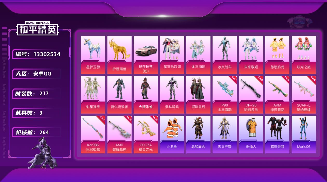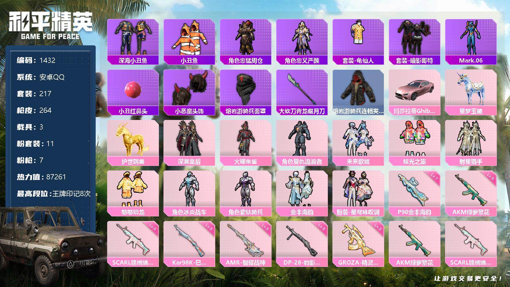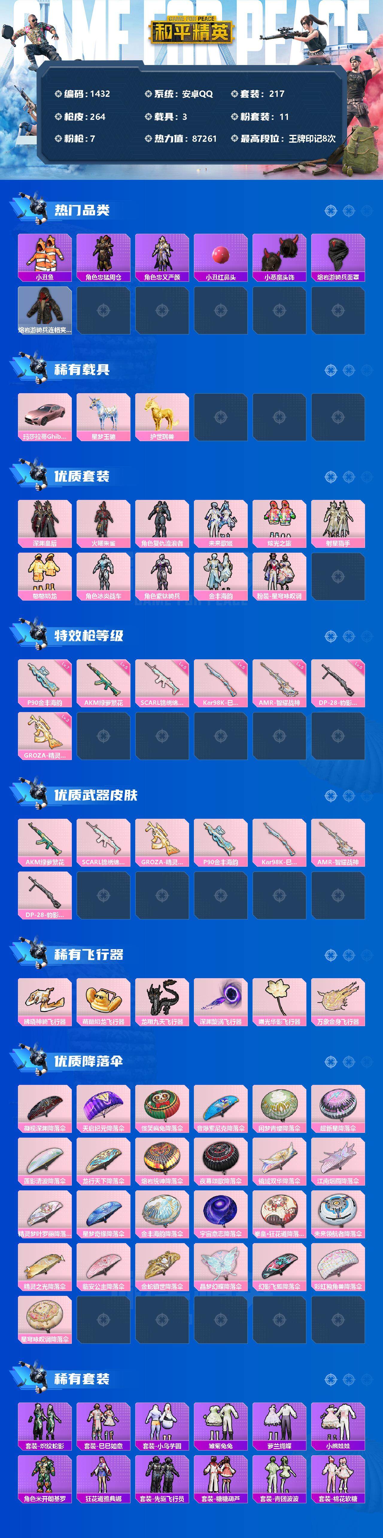[13302534]安卓 手Q-11粉装-7特效枪-3载具-6粉色飞行器-87261热力值-8王牌印记-217套装-264枪皮