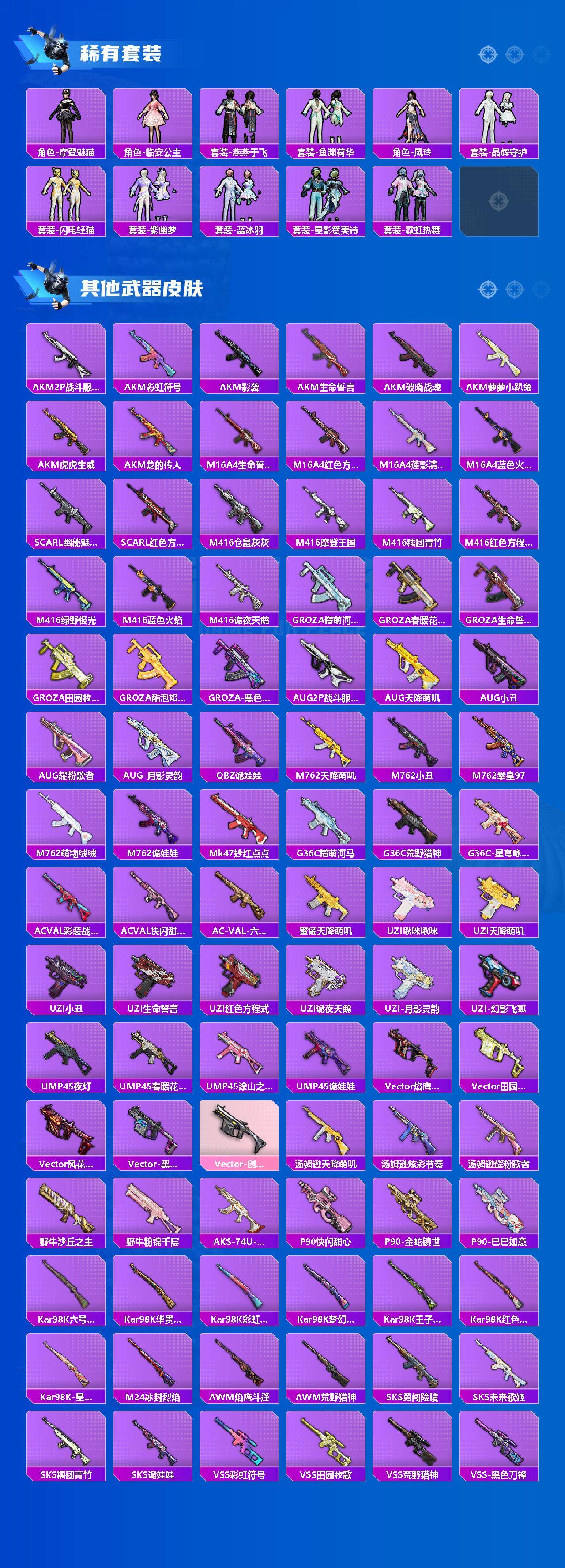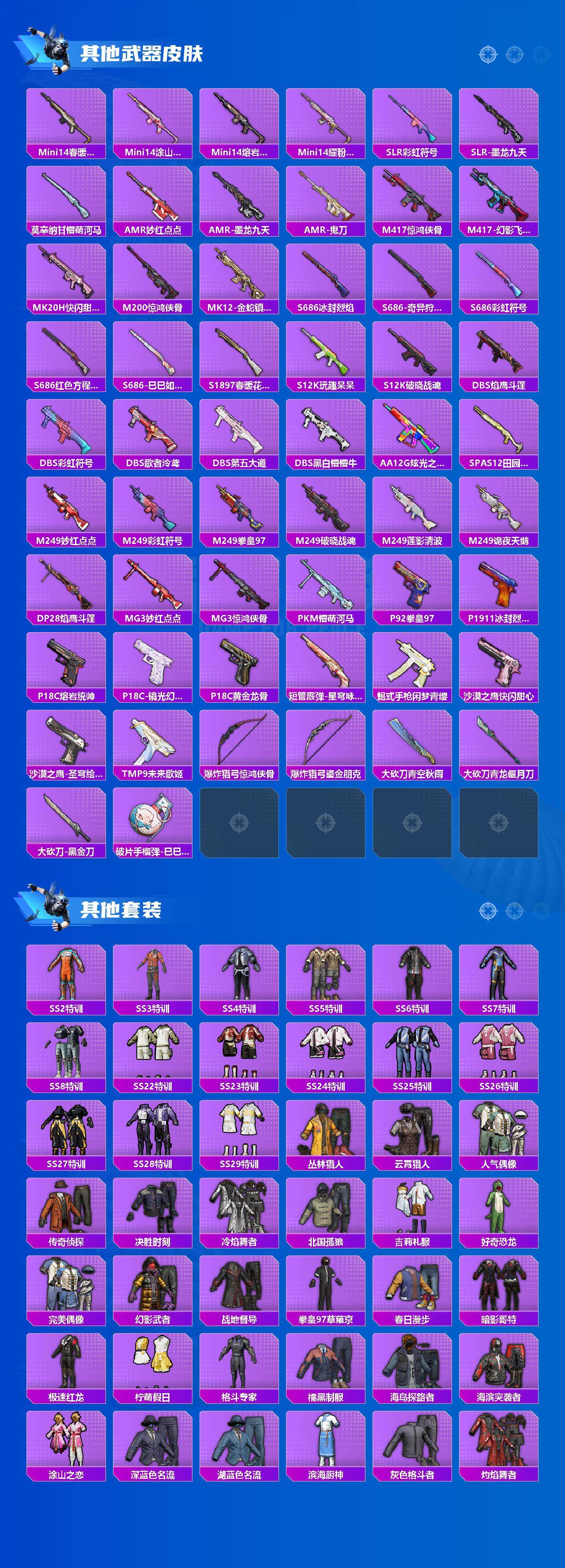 - [13036254]【2】总资产(M):145M/哈夫币(K):62846K/哈夫币(K):62846K/全面战场等级:50_段位:军士长/烽火地带等级:60_段位:黑鹰/红狼-蚀金玫瑰/露娜-黑·天际线/威龙-壮志凌云(S3)/蜂医-送葬人·无题密令(S5)/无名-夜鹰(S4)/深蓝-不破誓约(S6)/近战-黑鹰/K437突击步枪-私人定制/AWM狙击步枪-私人定制(典藏)/R93狙击步枪-常青藤/AKS-74U突击步枪-马赛克涂装/M4A1突击步枪-蚀金玫瑰/M4A1突击步枪-阿米娅/ASh-12战斗步枪-鹅鸭杀/M16A4突击步枪-狩猎时刻/AK-12突击步枪-夜鹰/SCAR-H战斗步枪-铁艺苍穹/G3战斗步枪-狩猎时刻/CAR-15突击步枪-黑鹰坠落/CAR-15突击步枪-阿米娅/腾龙突击步枪-捞点薯条/Vector冲锋枪-狩猎时刻/SMG45冲锋枪-骑士/QCQ171冲锋枪-鹅鸭杀/725双管霰弹枪-送葬人-无题密令/M250通用机枪-骑士之心/QJB201轻机枪-鹅鸭杀/SR-25射手步枪-水墨云图/AWM狙击步枪-捞点薯条/93R-捞点薯条/复合弓-黑-天际线/M4A1突击步枪-竞技风/M4A1突击步枪-特勤执行/AKM突击步枪-林中猎手/QBZ95-1突击步枪-曙光/QBZ95-1突击步枪-ACE/Ash-12战斗步枪-守夜人/M16A4突击步枪-竞赛选手/AUG突击步枪-蝮蛇/AUG突击步枪-特勤执行/M7战斗步枪-禁卫/SG552突击步枪-尖端治疗/SG552突击步枪-深海恐惧/SCAR-H战斗步枪-囚徒/G3战斗步枪-战场英杰/PTR-32突击步枪-ACE/AS Val突击步枪-刀锋/AS Val突击步枪-尖端治疗/AS Val突击步枪-典狱官/腾龙突击步枪-无垢/MP5冲锋枪-深海恐惧/Vector冲锋枪-阿萨拉文明/Vector冲锋枪-红色彗星/SR-3M紧凑突击步枪-英雄/SR-3M紧凑突击步枪-荒野求生/勇士冲锋枪-深海恐惧/MP7冲锋枪-无垢/M1014霰弹枪-林中猎手/S12K霰弹枪-曙光/PKM通用机枪-蝮蛇/PKM通用机枪-守夜人/PKM通用机枪-荒野求生/M250通用机枪-囚徒/SVD狙击步枪-阿萨拉工艺/SVD狙击步枪-暗夜猎手/SVD狙击步枪-荒野求生/M14射手步枪-黑鹰坠落/M14射手步枪-禁卫/SKS射手步枪-ACE/SR-25射手步
