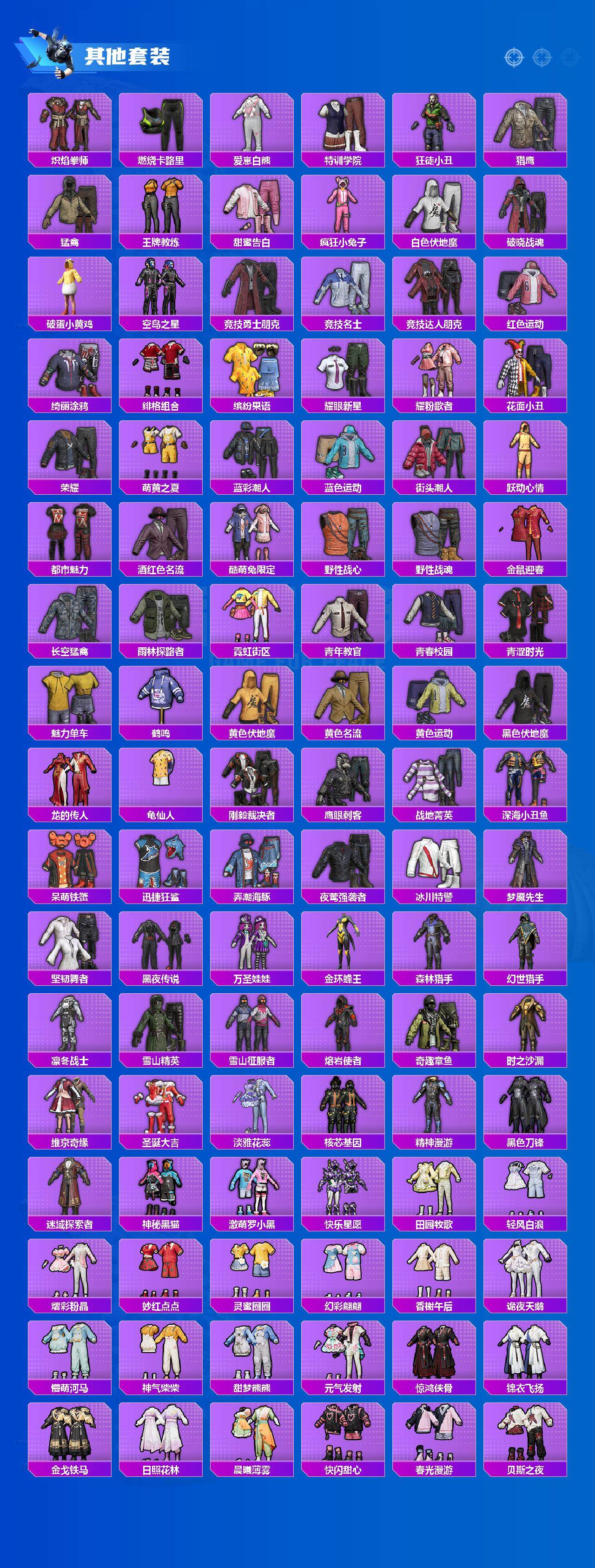 【粉色套装】:粉装-深渊皇后,粉装-火曜朱雀,角色-复仇流浪者,粉装-未来歌姬,粉装-炫光之旅,粉装-射星猎手,粉装-憨憨奶龙,角色-冰炎战车,角色-紫钛骑兵,粉装-金丰海韵,粉装-星穹咏叹调
