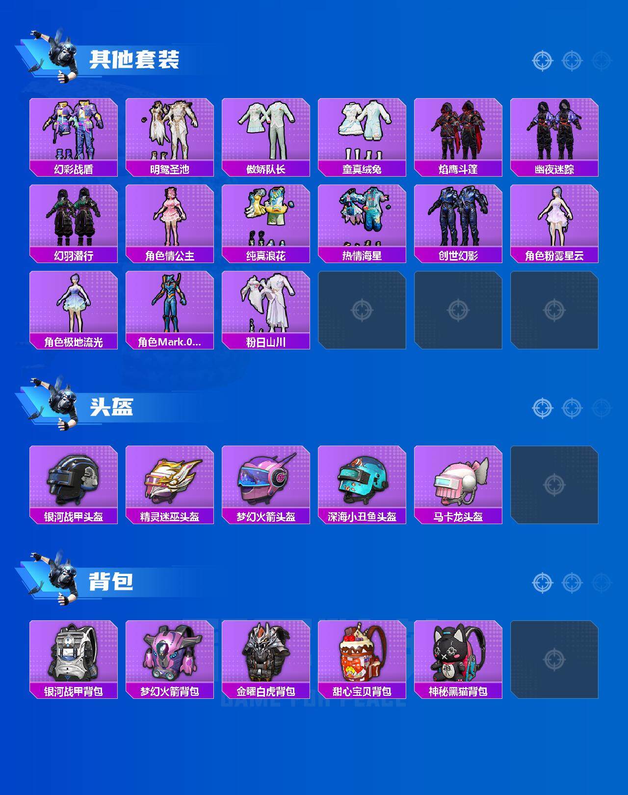 套装-龟仙人,套装-暗影哥特,角色-Mark.06,套装-极速红龙,套装-破蛋小黄鸡,套装-弄潮海豚,套装-雪山精英,套装-黑色刀锋