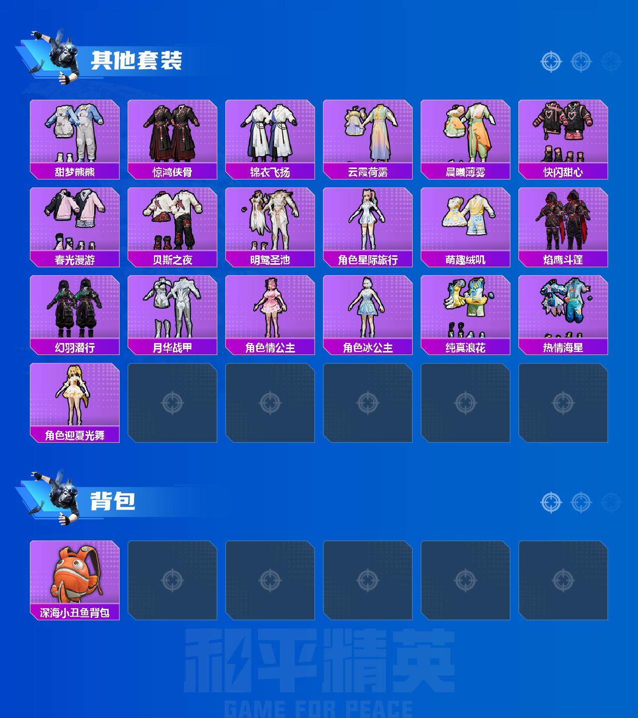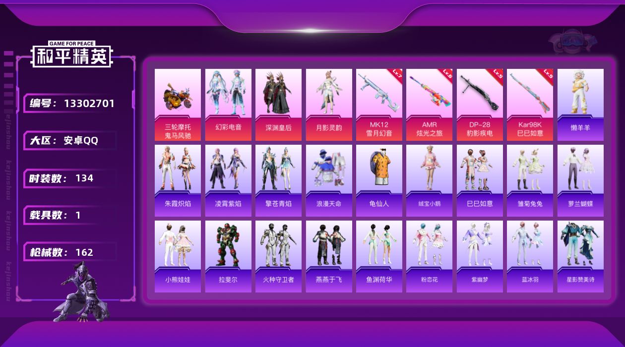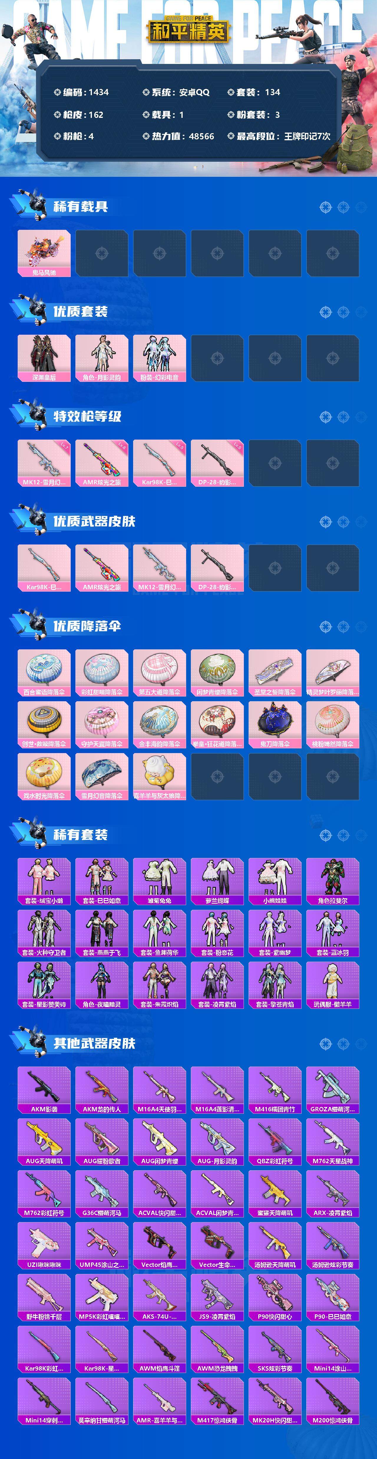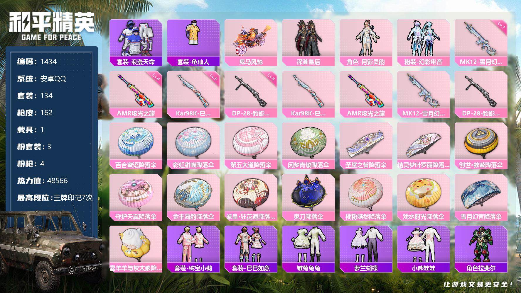 [13302701]安卓 手Q-3粉装-4特效枪-1载具-0粉色飞行器-48566热力值-7王牌印记-134套装-162枪皮 【热门品类】:套装-浪漫天命,套装-龟仙人 【粉色载具】:鬼马风驰 【粉色套装】:粉装-深渊皇后,角色-月影灵韵,粉装-幻彩电音 【粉色枪皮等级】:Kar98K-巳巳如意(五级),AMR-炫光之旅(六级),MK12-雪月幻音(七级),DP-28-豹影疾电(五级) 【粉色枪皮】:Kar98K-巳巳如意,AMR-炫光之旅,MK12-雪月幻音,DP-28-豹影疾电 【粉色降落伞】:百合蜜语降落伞,彩虹甜喵降落伞,第五大道降落伞,闲梦青缨降落伞,圣堂之誓降落伞,精灵梦叶罗丽降落伞,创世·救赎降落伞,守护天翼降落伞,金丰海韵降落伞,拳皇·狂花道降落伞,鬼刀降落伞,桃粉嫣然降落伞,戏水时光降落伞,雪月幻音降落伞,喜羊羊与灰太狼降落伞 【稀有套装】:套装-龟仙人,套装-绒宝小鹅,套装-巳巳如意,套装-雏菊兔兔,套装-萝兰蝴蝶,套装-小熊娃娃,角色-拉斐尔,套装-火种守卫者,套装-燕燕于飞,套装-鱼渊荷华,套装-粉恋花,套装-紫幽梦,套装-蓝冰羽,套装-星影赞美诗,角色-夜瞳黯灵,套装-朱霞炽焰,套装-凌霄紫焰,套装-擎苍青焰,玩偶服-懒羊羊 【稀有枪皮】:AKM-影袭,AKM-龙的传人,M16A4-天使羽翼,M16A4-莲影清波,M416-糯团青竹,GROZA-懵萌河马,AUG-天降萌叽,AUG-耀粉歌者,AUG-闲梦青缨,AUG-月影灵韵,QBZ-彩虹符号,M762-天星战神,M762-彩虹符号,G36C-懵萌河马,AC-VAL-快闪甜心,AC-VAL-闲梦青缨,蜜獾-天降萌叽,ARX-凌霄紫焰,UZI-啾咪啾咪,UMP45-涂山之恋,Vector-焰鹰斗篷,Vector-生命誓言,汤姆逊-天降萌叽,汤姆逊-炫彩节奏,野牛-粉锦千层,MP5K-彩虹嘻嘻猴,AKS-74U-鬼刀,JS9-凌霄紫焰,P90-快闪甜心,P90-巳巳如意,Kar98K-彩虹符号,Kar98K-星穹咏叹调,AWM-焰鹰斗篷,AWM-恐龙拽拽,SKS-炫彩节奏,Mini14-涂山之恋,Mini14-穿刺龙虾,莫辛纳甘-懵萌河马,AMR-喜羊羊与灰太狼,M417-惊鸿侠骨,MK20-H-快闪甜心,M200-惊鸿侠骨,S686-奇异狩猎者,S686-彩虹符号,S686-生命誓言,S686-巳巳如意,S18