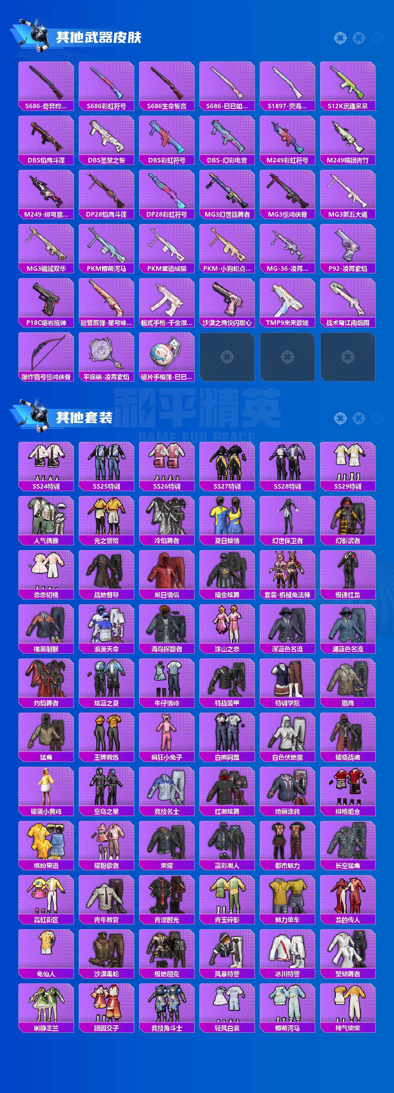 【稀有枪皮】:AKM-影袭,AKM-龙的传人,M16A4-天使羽翼,M16A4-莲影清波,M416-糯团青竹,GROZA-懵萌河马,AUG-天降萌叽,AUG-耀粉歌者,AUG-闲梦青缨,AUG-月影灵韵,QBZ-彩虹符号,M762-天星战神,M762-彩虹符号,G36C-懵萌河马,AC-VAL-快闪甜心,AC-VAL-闲梦青缨,蜜獾-天降萌叽,ARX-凌霄紫焰,UZI-啾咪啾咪,UMP45-涂山之恋,Vector-焰鹰斗篷,Vector-生命誓言,汤姆逊-天降萌叽,汤姆逊-炫彩节奏,野牛-粉锦千层,MP5K-彩虹嘻嘻猴,AKS-74U-鬼刀,JS9-凌霄紫焰,P90-快闪甜心,P90-巳巳如意,Kar98K-彩虹符号,Kar98K-星穹咏叹调,AWM-焰鹰斗篷,AWM-恐龙拽拽,SKS-炫彩节奏,Mini14-涂山之恋,Mini14-穿刺龙虾,莫辛纳甘-懵萌河马,AMR-喜羊羊与灰太狼,M417-惊鸿侠骨,MK20-H-快闪甜心,M200-惊鸿侠骨,S686-奇异狩猎者,S686-彩虹符号,S686-生命誓言,S686-巳巳如意,S18