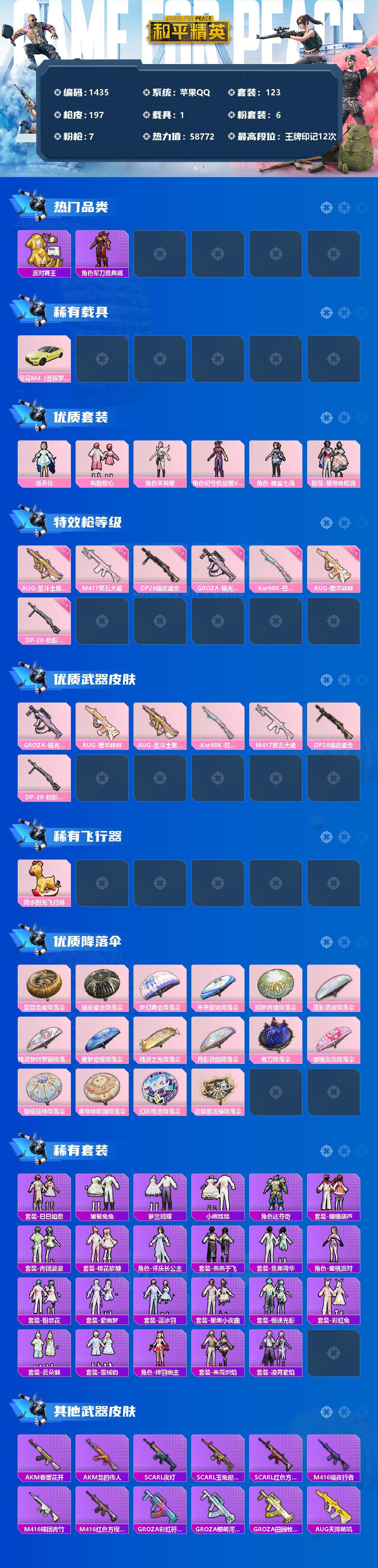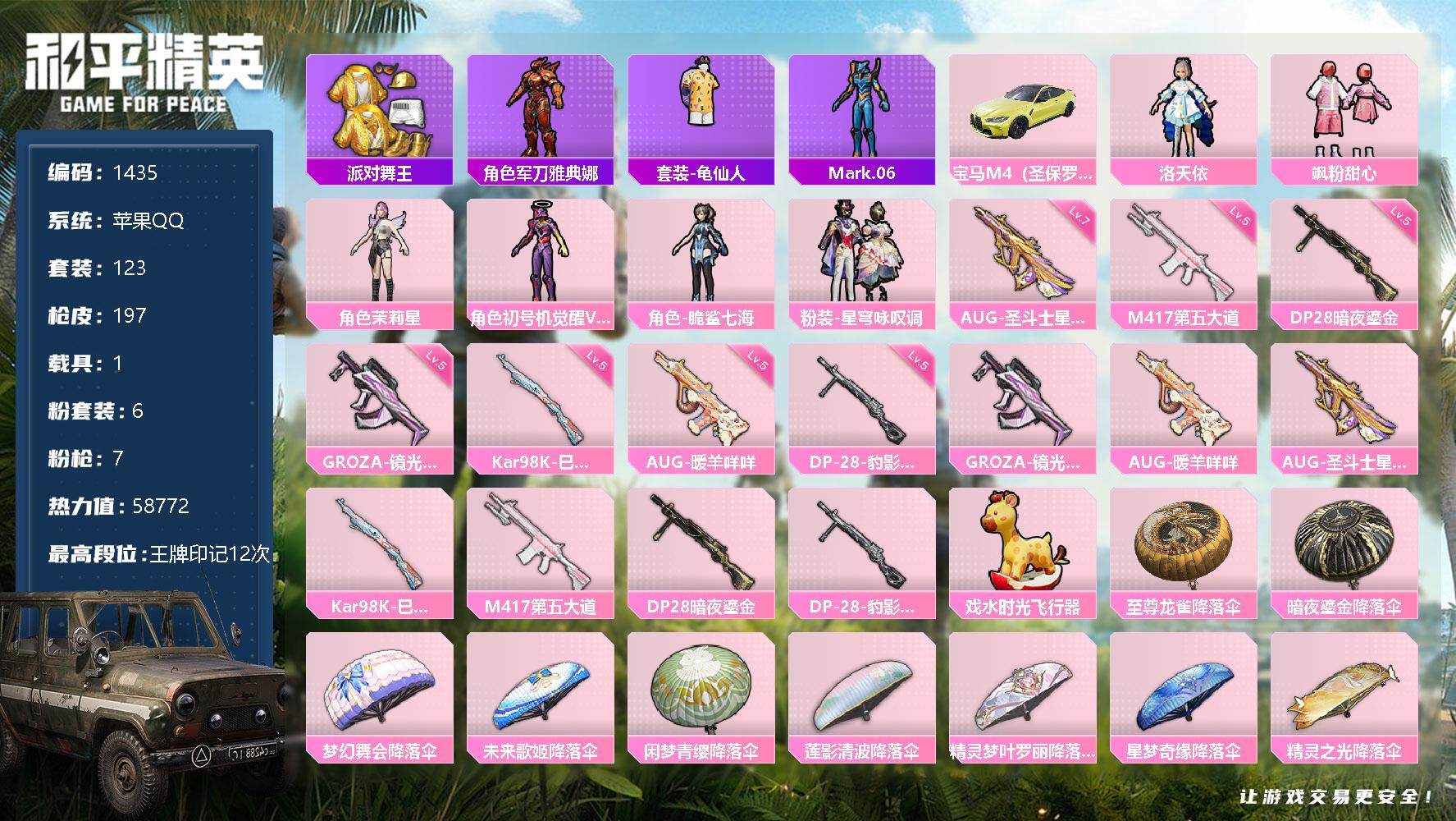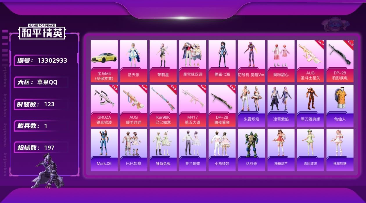 [13302933]苹果 手Q-6粉装-7特效枪-1载具-1粉色飞行器-58772热力值-12王牌印记-123套装-197枪皮