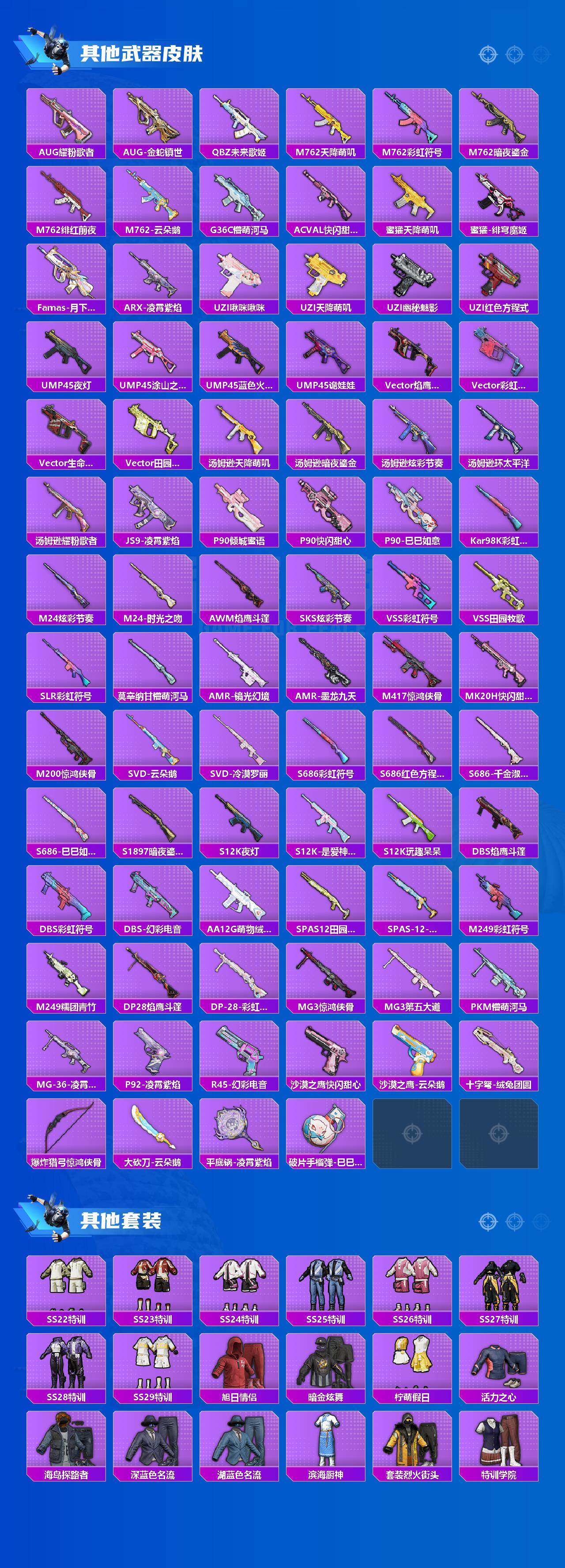 【粉色枪皮】:GROZA-镜光银凌,AUG-暖羊咩咩,AUG-圣斗士星矢,Kar98K-巳巳如意,M417-第五大道,DP-28-暗夜鎏金,DP-28-豹影疾电