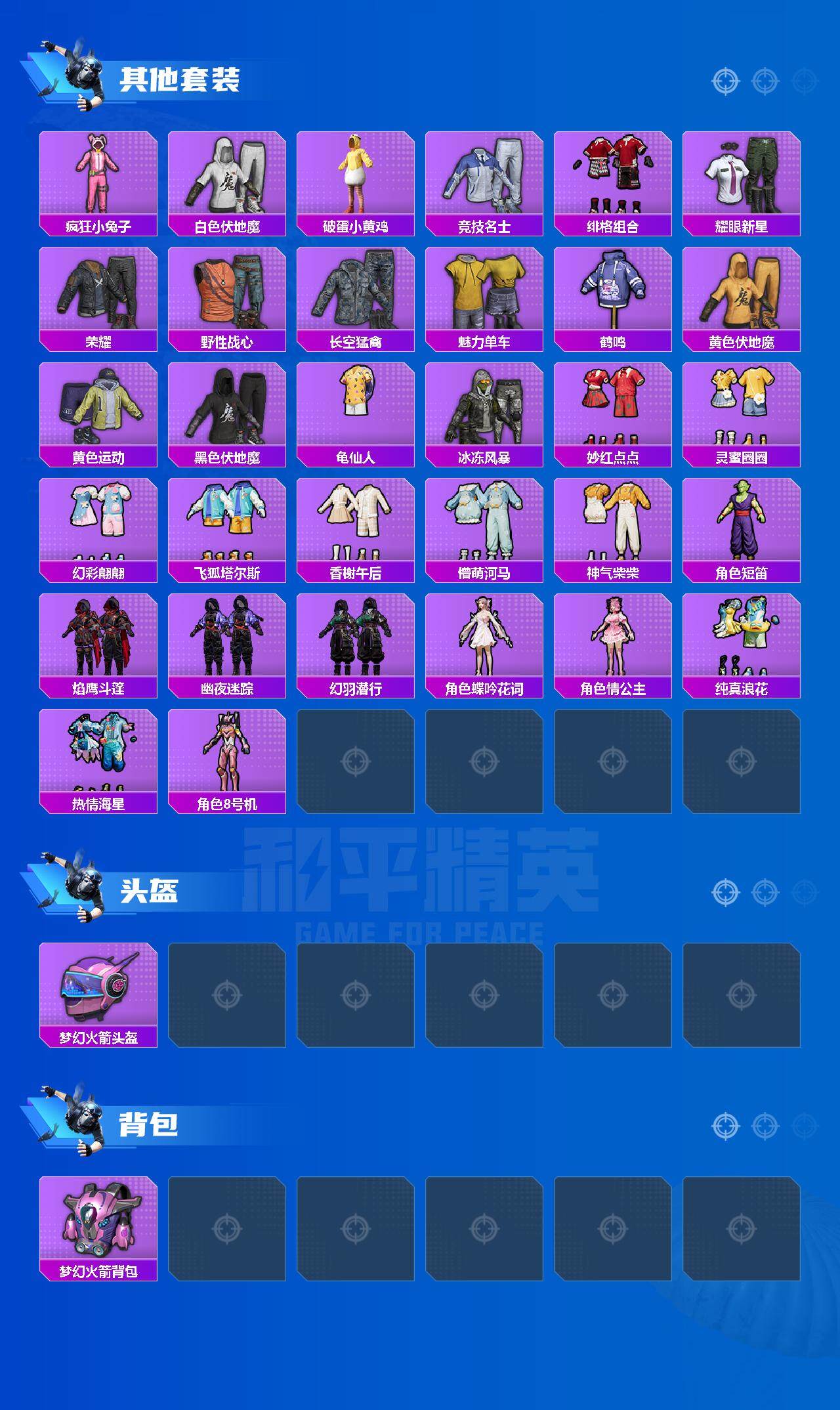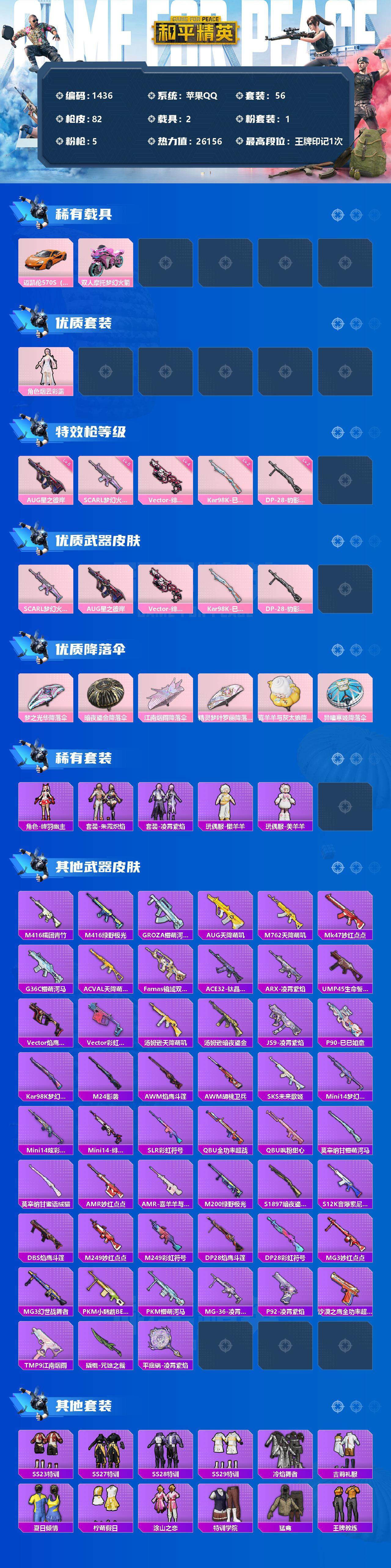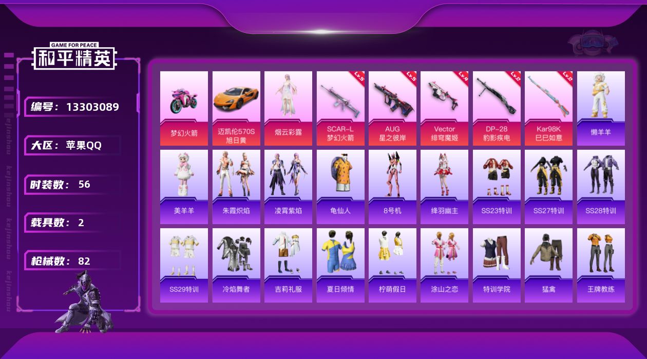 [13303089]苹果 手Q-1粉装-5特效枪-2载具-0粉色飞行器-26156热力值-1王牌印记-56套装-82枪皮 【热门品类】:套装-龟仙人,角色-8号机 【粉色载具】:迈凯伦570S(旭日黄),双人摩托-梦幻火箭 【粉色套装】:角色-烟云彩露 【粉色枪皮等级】:SCAR-L-梦幻火箭(五级),AUG-星之彼岸(五级),Vector-绯穹魔姬(四级),Kar98K-巳巳如意(二级),DP-28-豹影疾电(二级) 【粉色枪皮】:SCAR-L-梦幻火箭,AUG-星之彼岸,Vector-绯穹魔姬,Kar98K-巳巳如意,DP-28-豹影疾电 【粉色降落伞】:梦之光华降落伞,暗夜鎏金降落伞,江南烟雨降落伞,精灵梦叶罗丽降落伞,喜羊羊与灰太狼降落伞,异瞳寒姬降落伞 【稀有套装】:套装-龟仙人,角色-绛羽幽主,套装-朱霞炽焰,套装-凌霄紫焰,玩偶服-懒羊羊,玩偶服-美羊羊 【稀有枪皮】:M416-糯团青竹,M416-绿野极光,GROZA-懵萌河马,AUG-天降萌叽,M762-天降萌叽,Mk47-妙红点点,G36C-懵萌河马,AC-VAL-天降萌叽,Famas-镜域双华,ACE32-钛晶裂爪,ARX-凌霄紫焰,UMP45-生命誓言,Vector-焰鹰斗篷,Vector-彩虹符号,汤姆逊-天降萌叽,汤姆逊-暗夜鎏金,JS9-凌霄紫焰,P90-巳巳如意,Kar98K-梦幻火箭,M24-影袭,AWM-焰鹰斗篷,AWM-胡桃卫兵,SKS-未来歌姬,Mini14-梦幻火箭,Mini14-炫彩节奏,Mini14-绯穹魔姬,SLR-彩虹符号,QBU-全功率超战,QBU-飒粉甜心,莫辛纳甘-懵萌河马,莫辛纳甘-蜜语绒猫,AMR-妙红点点,AMR-喜羊羊与灰太狼,M200-绿野极光,S1897-暗夜鎏金,S12K-音爆索尼克,DBS-焰鹰斗篷,M249-妙红点点,M249-彩虹符号,DP-28-焰鹰斗篷,DP-28-彩虹符号,MG3-妙红点点,MG3-幻世战舞者,PKM-小鹦鹉BEBE,PKM-懵萌河马,MG-36-凌霄紫焰,P92-凌霄紫焰,沙漠之鹰-全功率超战,TMP-9-江南烟雨,撬棍-咒蚀之裁,平底锅-凌霄紫焰 【其他套装】:套装-SS23特训,套装-SS27特训,套装-SS28特训,套装-SS29特训,套装-冷焰舞者,套装-吉莉礼服,套装-夏日倾情,套装-柠萌假日,套装-涂山之恋,套装-特训学院,