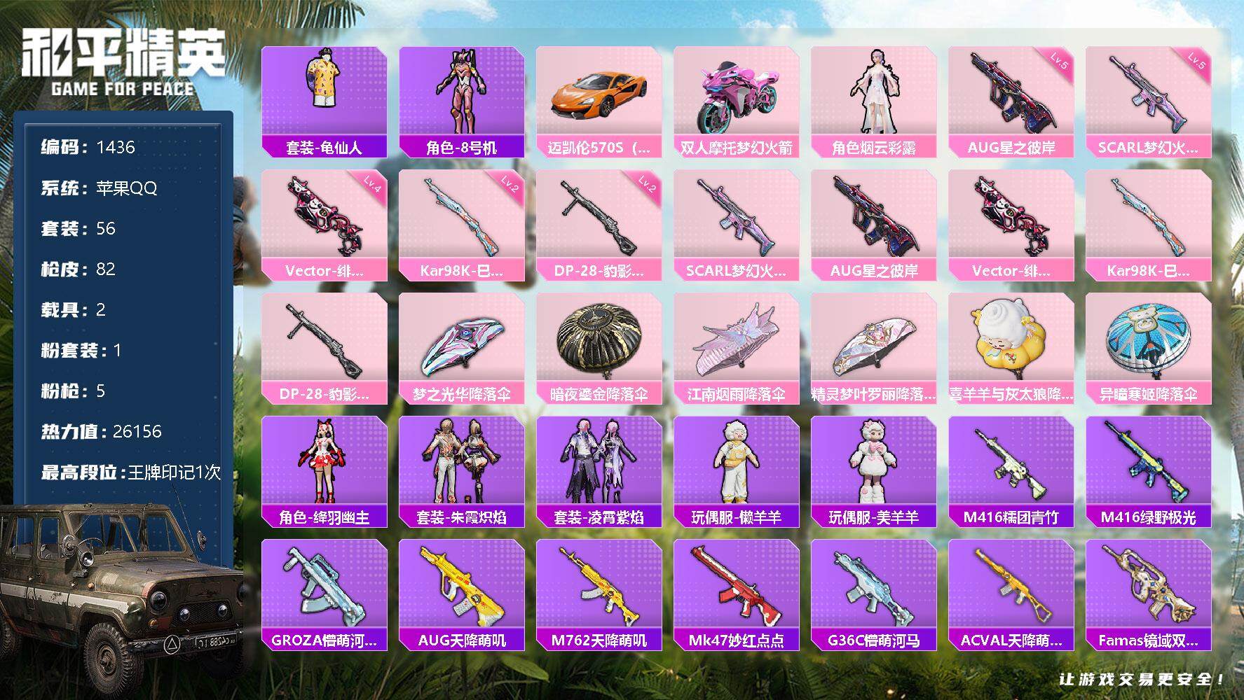 [13303089]苹果 手Q-1粉装-5特效枪-2载具-0粉色飞行器-26156热力值-1王牌印记-56套装-82枪皮