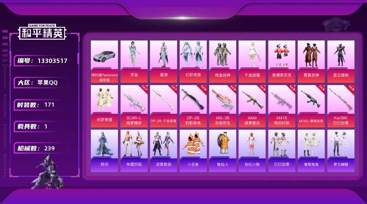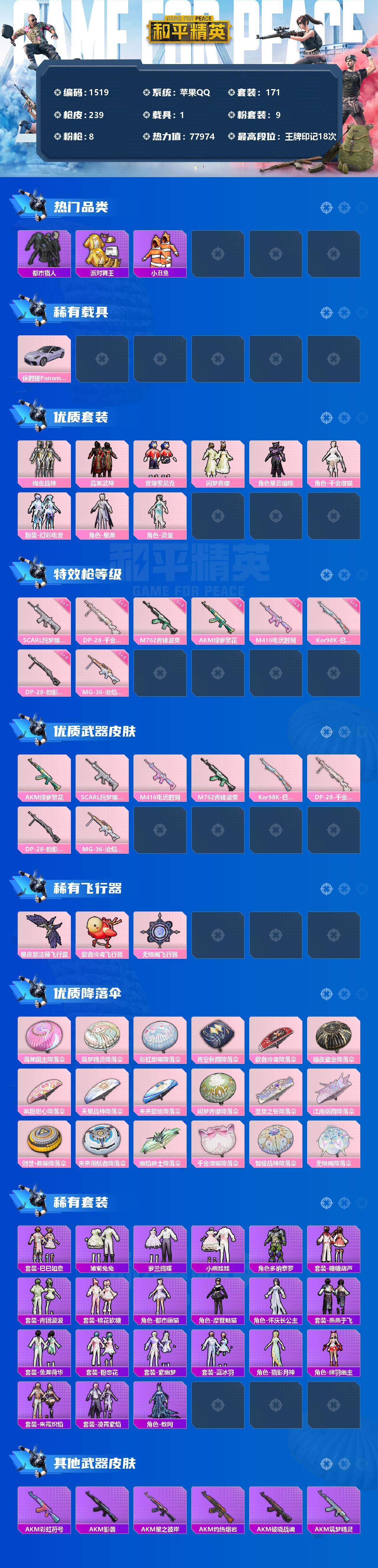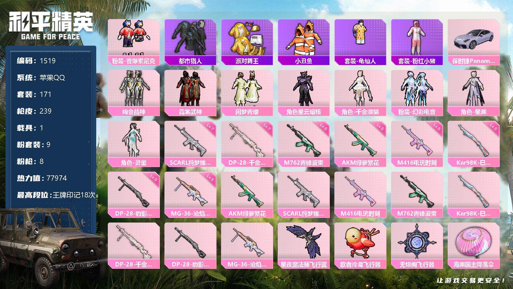 [13303517]苹果 手Q-9粉装-8特效枪-1载具-3粉色飞行器-77974热力值-18王牌印记-171套装-239枪皮 【热门品类】:粉装-音爆索尼克,套装-都市猎人,套装-派对舞王,套装-小丑鱼,套装-龟仙人,套装-粉红小猪 【粉色载具】:保时捷Panamera(星辰紫) 【粉色套装】:粉装-绚金战神,粉装-霓裳武神,粉装-音爆索尼克,粉装-闲梦青缨,角色-星云暗核,角色-千金淑猫,粉装-幻彩电音,角色-星渊,角色-灵玺 【粉色枪皮等级】:AKM-绿萝繁花(五级),SCAR-L-纯梦嫁纱(七级),M416-电玩时刻(五级),M762-青锋波束(五级),Kar98K-巳巳如意(五级),DP-28-千金淑猫(七级),DP-28-豹影疾电(五级),MG-36-沧焰双生(五级) 【粉色枪皮】:AKM-绿萝繁花,SCAR-L-纯梦嫁纱,M416-电玩时刻,M762-青锋波束,Kar98K-巳巳如意,DP-28-千金淑猫,DP-28-豹影疾电,MG-36-沧焰双生 【粉色飞行器】:星夜魔法师飞行翼,歌者泠鸢飞行器,无垠阁飞行器 【粉色降落伞】:海渊国主降落伞,筑梦精灵降落伞,彩虹甜喵降落伞,青空秋雨降落伞,歌者泠鸢降落伞,暗夜鎏金降落伞,飒粉甜心降落伞,天星战神降落伞,未来歌姬降落伞,闲梦青缨降落伞,圣堂之誓降落伞,江南烟雨降落伞,创世·救赎降落伞,未来领航者降落伞,幽焰骑士降落伞,千金淑猫降落伞,智耀战神降落伞,无垠阁降落伞 【稀有套装】:套装-龟仙人,套装-巳巳如意,套装-雏菊兔兔,套装-萝兰蝴蝶,套装-小熊娃娃,角色-多纳泰罗,套装-糖糖葫芦,套装-青团波波,套装-棉花软糖,角色-都市丽猫,角色-摩登魅猫,角色-怀庆长公主,套装-燕燕于飞,套装-鱼渊荷华,套装-粉恋花,套装-紫幽梦,套装-蓝冰羽,角色-猎影月神,角色-绛羽幽主,套装-朱霞炽焰,套装-凌霄紫焰,角色-敖闰 【稀有枪皮】:AKM-彩虹符号,AKM-影袭,AKM-星之彼岸,AKM-灼热熔岩,AKM-破晓战魂,AKM-筑梦精灵,AKM-虎虎生威,AKM-霓虹街区,AKM-龙的传人,M16A4-幻世战舞者,M16A4-甜心亚梦,M16A4-莲影清波,M16A4-千金淑猫,SCAR-L-玉兔迎春,SCAR-L-红色方程式,SCAR-L-黄金龙骨,M416-糯团青竹,M416-红色方程式,M416-绯红前夜,M416-蓝色火焰