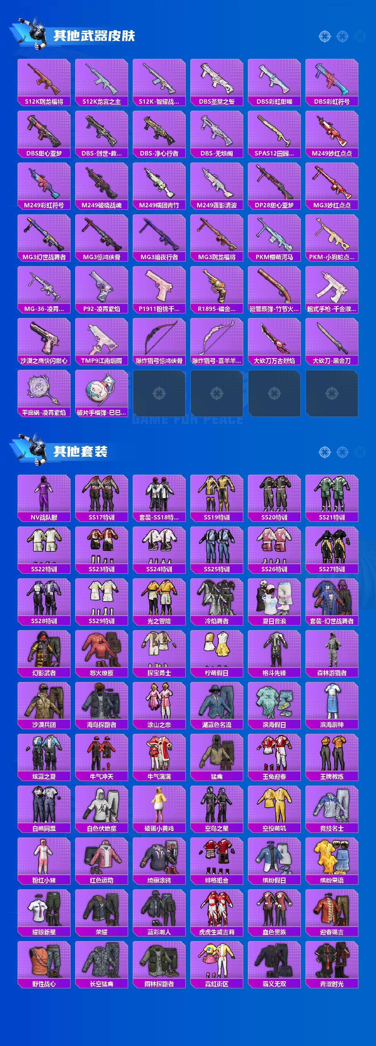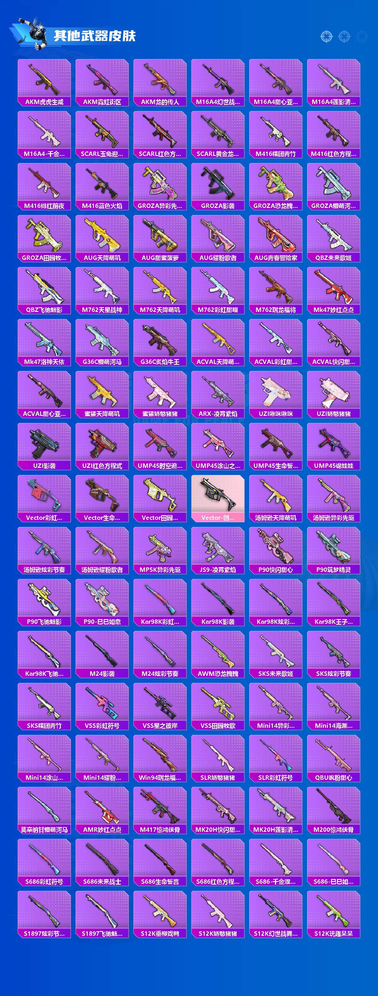 【稀有枪皮】:AKM-彩虹符号,AKM-影袭,AKM-星之彼岸,AKM-灼热熔岩,AKM-破晓战魂,AKM-筑梦精灵,AKM-虎虎生威,AKM-霓虹街区,AKM-龙的传人,M16A4-幻世战舞者,M16A4-甜心亚梦,M16A4-莲影清波,M16A4-千金淑猫,SCAR-L-玉兔迎春,SCAR-L-红色方程式,SCAR-L-黄金龙骨,M416-糯团青竹,M416-红色方程式,M416-绯红前夜,M416-蓝色火焰