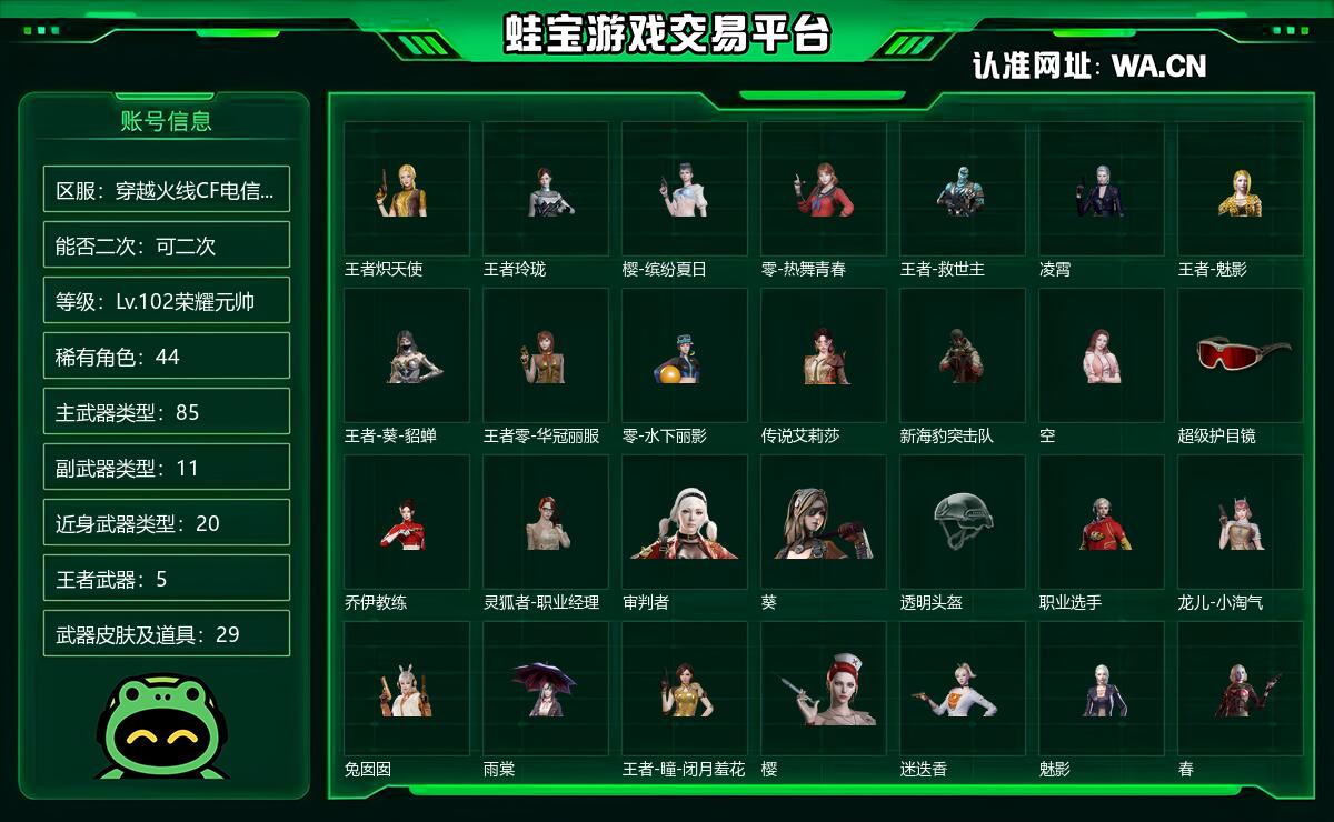 穿越火线CF电信区 可二次 当前段位Lv.102荣耀元帅 点券7529 稀有角色44 主武器类型85 副武器类型11 近身武器类型20 王者武器5 武器皮肤及道具29 其他1538