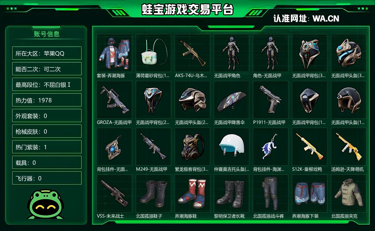 苹果QQ 可二次 当前段位不屈白银Ⅰ 历史最高段位不屈白银Ⅰ 热力值1978 等级19 套装3 王牌次数0 点券0 外观套装0 枪械皮肤0 热门紫装1 载具0 飞行器0 稀有0 头盔0 背包0