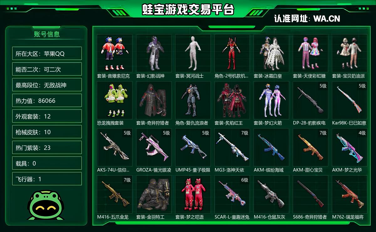 苹果QQ 可二次 当前段位卓越王牌12星 历史最高段位无敌战神 热力值86066 等级70 套装195 王牌次数16 点券1 外观套装12 枪械皮肤10 热门紫装23 载具0 飞行器1 稀有0 头盔4 背包4