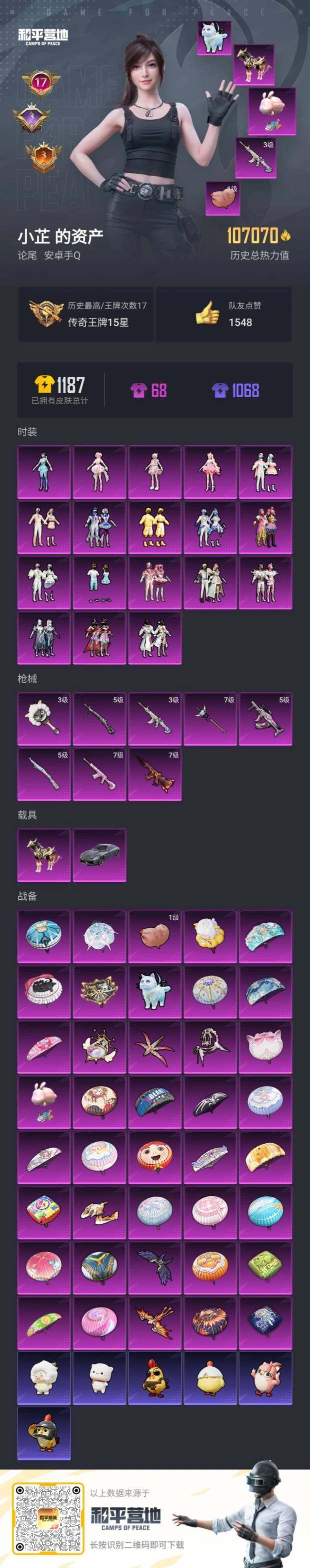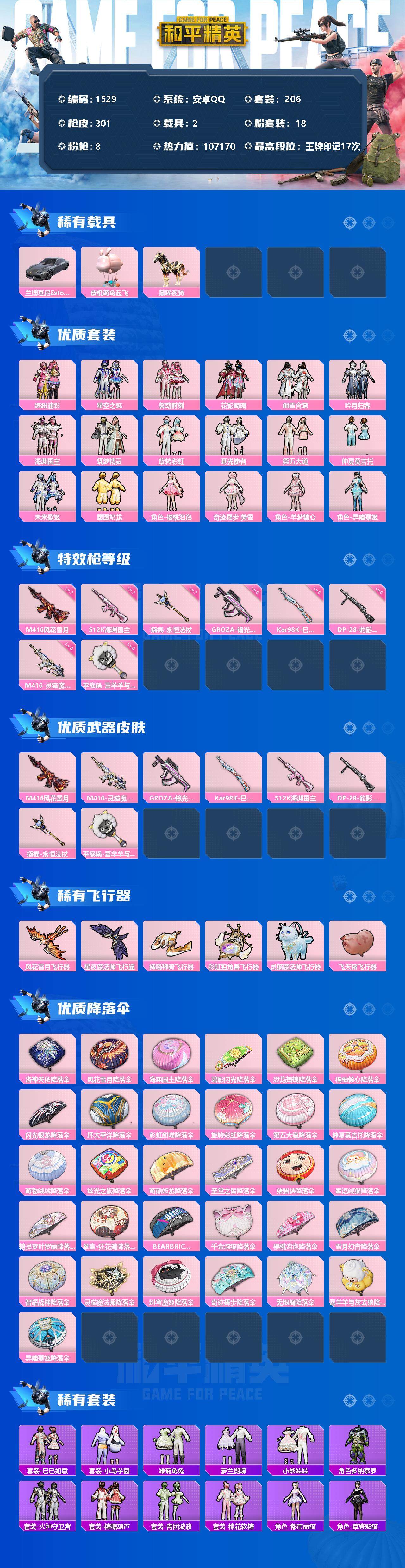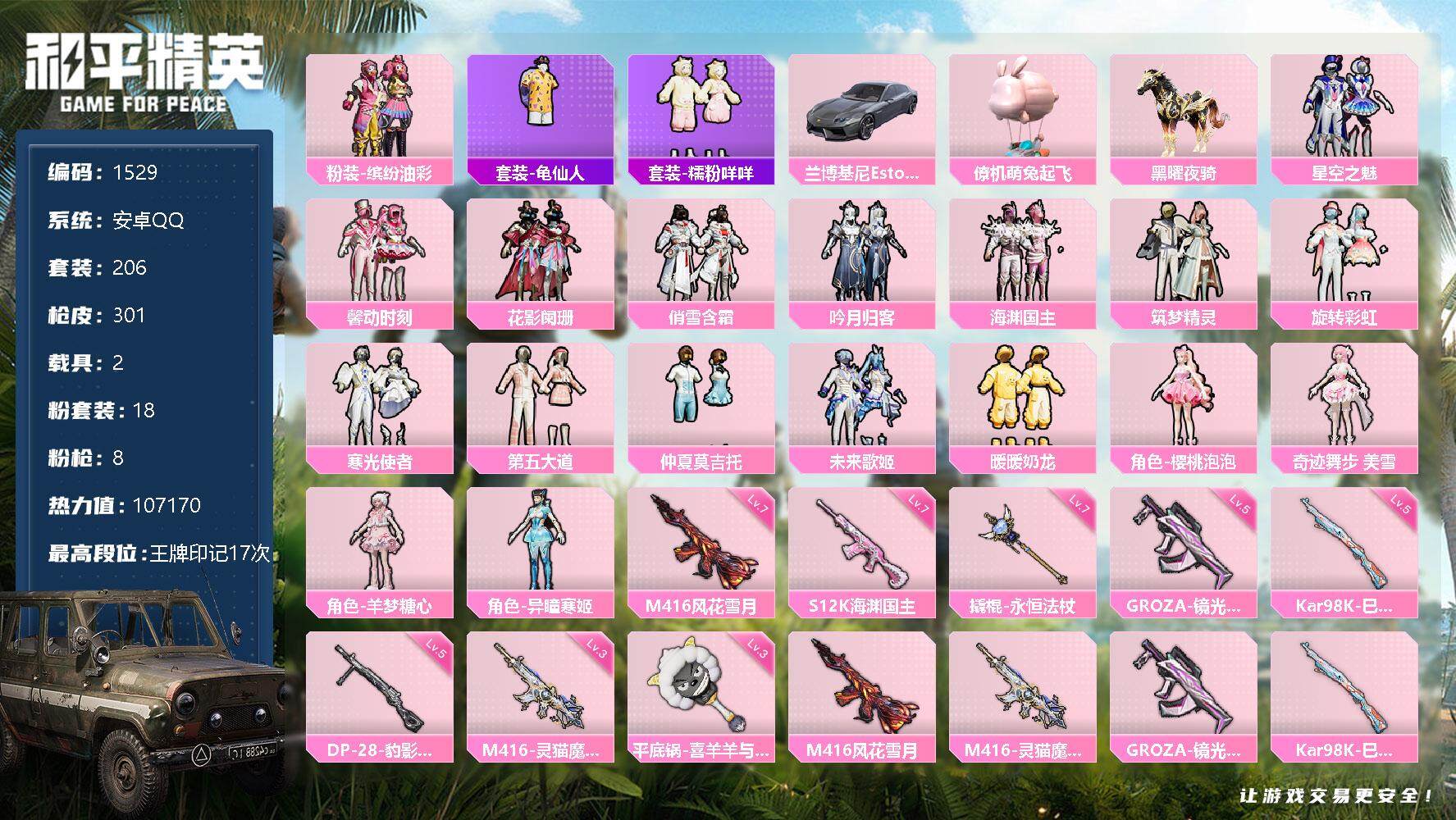 [13461637]安卓 手Q-18粉装-8特效枪-2载具-8粉色飞行器-107170热力值-17王牌印记-206套装-301枪皮