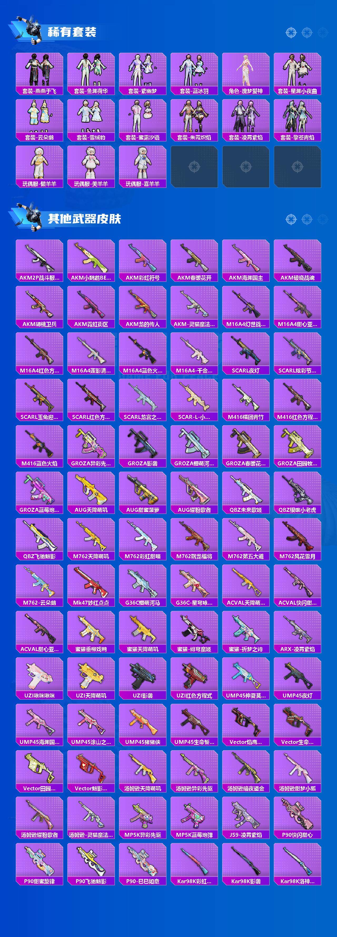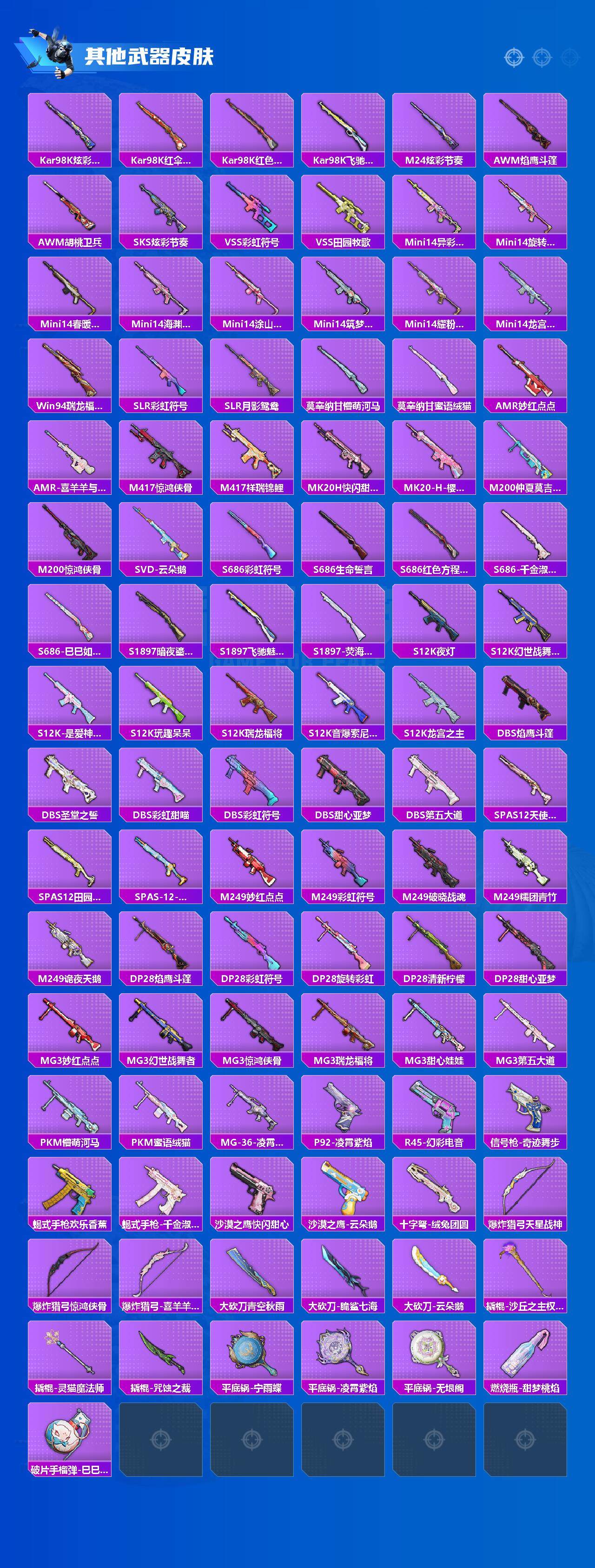 【粉色枪皮】:M416-风花雪月,M416-灵猫魔法师,GROZA-镜光银凌,Kar98K-巳巳如意,S12K-海渊国主,DP-28-豹影疾电,撬棍-永恒法杖,平底锅-喜羊羊与灰太狼