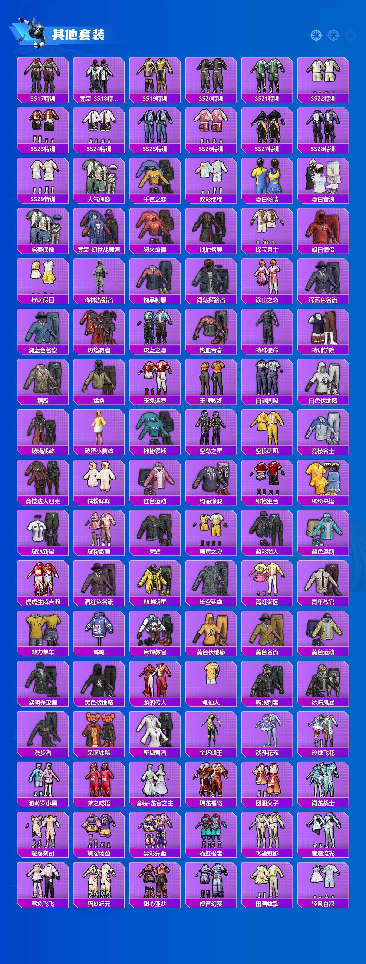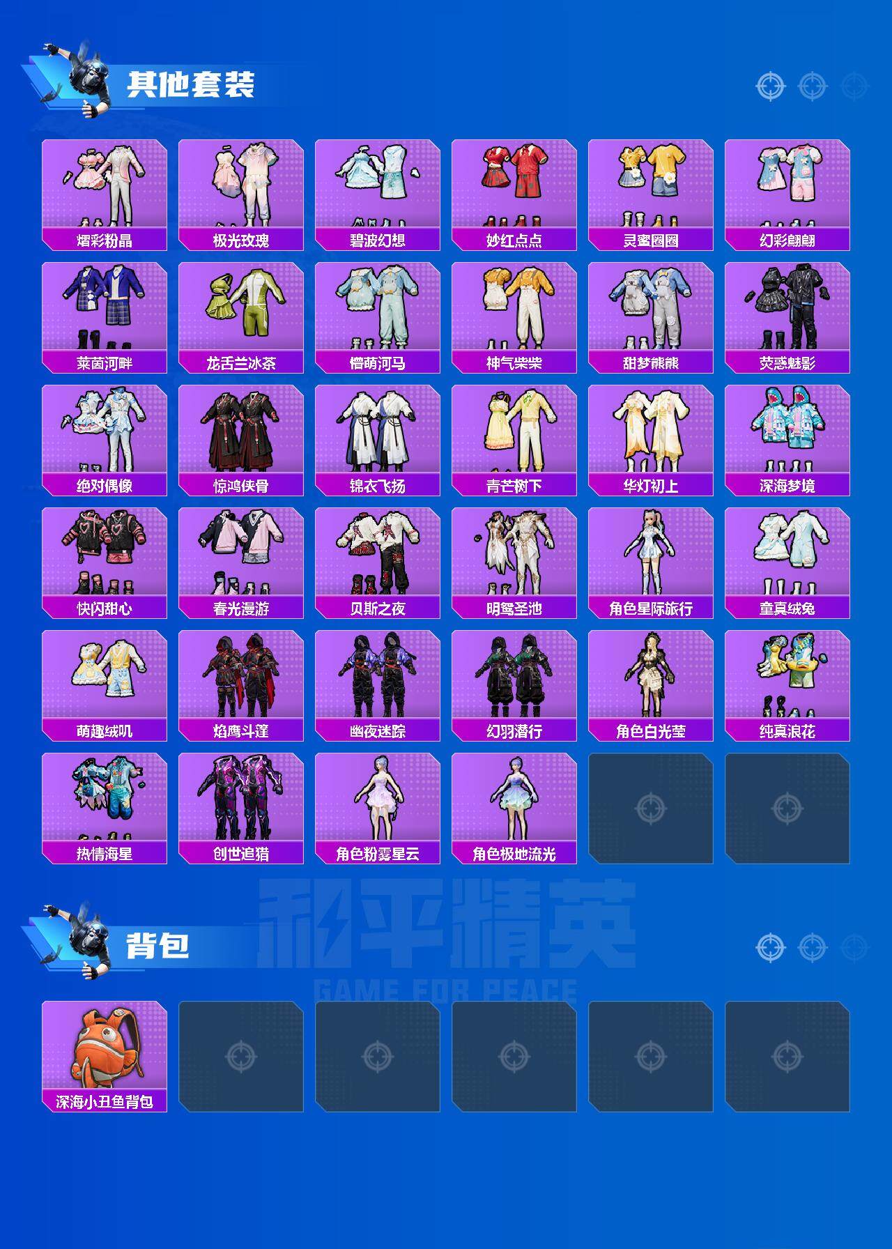套装-星空之魅,套装-寒光使者,套装-筑梦精灵,套装-俏雪含霜,套装-吟月归客,套装-旋转彩虹,套装-未来歌姬,套装-馨动时刻,套装-花影阑珊,套装-暖暖奶龙,套装-仲夏莫吉托,套装-第五大道,套装-海渊国主,套装-缤纷油彩,角色-樱桃泡泡