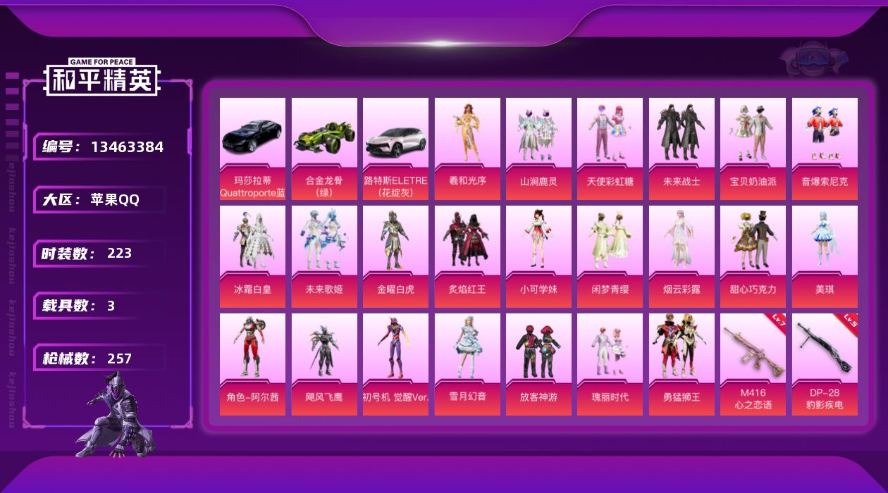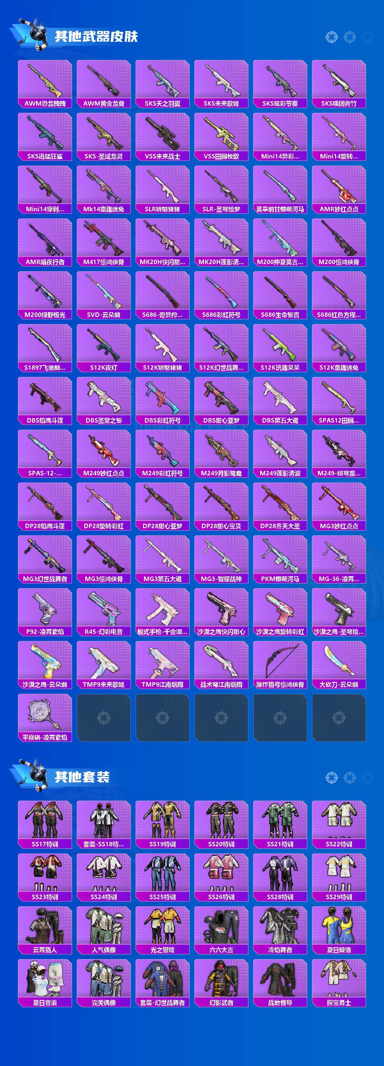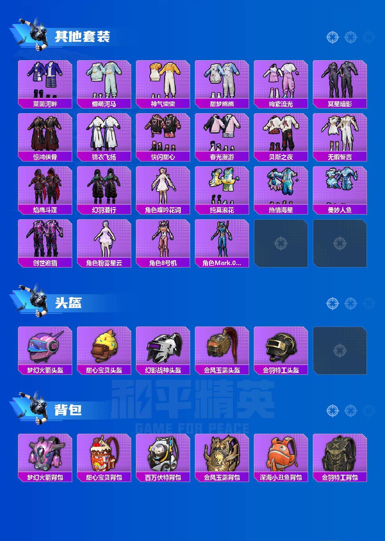 [13463384]苹果 手Q-22粉装-7特效枪-3载具-7粉色飞行器-96983热力值-18王牌印记-223套装-257枪皮 【热门品类】:粉装-音爆索尼克,套装-浪漫天命,套装-都市猎人,套装-奇异狩猎者,套装-龟仙人,套装-红红火火,角色-8号机,角色-Mark.06 【粉色载具】:路特斯ELETRE(花绽灰),玛莎拉蒂Quattroporte(夜幕蓝),合金龙骨(绿) 【粉色套装】:粉装-未来战士,粉装-甜心巧克力,粉装-宝贝奶油派,粉装-天使彩虹糖,粉装-金曜白虎,粉装-放客神游,粉装-冰霜白皇,粉装-炙焰红王,粉装-飓风飞鹰,粉装-山涧鹿灵,粉装-音爆索尼克,粉装-瑰丽时代,角色-小可学妹,粉装-未来歌姬,角色-阿尔茜,粉装-闲梦青缨,粉装-勇猛狮王,角色-烟云彩露,角色-美琪,角色-初号机 觉醒Ver.,角色-羲和光序,粉装-雪月幻音 【粉色枪皮等级】:AKM-绿萝繁花(五级),SCAR-L-锦绣绵绵(五级),M416-五爪金龙(四级),M416-心之恋语(七级),汤姆逊-热量炸弹(五级),Kar98K-巳巳如意(五级),DP-28-豹影疾电(五级) 【粉色枪皮】:AKM-绿萝繁花,SCAR-L-锦绣绵绵,M416-五爪金龙,M416-心之恋语,汤姆逊-热量炸弹,Kar98K-巳巳如意,DP-28-豹影疾电 【粉色飞行器】:庄周梦蝶飞行器,黄族统领飞行器,拂晓神骑飞行器,镜光幻境飞行翼,赛博古神飞行器,时光之吻飞行器 【粉色降落伞】:极限特训降落伞,未来战士降落伞,甜心宝贝降落伞,神秘黑猫降落伞,童趣迷兔降落伞,古战神甲降落伞,恐龙拽拽降落伞,垂柳戏鸭降落伞,太空嘟嘟降落伞,旋转彩虹降落伞,歌者泠鸢降落伞,天星战神降落伞,未来歌姬降落伞,拂晓神骑降落伞,闲梦青缨降落伞,镜光幻境降落伞,江南烟雨降落伞,精灵梦叶罗丽降落伞,初号机 觉醒Ver.降落伞,忍者神龟降落伞,未来领航者降落伞,鬼刀降落伞,智耀战神降落伞,幻彩电音降落伞,冷漠罗丽降落伞,无垠阁降落伞 【稀有套装】:套装-龟仙人,套装-圣穹绘梦,套装-雏菊兔兔,套装-萝兰蝴蝶,套装-小熊娃娃,角色-米开朗基罗,套装-糖糖葫芦,套装-青团波波,套装-棉花软糖,角色-摩登魅猫,套装-燕燕于飞,套装-鱼渊荷华,角色-风玲,玩偶服-小狗蛇点点,套装-风舞幻音,套装-粉恋花,套装-紫幽梦,套装-蓝冰羽,套装-极速光影,套装-彩