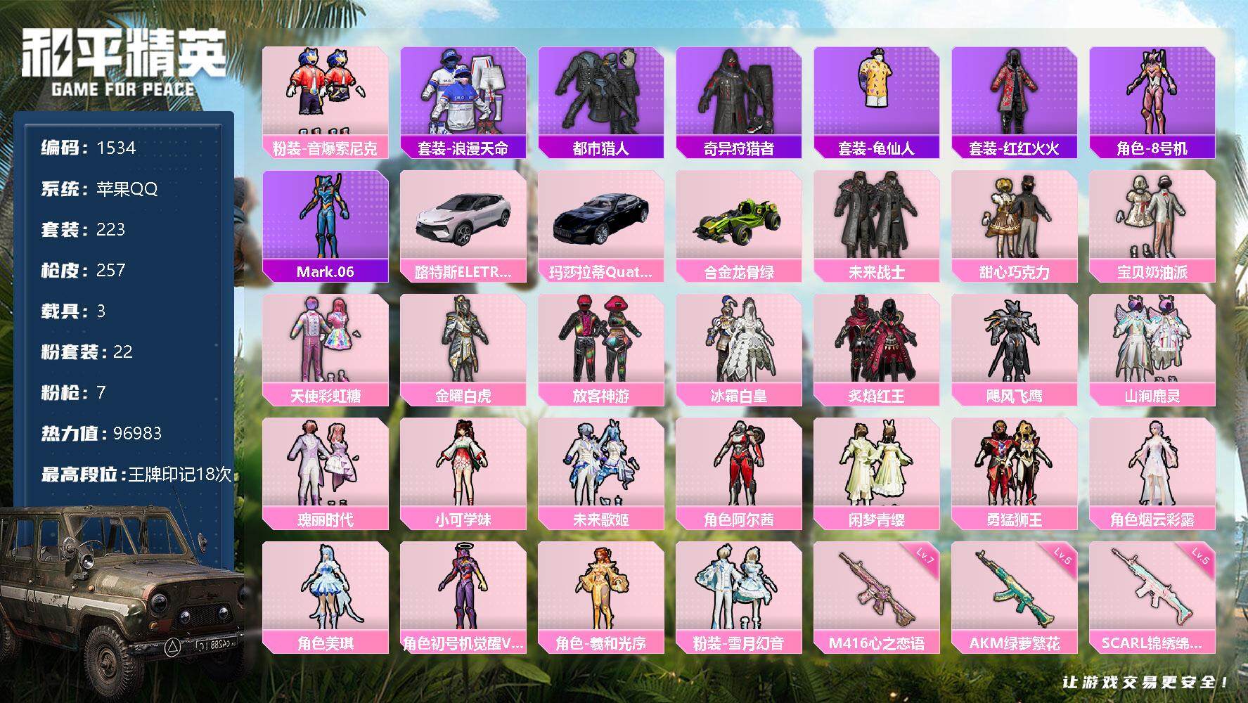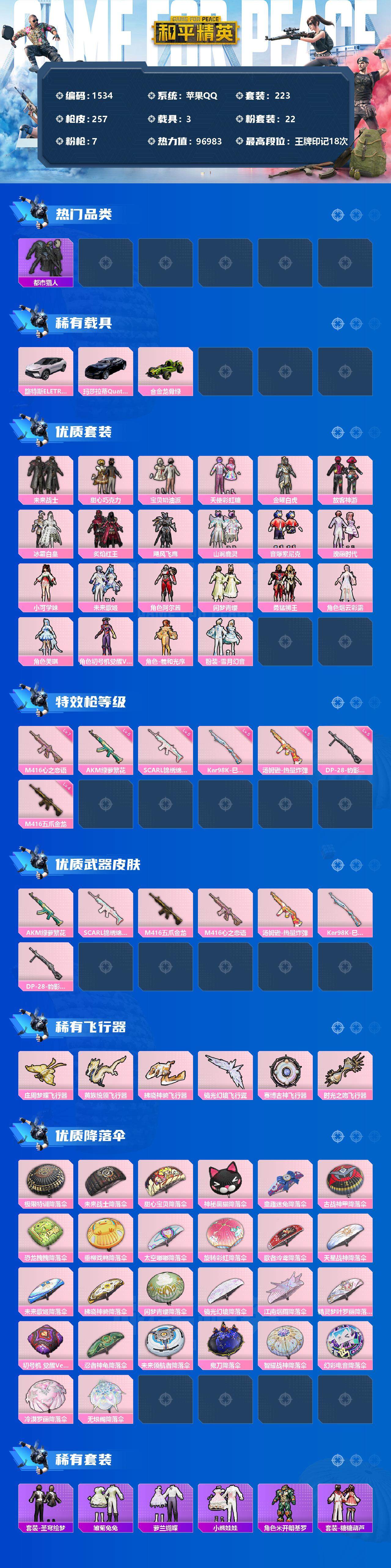 [13463384]苹果 手Q-22粉装-7特效枪-3载具-7粉色飞行器-96983热力值-18王牌印记-223套装-257枪皮