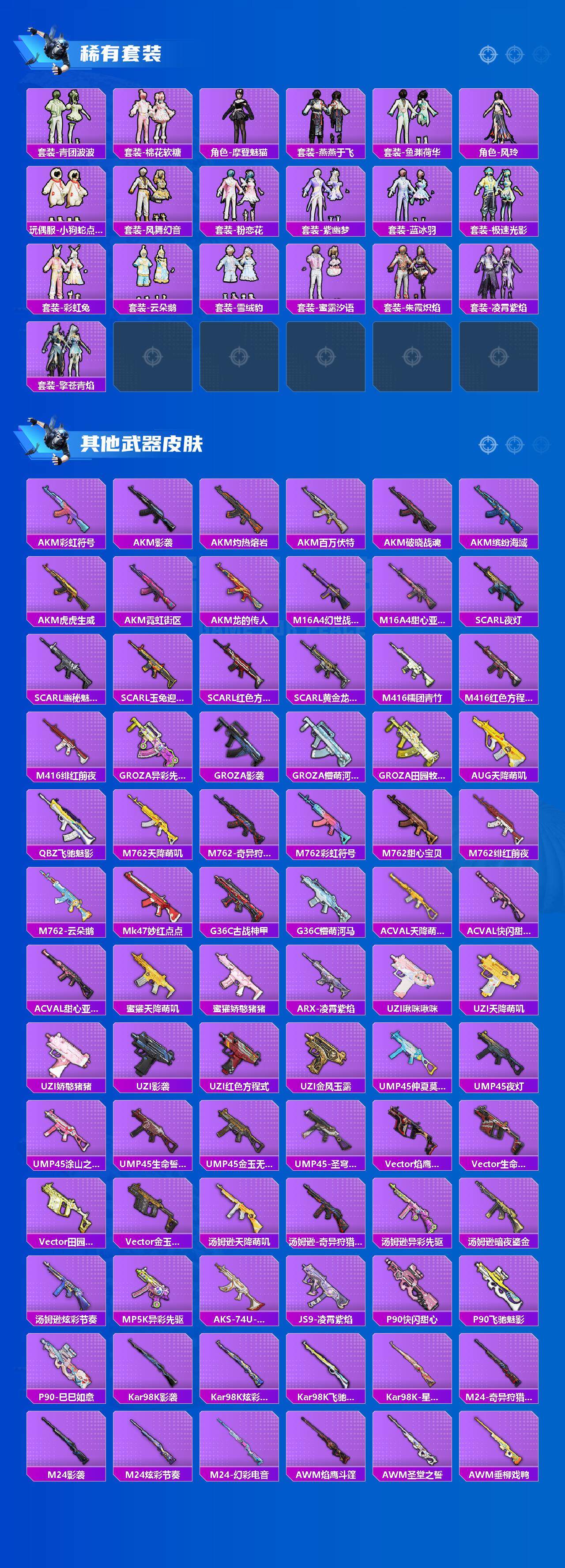 - [12583745]安卓 手Q-19粉装-4特效枪-2载具-4粉色飞行器-95063热力值-7王牌印记-242套装-262枪皮 【热门品类】:粉装-梦幻火箭,粉装-彩装战姬,套装-浪漫天命,套装-派对舞王,套装-奇异狩猎者,套装-龟仙人,套装-暗影哥特,套装-粉红小猪,角色-8号机,角色-Mark.06 【粉色载具】:兰博基尼Estoque(银翼灰),兰博基尼URUS(明艳黄) 【粉色套装】:粉装-数码大师,粉装-甜心巧克力,粉装-宝贝奶油派,粉装-蝶舞迷情,粉装-梦幻火箭,粉装-草莓生巧,粉装-炙焰红王,粉装-黄伞悠悠,粉装-黑伞漫漫,粉装-幻情紫藤,粉装-青葱仙萝,粉装-精灵娃娃,粉装-酣梦娃娃,粉装-天之羽翼,粉装-焦糖拿铁,角色-复仇流浪者,粉装-莲影清波,粉装-彩装战姬,粉装-星穹咏叹调 【粉色枪皮等级】:M416-风花雪月(七级),GROZA-焦糖拿铁(七级),AUG-暖羊咩咩(五级),Kar98K-巳巳如意(五级) 【粉色枪皮】:M416-风花雪月,GROZA-焦糖拿铁,AUG-暖羊咩咩,Kar98K-巳巳如意 【粉色飞行器】:梦幻火箭飞行器,天之羽翼飞行器,焦糖拿铁飞行器,龙翔九天飞行器 【粉色降落伞】:极限特训降落伞,百万伏特降落伞,银河战甲降落伞,甜心宝贝降落伞,梦幻火箭降落伞,锦绣火鲤降落伞,香水柠檬降落伞,暗夜玫瑰降落伞,红伞翩翩降落伞,蓝莓炮弹降落伞,绚金瑰梦降落伞,甜心娃娃降落伞,暗星紫秘降落伞,天之羽翼降落伞,焦糖拿铁降落伞,碧影闪光降落伞,青春物语降落伞,垂柳戏鸭降落伞,彩虹甜喵降落伞,闲梦青缨降落伞,莲影清波降落伞,彩装战姬降落伞,墨龙九天降落伞,创世·救赎降落伞,临安公主降落伞,月影灵韵降落伞 【稀有套装】:套装-龟仙人,套装-巳巳如意,套装-萝兰蝴蝶,套装-糖糖葫芦,套装-青团波波,角色-许七安,套装-燕燕于飞,套装-鱼渊荷华,套装-紫幽梦,套装-蓝冰羽,套装-星渊小夜曲 【稀有枪皮】:AKM-四圣焕新,AKM-夜灯,AKM-彩虹符号,AKM-灼热熔岩,AKM-萌趣颜团子,AKM-虎虎生威,AKM-霓虹街区,M16A4-幻世战舞者,M16A4-甜心亚梦,M16A4-红色方程式,SCAR-L-夜灯,SCAR-L-暗夜玫瑰,SCAR-L-炫彩节奏,SCAR-L-玉兔迎春,SCAR-L-黄金龙骨,SCAR-L-龙宫之主,M416-夜灯,M416-暗星紫