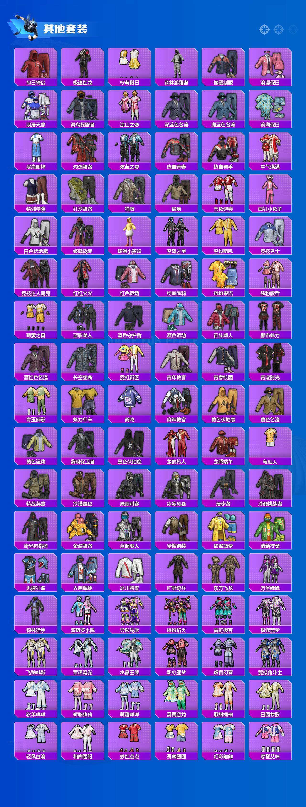 套装-山涧鹿灵,套装-天使彩虹糖,套装-未来战士,套装-宝贝奶油派,套装-音爆索尼克,套装-未来歌姬,套装-金曜白虎,套装-炙焰红王,角色-小可学妹,套装-闲梦青缨,角色-烟云彩露,角色-美琪,角色-阿尔茜,套装-飓风飞鹰,角色-觉醒初号机,套装-雪月幻音,套装-放客神游,套装-瑰丽时代,套装-勇猛狮王