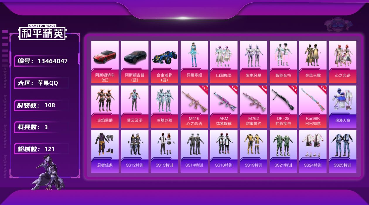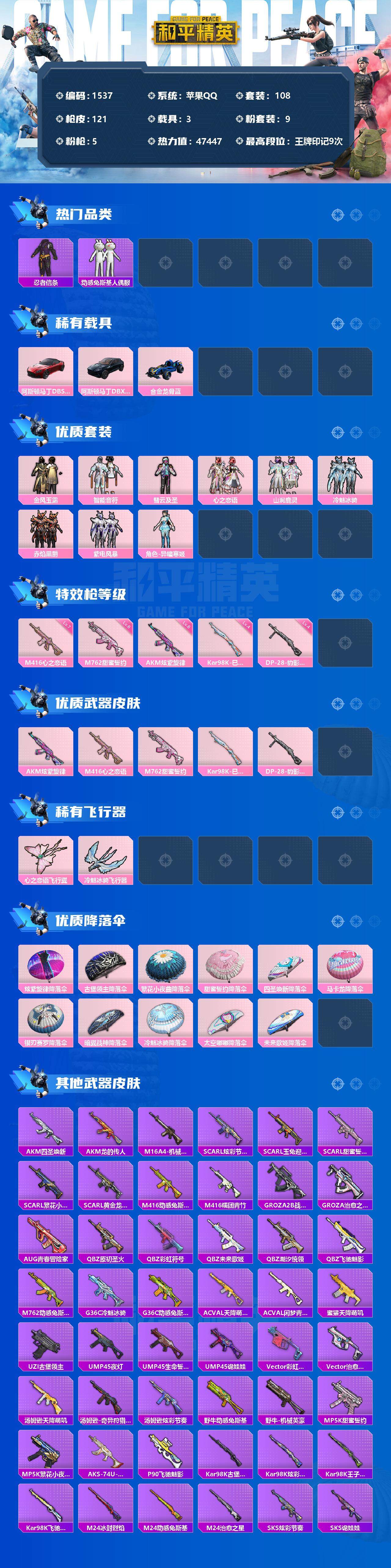 [13464047]苹果 手Q-9粉装-5特效枪-3载具-2粉色飞行器-47447热力值-9王牌印记-108套装-121枪皮 【热门品类】:套装-浪漫天命,套装-奇异狩猎者,套装-忍者信条,套装-动感兔斯基人偶服 【粉色载具】:阿斯顿马丁DBS(红),阿斯顿马丁DBX(蓝),合金龙骨(蓝) 【粉色套装】:粉装-金风玉露,粉装-智能音符,粉装-彗云及圣,粉装-心之恋语,粉装-山涧鹿灵,粉装-冷魅冰骑,粉装-赤焰黑爵,粉装-紫电风暴,角色-异瞳寒姬 【粉色枪皮等级】:AKM-炫紫旋律(六级),M416-心之恋语(七级),M762-甜蜜誓约(六级),Kar98K-巳巳如意(四级),DP-28-豹影疾电(四级) 【粉色枪皮】:AKM-炫紫旋律,M416-心之恋语,M762-甜蜜誓约,Kar98K-巳巳如意,DP-28-豹影疾电 【粉色飞行器】:心之恋语飞行翼,冷魅冰骑飞行器 【粉色降落伞】:炫紫旋律降落伞,古堡领主降落伞,繁花小夜曲降落伞,甜蜜誓约降落伞,四圣焕新降落伞,马卡龙降落伞,银刃赛罗降落伞,暗翼战神降落伞,冷魅冰骑降落伞,太空嘟嘟降落伞,未来歌姬降落伞 【稀有枪皮】:AKM-四圣焕新,AKM-龙的传人,M16A4-机械英豪,SCAR-L-炫彩节奏,SCAR-L-玉兔迎春,SCAR-L-甜蜜誓约,SCAR-L-繁花小夜曲,SCAR-L-黄金龙骨,M416-动感兔斯基,M416-糯团青竹,GROZA-2B战斗服款,GROZA-治愈之星,AUG-青春冒险家,QBZ-原初圣火,QBZ-彩虹符号,QBZ-未来歌姬,QBZ-潮汐统领,QBZ-飞驰魅影,M762-动感兔斯基,G36C-冷魅冰骑,G36C-动感兔斯基,AC-VAL-天降萌叽,AC-VAL-闲梦青缨,蜜獾-天降萌叽,UZI-古堡领主,UMP45-夜灯,UMP45-生命誓言,UMP45-诡娃娃,Vector-彩虹符号,Vector-治愈之星,汤姆逊-天降萌叽,汤姆逊-奇异狩猎者,汤姆逊-炫彩节奏,野牛-动感兔斯基,野牛-机械英豪,MP5K-甜蜜誓约,MP5K-繁花小夜曲,AKS-74U-鬼刀,P90-飞驰魅影,Kar98K-古堡领主,Kar98K-炫彩节奏,Kar98K-王子的夏天,Kar98K-飞驰魅影,M24-治愈之星,M24-冰封烈焰,M24-动感兔斯基,SKS-炫彩节奏,SKS-诡娃娃,VSS-碧影闪光,VSS-繁花小夜曲,M