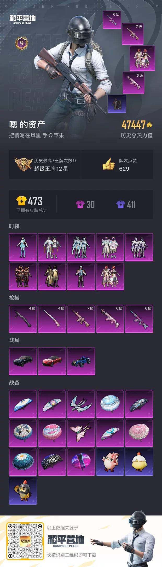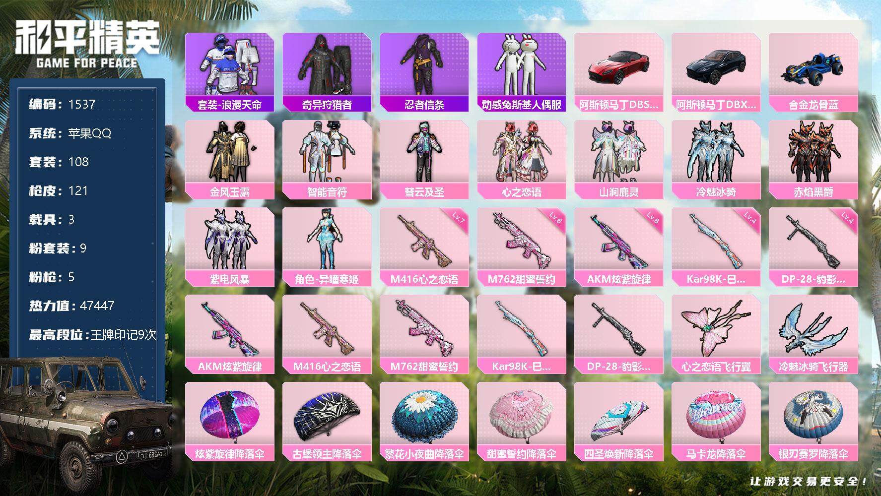 [13464047]苹果 手Q-9粉装-5特效枪-3载具-2粉色飞行器-47447热力值-9王牌印记-108套装-121枪皮