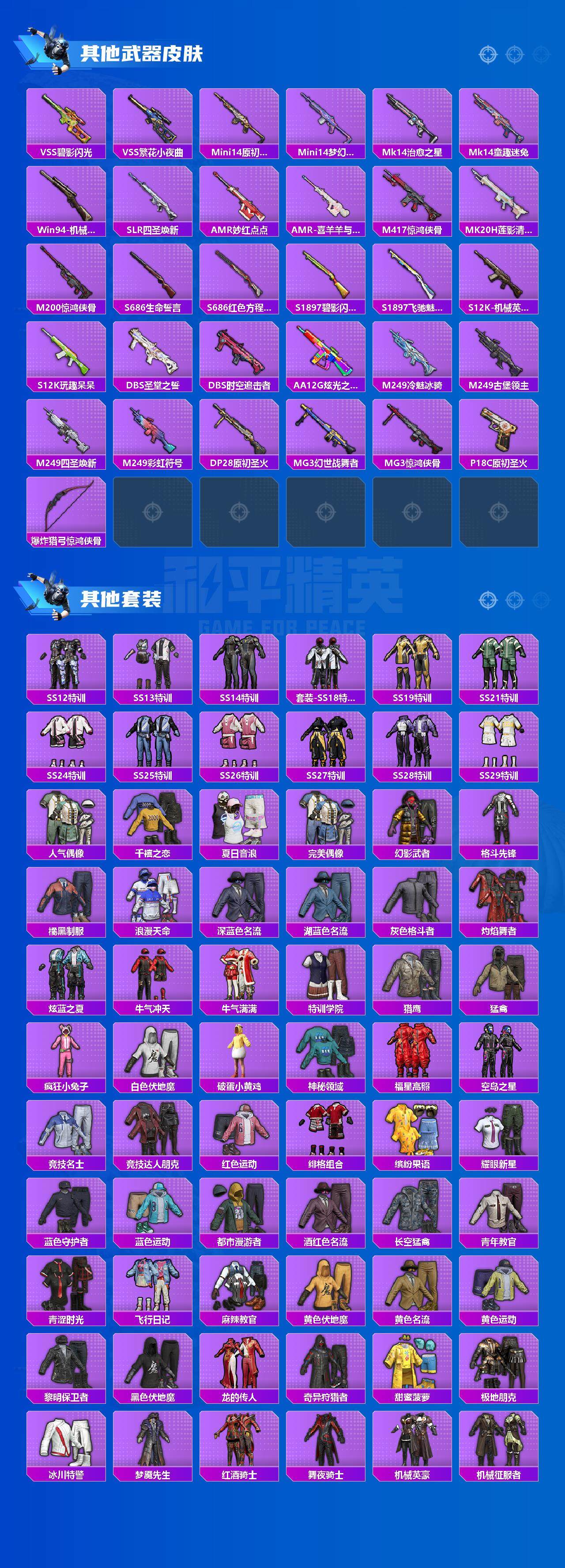 【稀有枪皮】:AKM-四圣焕新,AKM-龙的传人,M16A4-机械英豪,SCAR-L-炫彩节奏,SCAR-L-玉兔迎春,SCAR-L-甜蜜誓约,SCAR-L-繁花小夜曲,SCAR-L-黄金龙骨,M416-动感兔斯基,M416-糯团青竹,GROZA-2B战斗服款,GROZA-治愈之星,AUG-青春冒险家,QBZ-原初圣火,QBZ-彩虹符号,QBZ-未来歌姬,QBZ-潮汐统领,QBZ-飞驰魅影,M762-动感兔斯基,G36C-冷魅冰骑,G36C-动感兔斯基,AC-VAL-天降萌叽,AC-VAL-闲梦青缨,蜜獾-天降萌叽,UZI-古堡领主,UMP45-夜灯,UMP45-生命誓言,UMP45-诡娃娃,Vector-彩虹符号,Vector-治愈之星,汤姆逊-天降萌叽,汤姆逊-奇异狩猎者,汤姆逊-炫彩节奏,野牛-动感兔斯基,野牛-机械英豪,MP5K-甜蜜誓约,MP5K-繁花小夜曲,AKS-74U-鬼刀,P90-飞驰魅影,Kar98K-古堡领主,Kar98K-炫彩节奏,Kar98K-王子的夏天,Kar98K-飞驰魅影,M24-治愈之星,M24-冰封烈焰,M24-动感兔斯基,SKS-炫彩节奏,SKS-诡娃娃,VSS-碧影闪光,VSS-繁花小夜曲,M