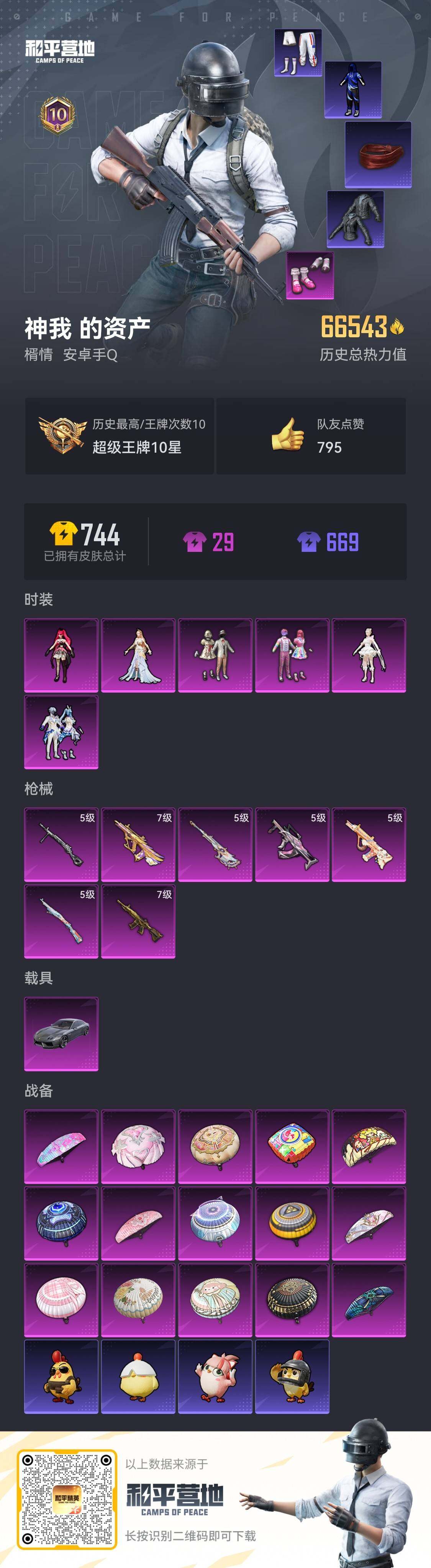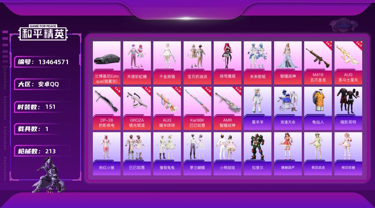 [13464571]安卓 手Q-6粉装-7特效枪-1载具-0粉色飞行器-66543热力值-10王牌印记-151套装-213枪皮