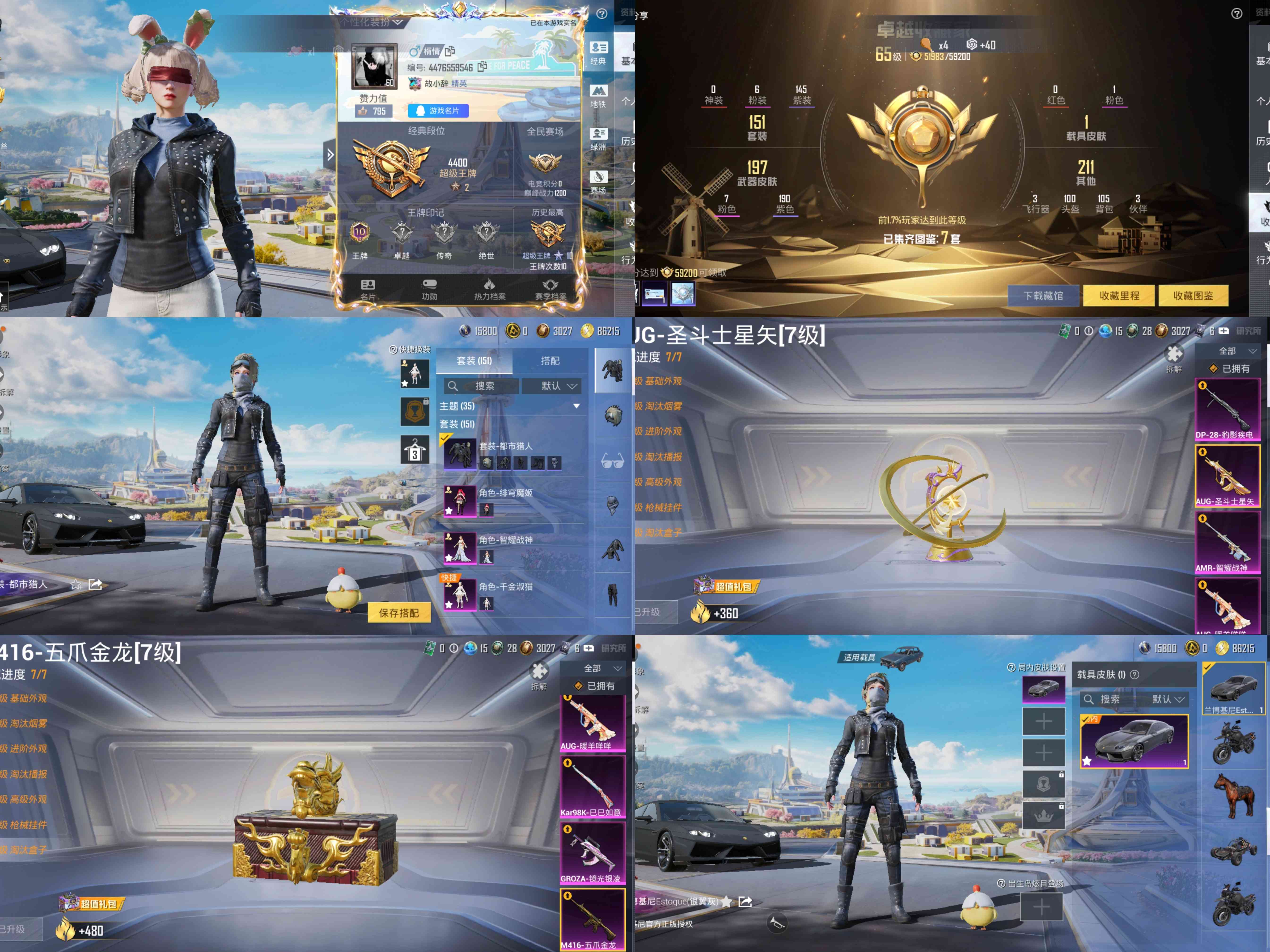 【粉色枪皮等级】:M416-五爪金龙(七级),GROZA-镜光银凌(五级),AUG-暖羊咩咩(五级),AUG-圣斗士星矢(七级),Kar98K-巳巳如意(五级),AMR-智耀战神(五级),DP-28-豹影疾电(五级)