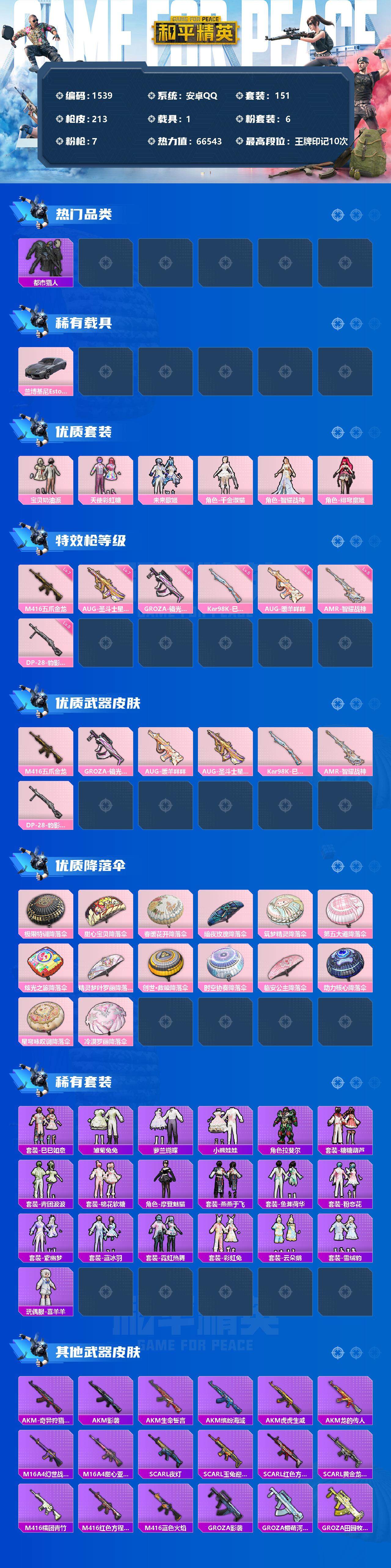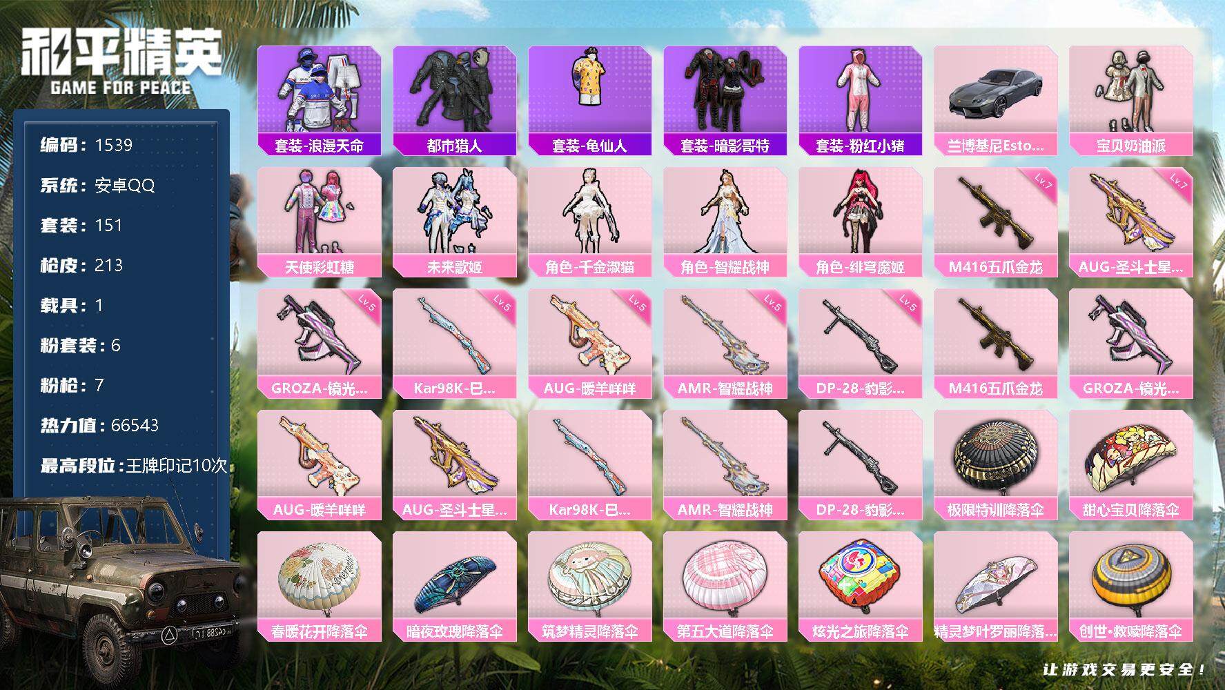 [13464571]安卓 手Q-6粉装-7特效枪-1载具-0粉色飞行器-66543热力值-10王牌印记-151套装-213枪皮 【热门品类】:套装-浪漫天命,套装-都市猎人,套装-龟仙人,套装-暗影哥特,套装-粉红小猪 【粉色载具】:兰博基尼Estoque(银翼灰) 【粉色套装】:粉装-宝贝奶油派,粉装-天使彩虹糖,粉装-未来歌姬,角色-千金淑猫,角色-智耀战神,角色-绯穹魔姬 【粉色枪皮等级】:M416-五爪金龙(七级),GROZA-镜光银凌(五级),AUG-暖羊咩咩(五级),AUG-圣斗士星矢(七级),Kar98K-巳巳如意(五级),AMR-智耀战神(五级),DP-28-豹影疾电(五级) 【粉色枪皮】:M416-五爪金龙,GROZA-镜光银凌,AUG-暖羊咩咩,AUG-圣斗士星矢,Kar98K-巳巳如意,AMR-智耀战神,DP-28-豹影疾电 【粉色降落伞】:极限特训降落伞,甜心宝贝降落伞,春暖花开降落伞,暗夜玫瑰降落伞,筑梦精灵降落伞,第五大道降落伞,炫光之旅降落伞,精灵梦叶罗丽降落伞,创世·救赎降落伞,时空协奏降落伞,临安公主降落伞,动力核心降落伞,星穹咏叹调降落伞,冷漠罗丽降落伞 【稀有套装】:套装-龟仙人,套装-巳巳如意,套装-雏菊兔兔,套装-萝兰蝴蝶,套装-小熊娃娃,角色-拉斐尔,套装-糖糖葫芦,套装-青团波波,套装-棉花软糖,角色-摩登魅猫,套装-燕燕于飞,套装-鱼渊荷华,套装-粉恋花,套装-紫幽梦,套装-蓝冰羽,套装-霓虹热舞,套装-彩虹兔,套装-云朵鹅,套装-雪绒豹,玩偶服-喜羊羊 【稀有枪皮】:AKM-奇异狩猎者,AKM-影袭,AKM-生命誓言,AKM-缤纷海域,AKM-虎虎生威,AKM-龙的传人,M16A4-幻世战舞者,M16A4-甜心亚梦,SCAR-L-夜灯,SCAR-L-玉兔迎春,SCAR-L-红色方程式,SCAR-L-黄金龙骨,M416-糯团青竹,M416-红色方程式,M416-蓝色火焰,GROZA-影袭,GROZA-懵萌河马,GROZA-田园牧歌,GROZA-黑色刀锋,AUG-天降萌叽,AUG-甜蜜菠萝,AUG-耀粉歌者,QBZ-彩虹符号,QBZ-飞驰魅影,M762-天降萌叽,M762-暗夜鎏金,M762-瑞龙福将,M762-甜心宝贝,M762-第五大道,M762-云朵鹅,Mk47-妙红点点,Mk47-炫光之旅,G36C-懵萌河马,AC-VAL-甜心亚