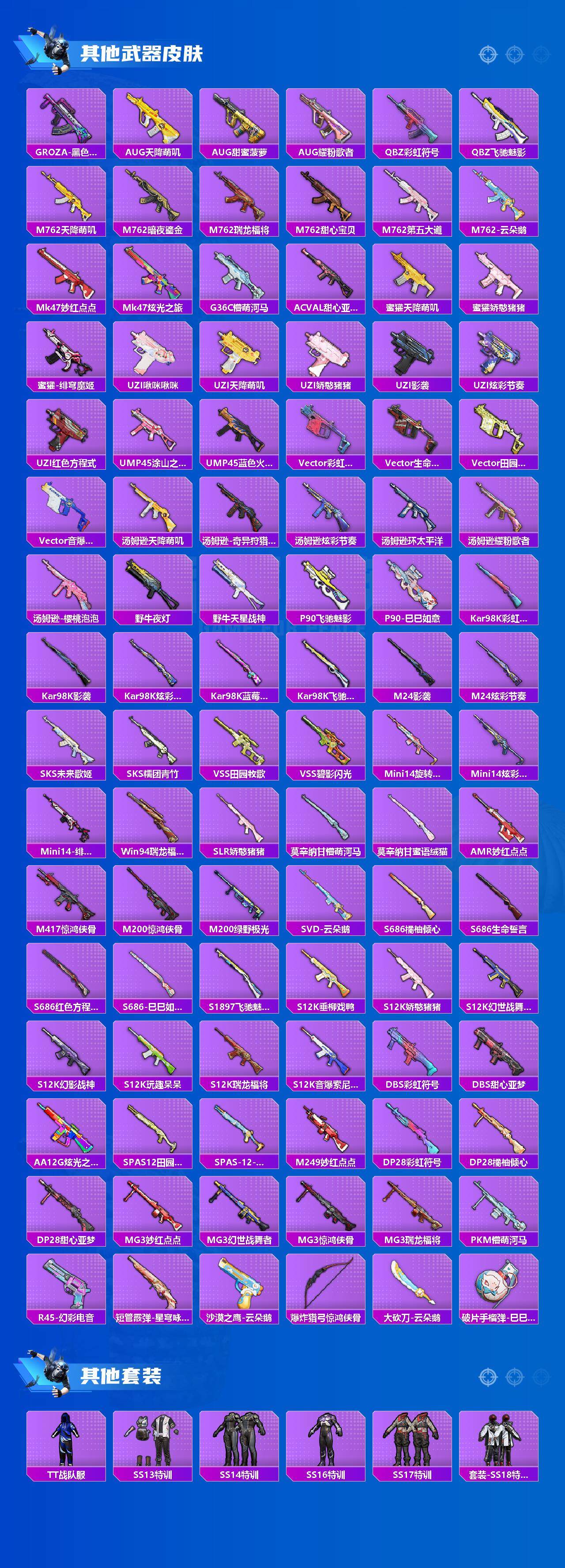 【稀有枪皮】:AKM-奇异狩猎者,AKM-影袭,AKM-生命誓言,AKM-缤纷海域,AKM-虎虎生威,AKM-龙的传人,M16A4-幻世战舞者,M16A4-甜心亚梦,SCAR-L-夜灯,SCAR-L-玉兔迎春,SCAR-L-红色方程式,SCAR-L-黄金龙骨,M416-糯团青竹,M416-红色方程式,M416-蓝色火焰,GROZA-影袭,GROZA-懵萌河马,GROZA-田园牧歌,GROZA-黑色刀锋,AUG-天降萌叽,AUG-甜蜜菠萝,AUG-耀粉歌者,QBZ-彩虹符号,QBZ-飞驰魅影,M762-天降萌叽,M762-暗夜鎏金,M762-瑞龙福将,M762-甜心宝贝,M762-第五大道,M762-云朵鹅,Mk47-妙红点点,Mk47-炫光之旅,G36C-懵萌河马,AC-VAL-甜心亚