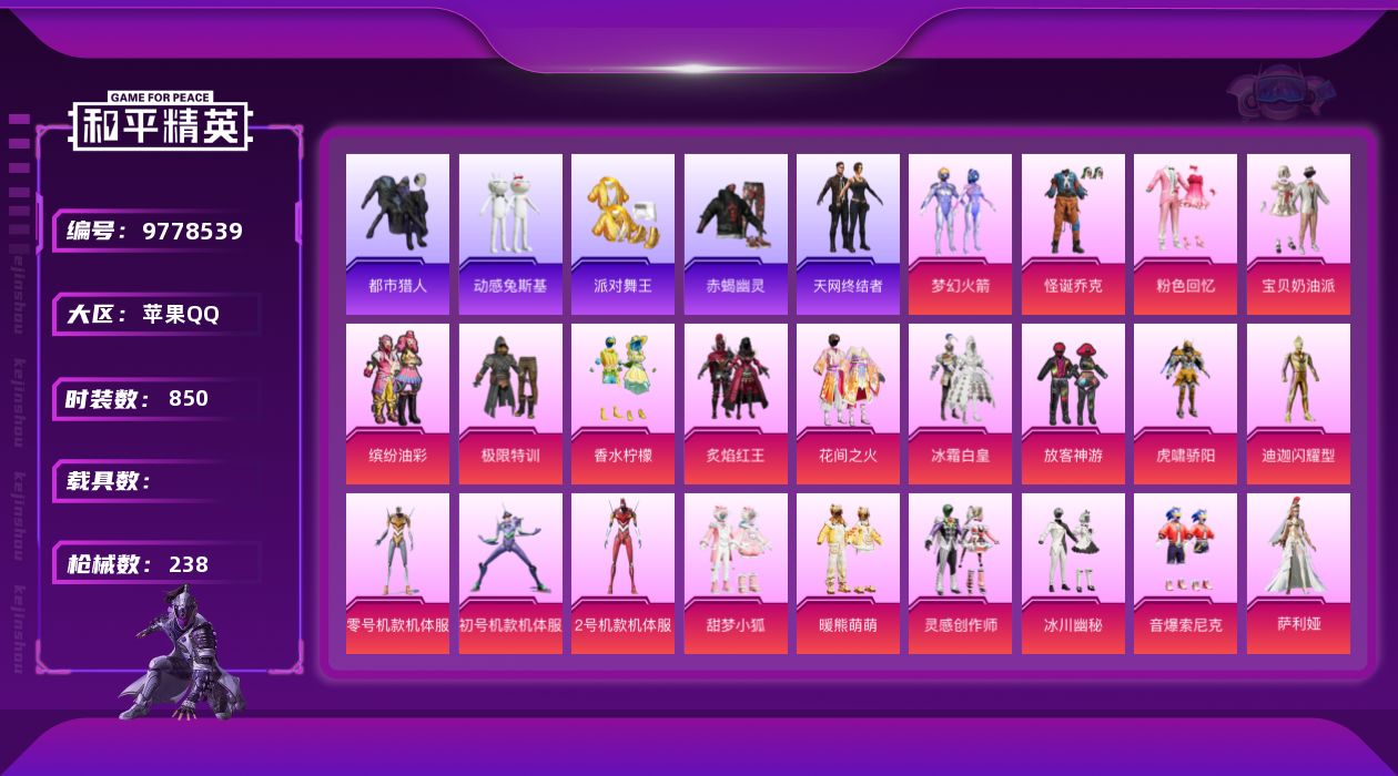 [9778539]实名: 可修改 时装数: 815 枪械数: 219 战备数: 168 热门装扮: 梦幻火箭(新101),极限特训,怪诞乔克,宝贝奶油派,放客神游,鹰眼刺客,缤纷油彩,粉色回忆,都市猎人,香水柠檬,炙焰红王,花间之火,冰霜白皇,虎啸骄阳,迪迦闪耀型,零号机款机体服,初号机款机体服,2号机款机体服,甜梦小狐,暖熊萌萌,灵感创作师,冰川幽秘,动感兔斯基,音爆索尼克,赤蝎幽灵,派对舞王,萨利娅 稀有枪皮: MG3洛神天依,Vector红伞翩翩,AKM甜心宝贝,M416心之恋语,SCAR-L童趣迷兔,Groza香水柠檬,DP-28枪炮玫瑰,M416暖熊萌萌,SPAS-12音爆索尼克,平底锅林间仙鹿,Kar98K-巳巳如意,MK12-雪月幻音