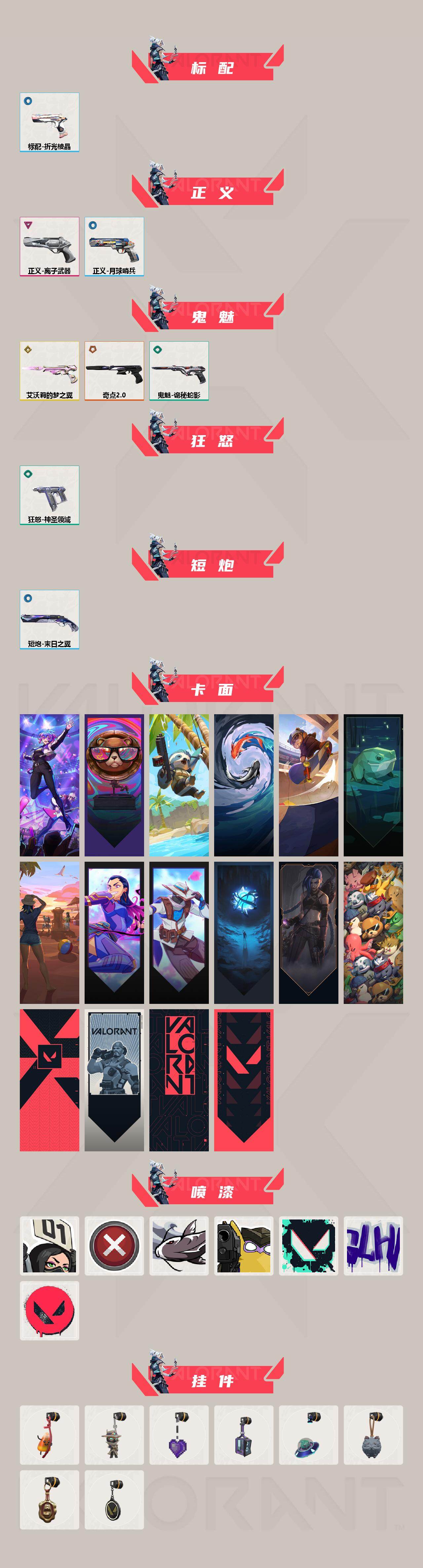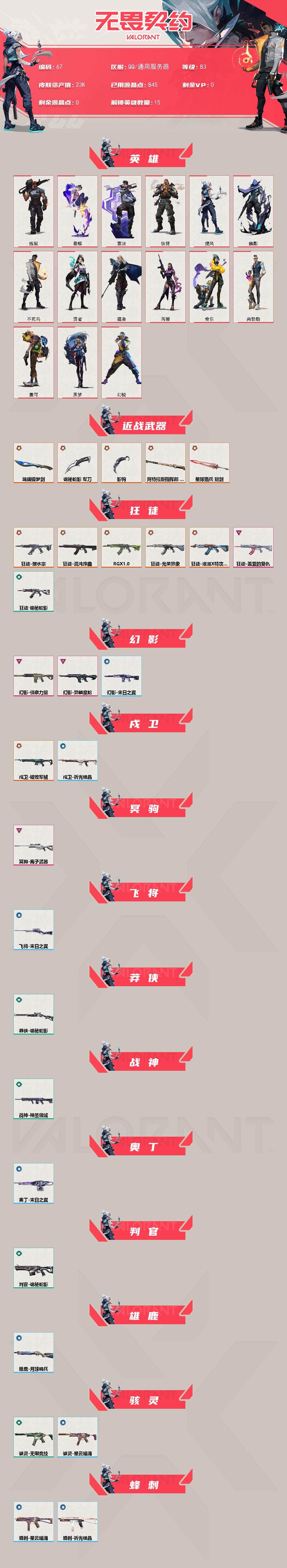 [13530711]【英雄】:幻棱,炼狱,暮蝶,壹决,铁臂,捷风,幽影,不死鸟,贤者,猎枭,芮娜,奇乐,尚勃勒,盖可,黑梦 【近战 武器】:近战武器-影钩,近战武器-琉璃锻梦剑,近战武器-诡秘蛇影 军刀,近战武器-阿特拉斯指挥部 甩棍,近战武器-星际猎兵 短剑 【狂徒】:狂徒-混沌序曲,狂徒-塑水宗,狂徒-RGX 11z Pro,狂徒-光荣异象,狂徒-滋滋X特攻队,狂徒-盖亚的复仇,狂徒-诡秘蛇影 【幻影】:幻影-侦察力量,幻影-异鳞魔蛇,幻影-末日之翼 【戍卫】:戍卫-破败军械,戍卫-折光棱晶 【冥驹】:冥驹-离子武器 【飞将】:飞将-末日之翼 【莽侠】:莽侠-诡秘蛇影 【战神】:战神-神圣领域 【奥丁】:奥丁-末日之翼 【判官】:判官-诡秘蛇影 【雄鹿】:雄鹿-月球哨兵 【骇灵】:骇灵-无限竞技,骇灵-星云暗涌 【蜂刺】:蜂刺-星云暗涌,蜂刺-折光棱晶 【标配】:标配-折光棱晶 【正义】:正义-离子武器,正义-月球哨兵 【鬼魅】:鬼魅-艾沃莉的梦之翼,鬼魅-奇点//2.0,鬼魅-诡秘蛇影 【狂怒】:狂怒-神圣领域 【短炮】:短炮-末日之翼 【卡面】:超能偶像 卡面,音熊登场 卡面,树懒大作战 卡面,红鳞松叶 卡面,Clutch 卡面,霓帧牛蛙 卡面,沙雕爆能器 卡面,无畏契约GO!第一卷:芮娜 卡面,无畏契约GO!第一卷:零 卡面,无垠星环 卡面,《双城之战》金克丝 卡面,同步耍酷 卡面,代号红色 卡面,新兵报到 卡面,V契约 卡面,无畏契约 卡面 【喷漆】:我觉得不行 喷漆,买装还是存钱 喷漆,松叶 喷漆,放下武器 喷漆,胜利属于无畏契约 喷漆,GLHF 喷漆,无畏契约 喷漆 【挂饰】:可爱糖糖 挂饰,无畏契约GO!第一卷 零 挂饰,薰衣草之心 挂饰,动力机箱 挂饰,天外飞客 挂饰,《双城之战》魄罗 挂饰,海豹的认可 挂饰,无畏契约 纪念币 挂饰