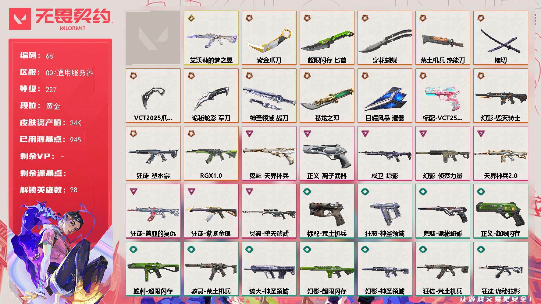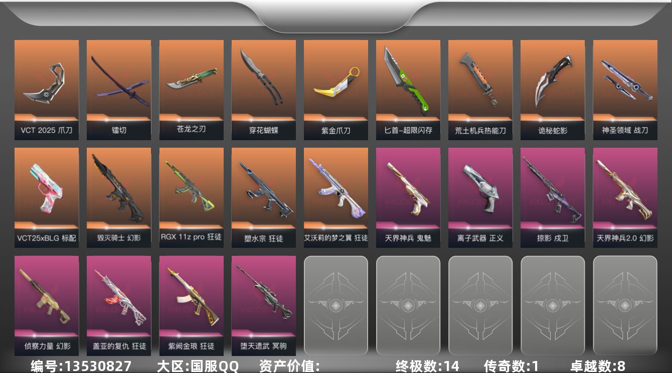 [13530827]【套装】:VCT 2025 赛季套装 【英雄】:幻棱,炼狱,维斯,暮蝶,钛狐,壹决,铁臂,捷风,雷兹,幽影,不死鸟,贤者,猎枭,蝰蛇,零,芮娜,奇乐,尚勃勒,霓虹,斯凯,夜露,星礈,K/O,海神,盖可,黑梦,钢锁 【近战 武器】:近战武器-5周年//公测重制版 苍龙之刃,近战武器-穿花蝴蝶,近战武器-VCT 2025 爪刀,近战武器-紫金爪刀,近战武器-镭切,近战武器-超限闪存 匕首,近战武器-荒土机兵 热能刀,近战武器-诡秘蛇影 军刀,近战武器-神圣领域 战刀,近战武器-日耀风暴 遗器 【狂徒】:狂徒-艾沃莉的梦之翼,狂徒-塑水宗,狂徒-RGX 11z Pro,狂徒-盖亚的复仇,狂徒-紫阙金琅,狂徒-荒土机兵,狂徒-诡秘蛇影 【幻影】:幻影-毁灭骑士,幻影-天界神兵//2.0,幻影-侦察力量,幻影-超限闪存,幻影-神圣领域,幻影-纳米打击,幻影-末日之翼 【戍卫】:戍卫-掠影,戍卫-浮光跃金,戍卫-逆冲蛮牛,戍卫-月球哨兵,戍卫-折光棱晶 【獠犬】:獠犬-神圣领域,獠犬-模拟赫兹,獠犬-逆冲蛮牛 【冥驹】:冥驹-堕天遗武,冥驹-荒土机兵,冥驹-模拟赫兹,冥驹-星云暗涌 【飞将】:飞将-末日之翼 【莽侠】:莽侠-超限闪存,莽侠-诡秘蛇影,莽侠-月球哨兵 【战神】:战神-神圣领域,战神-浮光跃金 【奥丁】:奥丁-纳米打击,奥丁-末日之翼 【判官】:判官-诡秘蛇影,判官-纳米打击x 【雄鹿】:雄鹿-模拟赫兹,雄鹿-逆冲蛮牛,雄鹿-月球哨兵 【骇灵】:骇灵-荒土机兵,骇灵-浮光跃金,骇灵-星云暗涌 【蜂刺】:蜂刺-超限闪存,蜂刺-星云暗涌,蜂刺-折光棱晶 【标配】:标配-荒土机兵,标配-浮光跃金,标配-折光棱晶 【VCT手枪】:标配-VCT25 x BLG 【正义】:正义-离子武器,正义-超限闪存,正义-纳米打击,正义-游戏结束,正义-月球哨兵 【鬼魅】:鬼魅-天界神兵,鬼魅-诡秘蛇影,鬼魅-模拟赫兹,鬼魅-星云暗涌 【狂怒】:狂怒-神圣领域,狂怒-逆冲蛮牛 【短炮】:短炮-末日之翼 【卡面】:终章:激斗汉堡 卡面,进入射程 卡面,分崩离析 卡面,纳米打击 卡面,抑制技术 卡面,激斗汉堡 卡面,瓦娃脸雪糕 P2 卡面,从黄昏到黎明 卡面,荒土机兵 卡面,银弹猎手 卡面,逆冲蛮牛 卡面,《双城之战》拥抱 卡面,精灵大战 卡面,欢迎来到底城 卡面,南瓜盛典 卡面,唱片的故事