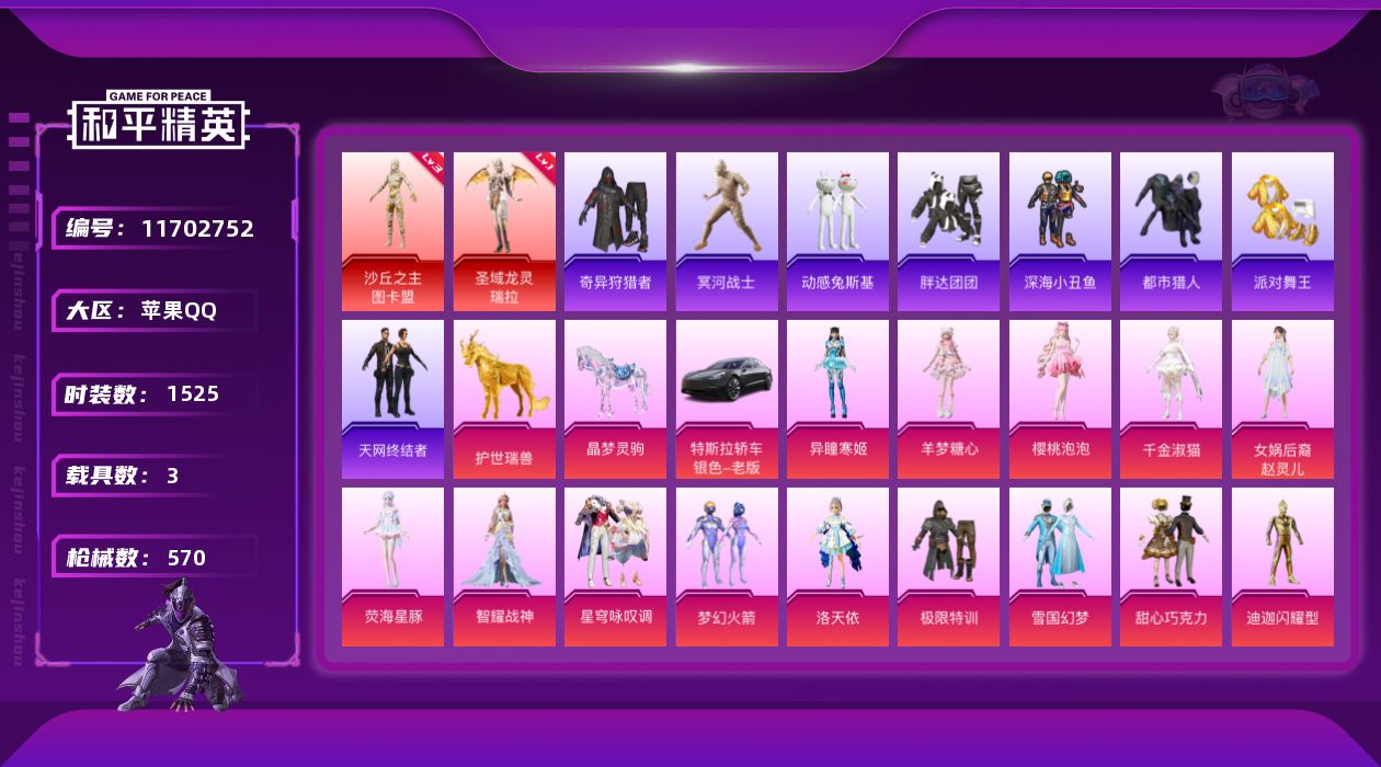 [11702752]苹果q 极品词组🆔雅观 实名: 可修改 时装数: 1517 载具数: 3 枪械数: 562 战备数: 383 神级装扮: 沙丘之主-图卡盟,圣域龙灵-瑞拉 热门装扮: 奇异狩猎者,梦幻火箭(新101),极限特训,幻影战神,甜心巧克力,怪诞乔克,深海小丑鱼,星之信仰,深渊皇后,金风玉露,宝贝奶油派,浪漫波比,天使彩虹糖,梦魇先生,放客神游,金属狂野,静灵氛围,鹰眼刺客,缤纷油彩,爱崽白熊,粉色回忆,都市猎人,暗翼战神,黄伞悠悠,绚金战神,草莓生巧,炙焰红王,花间之火,冰霜白皇,精灵迷巫,潮汐统领,童趣迷兔,迷蝶贵族,雪国幻梦,俏皮狐尾,星空之魅,山涧鹿灵,相思残雪,馨动时刻,迪迦闪耀型,冥河战士,蜜桃特工,彩虹鹿灵,俏雪含霜,洛天依,蓝莓炮弹,精灵娃娃,酣梦娃娃,甜心娃娃,焦糖拿铁,百合蜜语,甜梦小狐,筑梦精灵,圣光天使,霞光圣骑,寒光使者,妙趣可丽,暖熊萌萌,复仇流浪者,绒雪飘舞,垂柳戏鸭,灵感创作师,彩虹甜喵,女娲后裔-赵灵儿,甜蜜草莓,旋转彩虹,冰川粉黛,冰川红玫,冰川幽秘,潮萌小黄鸭,大橘为重,恶魔喵喵,激萌罗小黑,罗小黑,萌神柯基,奶芙汪汪,胖达团团,奇迹天团,软萌银虎,神秘黑猫,动感兔斯基,兔兔白日梦,启明星,音爆索尼克,派对舞王,仲夏莫吉托,雪梅暗香,诡夜天鹅,第五大道,飒粉甜心,小可学妹,白勺歌姬,呆萌星弥,南国舞曲,未来歌姬,闲梦青缨,傲傲奶龙,镜光幻境,蜜语绒猫,严莉莉,美雪,美琪,小蓝,千金淑猫,樱桃泡泡,智耀战神,星穹咏叹调,荧海星豚 载具: 特斯拉Model 3(冷光银),护世瑞兽,晶梦灵驹,僚机-圣域龙宝 稀有枪皮: MG3洛神天依,M762甜蜜誓约,AKM炫紫旋律,SCAR-L梦幻火箭,AKM甜心宝贝,AWM花间之火,M416心之恋语,M416全功率超战,SCAR-L童趣迷兔,AUG星之彼岸,汤姆逊怪笑疯兔,M249蓝莓炮弹,GROZA焦糖拿铁,UMP45恐龙拽拽,SCAR-L甜梦小狐,UZI筑梦精灵,AUG妙趣可丽,M16A4垂柳戏鸭,M249彩虹甜喵,P90甜蜜草莓,GROZA旋转彩虹,M417第五大道,Vector飒粉甜心,Kar98K未来歌姬,平底锅仲夏莫吉托,M416超新星,M24莲影清波,PKM江南烟雨,AMR鸢尾晶梦,AKM-幽焰骑士,DP-28-千金淑猫,Kar98K-巳巳如意,SCAR-L金蛇镇世,破片手榴弹-热量炸弹,MK14-樱桃泡泡,Fa