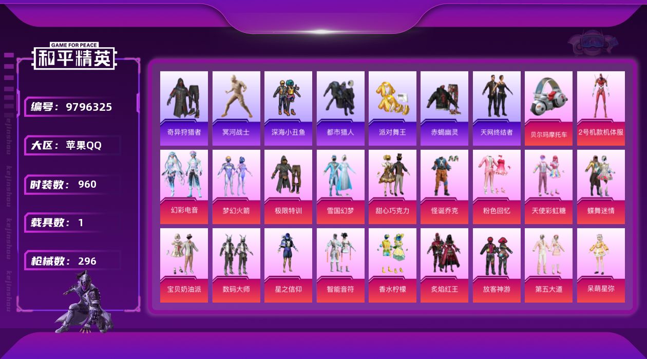 23👗14🔫3🈵️1🚗实名: 可修改 时装数: 960 载具数: 1 枪械数: 296 战备数: 203 热门装扮: 奇异狩猎者,梦幻火箭(新101),蝶舞迷情,极限特训,甜心巧克力,呆萌铁蟹,数码大师,怪诞乔克,深海小丑鱼,星之信仰,宝贝奶油派,天使彩虹糖,梦魇先生,放客神游,万圣娃娃,迅捷狂鲨,鹰眼刺客,智能音符,好奇恐龙,粉色回忆,都市猎人,香水柠檬,炙焰红王,雪国幻梦,冥河战士,2号机款机体服,赤蝎幽灵,派对舞王,第五大道,小可学妹,呆萌星弥,未来歌姬,炫光之旅,宙之时溯,圣堂之誓,幻彩电音 载具: 布尔玛摩托车 稀有枪皮: M416心之恋语,Groza香水柠檬,AKM梦之光华,UMP45恐龙拽拽,UZI筑梦精灵,M416暖熊萌萌,MG3梦幻舞会,Kar98K未来歌姬,P90能量风暴,P90粉樱探戈,AMR炫光之旅,SCAR-L彩装战姬,Kar98K-巳巳如意,AUG-暖羊咩咩
