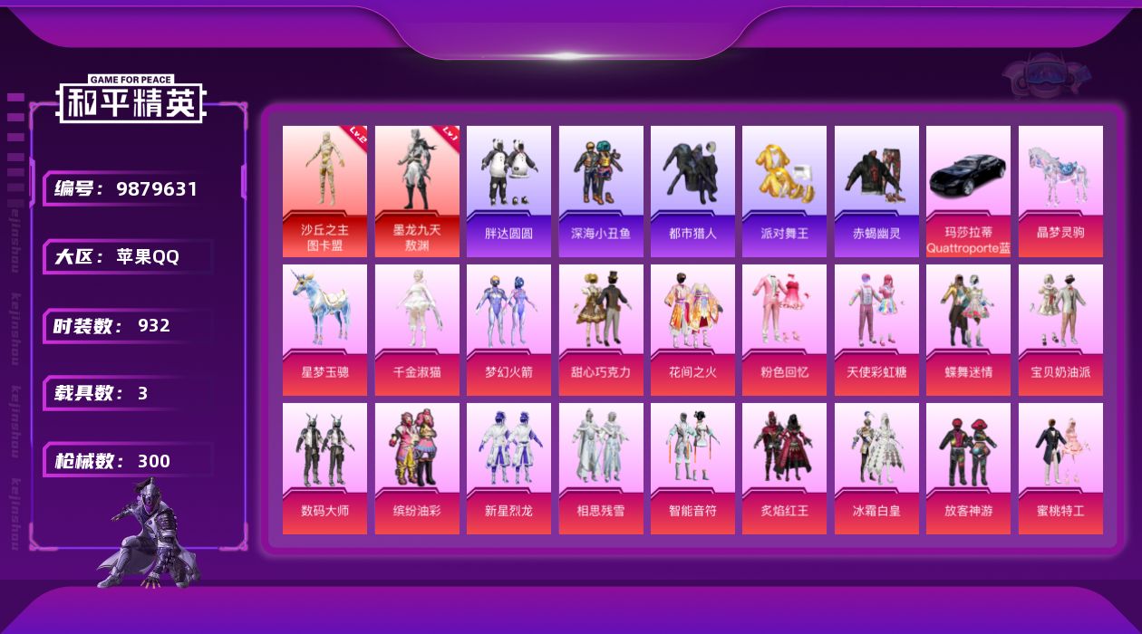 [9879631]实名: 可修改 时装数: 932 载具数: 3 枪械数: 300 战备数: 262 神级装扮: 沙丘之主-图卡盟,墨龙九天-敖渊 热门装扮: 梦幻火箭(新101),蝶舞迷情,甜心巧克力,呆萌铁蟹,数码大师,深海小丑鱼,宝贝奶油派,天使彩虹糖,放客神游,迅捷狂鲨,鹰眼刺客,智能音符,缤纷油彩,粉色回忆,都市猎人,东方飞龙,炙焰红王,花间之火,冰霜白皇,新星烈龙,相思残雪,蜜桃特工,甜梦小狐,橘柚倾心,霞光圣骑,寒光使者,冰川粉黛,冰川红玫,冰川幽秘,激萌罗小黑,胖达圆圆,兔兔白日梦,暗夜鎏金,赤蝎幽灵,派对舞王,仲夏莫吉托,第五大道,小可学妹,白勺歌姬,呆萌星弥,未来歌姬,小叽联名款,猪猪侠,美琪,守护天翼,千金淑猫 载具: 僚机-萌兔起飞,玛莎拉蒂Quattroporte(夜幕蓝),星梦玉骢,晶梦灵驹 稀有枪皮: M416五爪金龙,SCAR-L童趣迷兔,UMP45相思残雪,SCAR-L青春物语,AKM星际浪客,M417第五大道,Kar98K未来歌姬,DP-28圣堂之誓,PKM江南烟雨,P90-金丰海韵,AKM-幽焰骑士,GROZA-镜光银凌,AUG-许七安,Kar98K-巳巳如意