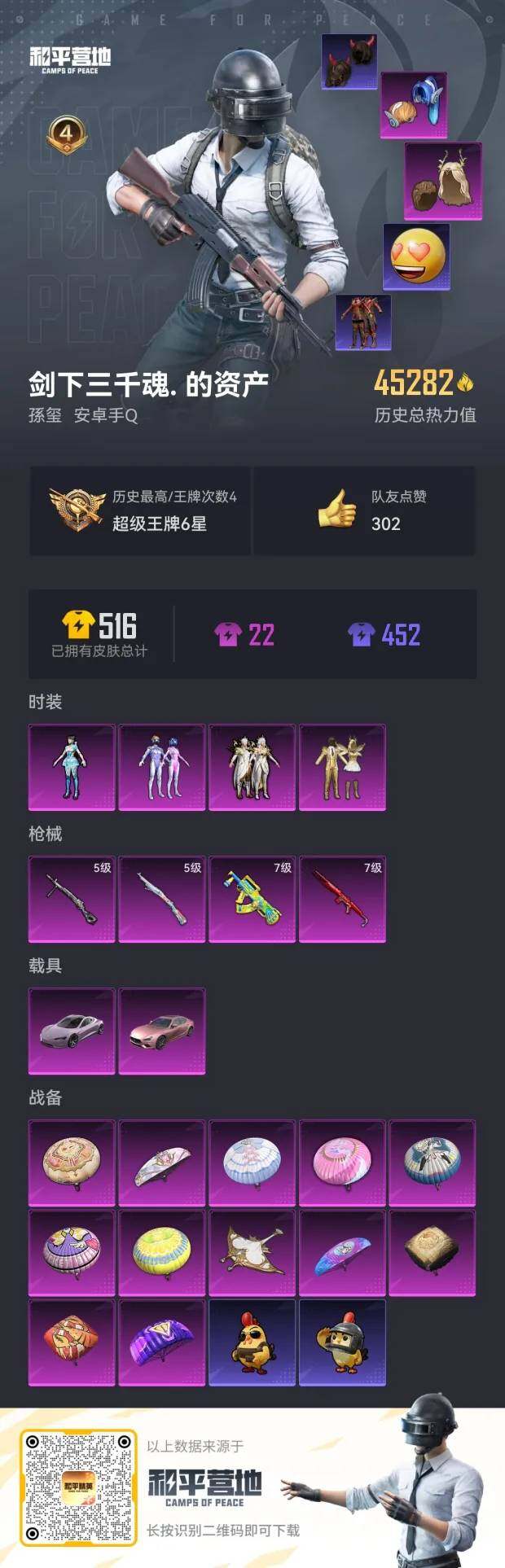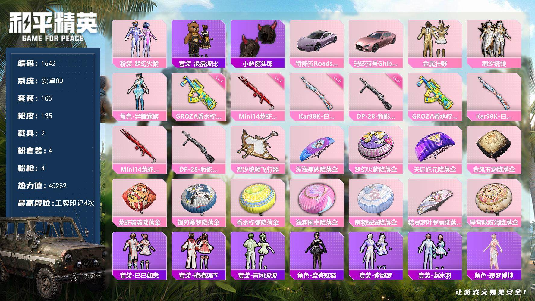 [13630231]安卓 手Q-4粉装-4特效枪-2载具-1粉色飞行器-45282热力值-4王牌印记-105套装-135枪皮
