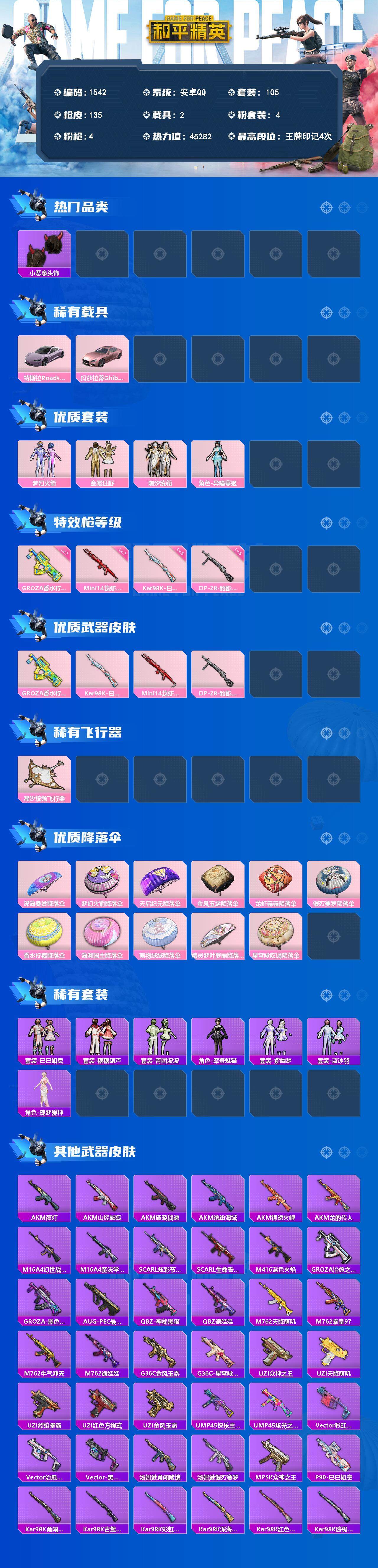 [13630231]安卓 手Q-4粉装-4特效枪-2载具-1粉色飞行器-45282热力值-4王牌印记-105套装-135枪皮 【热门品类】:粉装-梦幻火箭,套装-浪漫波比,小恶魔头饰 【粉色载具】:特斯拉Roadster(沁心粉),玛莎拉蒂Ghibli(粉) 【粉色套装】:粉装-梦幻火箭,粉装-金属狂野,粉装-潮汐统领,角色-异瞳寒姬 【粉色枪皮等级】:GROZA-香水柠檬(七级),Kar98K-巳巳如意(五级),Mini14-龙虾霸霸(七级),DP-28-豹影疾电(五级) 【粉色枪皮】:GROZA-香水柠檬,Kar98K-巳巳如意,Mini14-龙虾霸霸,DP-28-豹影疾电 【粉色飞行器】:潮汐统领飞行器 【粉色降落伞】:深海曼妙降落伞,梦幻火箭降落伞,天启纪元降落伞,金风玉露降落伞,龙虾霸霸降落伞,银刃赛罗降落伞,香水柠檬降落伞,海渊国主降落伞,萌物绒绒降落伞,精灵梦叶罗丽降落伞,星穹咏叹调降落伞 【稀有套装】:套装-巳巳如意,套装-糖糖葫芦,套装-青团波波,角色-摩登魅猫,套装-紫幽梦,套装-蓝冰羽,角色-瑰梦爱神 【稀有枪皮】:AKM-夜灯,AKM-山经魅狐,AKM-破晓战魂,AKM-缤纷海域,AKM-锦绣火鲤,AKM-龙的传人,M16A4-幻世战舞者,M16A4-魔法学院,SCAR-L-炫彩节奏,SCAR-L-生命誓言,M416-蓝色火焰,GROZA-治愈之星,GROZA-黑色刀锋,AUG-PEC最牛战神,QBZ-神秘黑猫,QBZ-诡娃娃,M762-天降萌叽,M762-拳皇97,M762-牛气冲天,M762-诡娃娃,G36C-金风玉露,G36C-星穹咏叹调,UZI-众神之王,UZI-天降萌叽,UZI-烈焰拳霸,UZI-红色方程式,UZI-金风玉露,UMP45-快乐主宰,UMP45-炫光之旅,Vector-彩虹符号,Vector-治愈之星,Vector-黑色刀锋,汤姆逊-勇闯险境,汤姆逊-银刃赛罗,MP5K-众神之王,P90-巳巳如意,Kar98K-勇闯险境,Kar98K-古堡领主,Kar98K-彩虹符号,Kar98K-深海曼妙,Kar98K-红色方程式,Kar98K-终极赛罗,M24-治愈之星,M24-众神之王,M24-冰封烈焰,AWM-荒野猎神,SKS-勇闯险境,SKS-夜灯,SKS-折纸暴龙,VSS-黑色刀锋,Mini14-炫彩节奏,Mini14-生命誓言,Mk14-