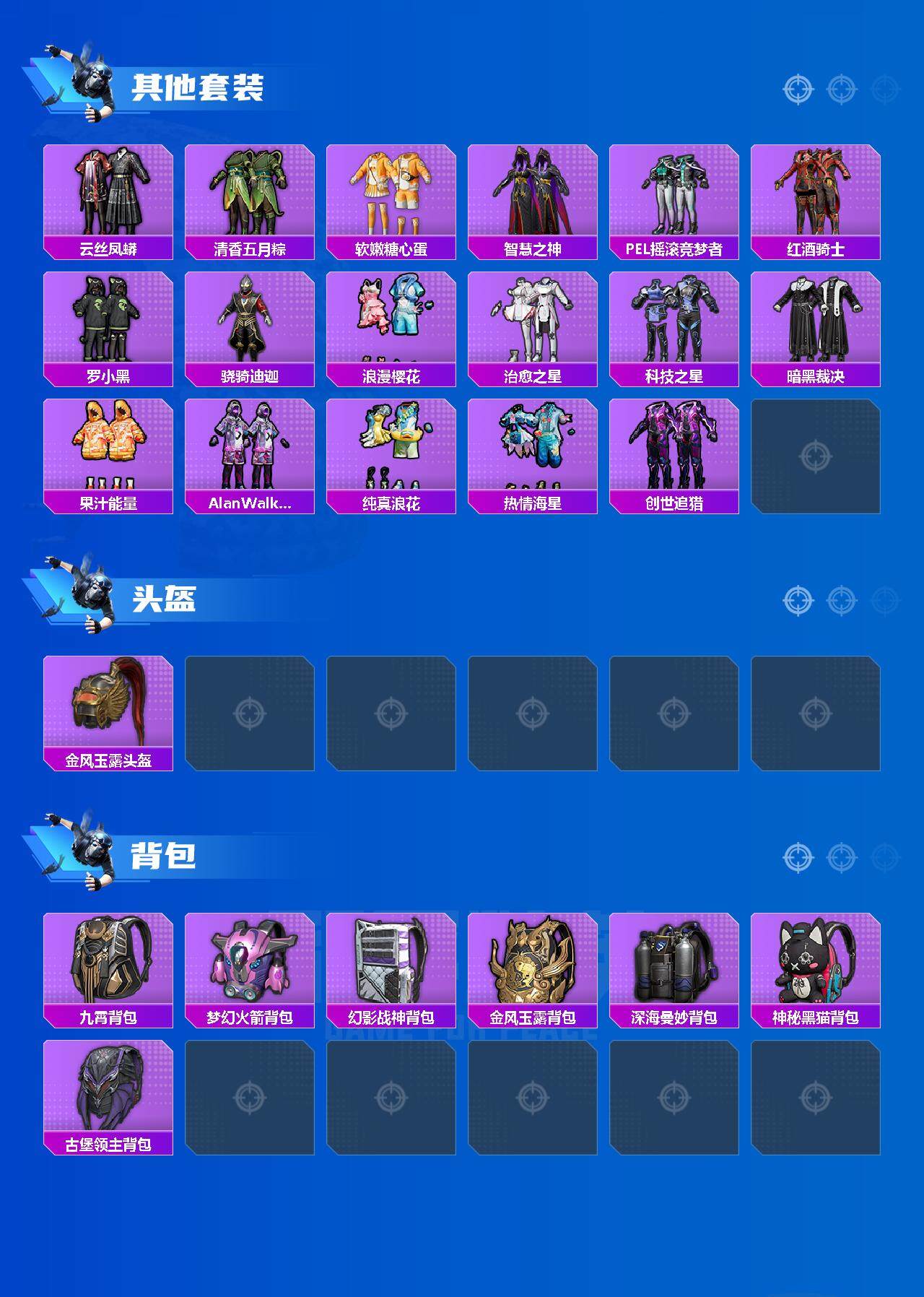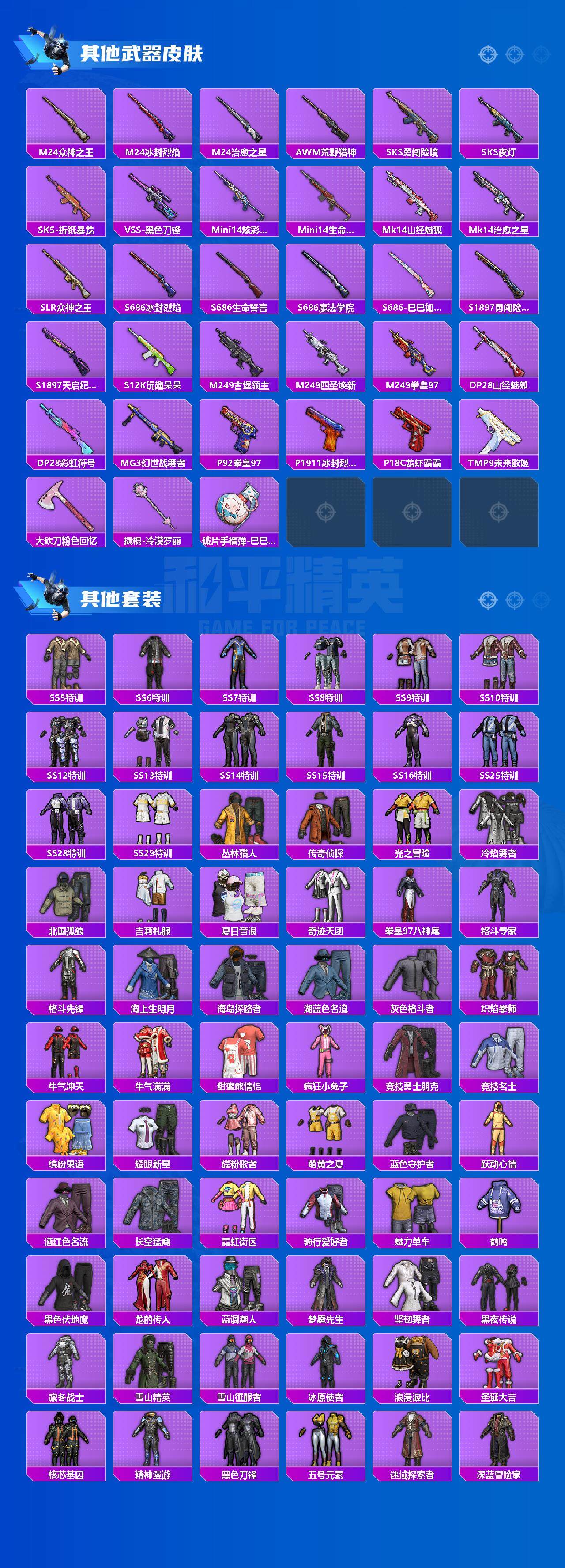- [11604469]1红装 1粉装 3特效枪 7印记 可二次 可修改实名 优质装备:二级墨龙九天-敖渊(2级敖渊2级野人),墨龙九天-敖渊(野人),M416电玩时刻,Kar98K-巳巳如意 热门装扮:创世·救赎,梦魇先生 五级特效枪:五级Kar98K-巳巳如意,五级DP-28-豹影疾电,五级M416-电玩时刻 紫色装扮:SS30特训套装,冷焰舞者,千禧之恋,SS31特训套装,长空猛禽,霓虹街区,霸义无双,缤纷果语,蓝彩潮人,蓝色运动,血色贵族,超能勇士,龙的传人,骑行爱好者,魅力单车,黄色伏地魔,黄色运动,黑色伏地魔,龟仙人,冰河战士,龙魂突击队,蝶变,绮丽涂鸦,极速红龙,海岛探路者,暗金炫舞,夏日倾情,恋恋初桃,疯狂小兔子,白色伏地魔,破晓战魂,空岛之星,猛禽,燃烧卡路里,猎鹰,小熊娃娃,雏菊兔兔,萝兰蝴蝶,SS29特训,达芬奇,神气赞萌露比,银尘,白光莹,纯真浪花,热情海星,曼妙人鱼,SS28特训,卖崽青蛙,迎夏光舞,奶油梦幻熊,星途旅人,巳巳如意,鱼渊荷华,燕燕于飞,森林游猎者,海琴烟,竞技名士,街头风暴,冰公主,智谋强哥,SS25特训,明鸳圣池,SS27特训,SS26特训,春光漫游,快闪甜心,贝斯之夜,大橘大利,智慧之神,粉恋花,蓝冰羽,紫幽梦,SS32特训服(SS32特训套装),蜜桃派对,恋语绒绒,金耀舞者,蓝调潮人,贵族骑装 优质战备:鸢尾晶梦降落伞,创世·救赎降落伞,绮梦流光降落伞,龙翔九天飞行器,精灵梦叶罗丽降落伞,BEARBRICK飞行器,莲影清波降落伞,赛博古神降落伞,智耀战神降落伞,戏水时光飞行器,樱桃泡泡降落伞,飞行器-闪光银龙