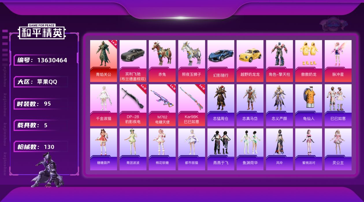 [13630464]苹果 手Q-1神装-4粉装-3特效枪-5载具-3粉色飞行器-48315热力值-9王牌印记-95套装-130枪皮 【红色神装等级】:角色-青焰关公(三级) 【红色角色神装】:角色-青焰关公 【热门品类】:角色-忠猛周仓,角色-忠真马岱,角色-忠义严颜,套装-龟仙人,大砍刀-青龙偃月刀,撬棍-龙胆亮银枪 【粉色载具】:宾利飞驰(布罗德盖棕双色),幻影随行,越野奶龙龙,赤兔,照夜玉狮子 【粉色套装】:角色-擎天柱,粉装-傲傲奶龙,角色-脉冲星,角色-千金淑猫 【粉色枪皮等级】:M762-电糖天使(五级),Kar98K-巳巳如意(五级),DP-28-豹影疾电(五级) 【粉色枪皮】:M762-电糖天使,Kar98K-巳巳如意,DP-28-豹影疾电 【粉色飞行器】:齐天大圣飞行器,电糖天使飞行器 【粉色降落伞】:洛神天依降落伞,莲影清波降落伞,龙行天下降落伞,猪猪侠降落伞,精灵梦叶罗丽降落伞,创世·救赎降落伞,动力核心降落伞,鬼刀降落伞,樱桃泡泡降落伞 【稀有套装】:套装-龟仙人,套装-巳巳如意,套装-糖糖葫芦,套装-青团波波,套装-棉花软糖,角色-都市丽猫,套装-燕燕于飞,套装-鱼渊荷华,角色-风玲,角色-蜜桃派对,角色-灵公主 【稀有枪皮】:AKM-彩虹符号,AKM-生命誓言,AKM-虎虎生威,AKM-霓虹街区,M16A4-幻世战舞者,SCAR-L-暗夜玫瑰,M416-糯团青竹,M416-蓝色火焰,GROZA-异彩先驱,GROZA-影袭,GROZA-蓝莓炮弹,AUG-天降萌叽,AUG-耀粉歌者,M762-彩虹符号,M762-瑞龙福将,AC-VAL-天降萌叽,AC-VAL-快闪甜心,蜜獾-天降萌叽,UZI-啾咪啾咪,UZI-天降萌叽,UZI-炫彩节奏,UMP45-蓝色火焰,Vector-焰鹰斗篷,Vector-生命誓言,Vector-龙行天下,汤姆逊-异彩先驱,汤姆逊-炫彩节奏,汤姆逊-耀粉歌者,汤姆逊-樱桃泡泡,野牛-沙丘之主,MP5K-异彩先驱,AKS-74U-鬼刀,P90-快闪甜心,Kar98K-影袭,Kar98K-炫彩节奏,AWM-焰鹰斗篷,Mini14-异彩先驱,Mini14-炫彩节奏,Win94-瑞龙福将,AMR-喜羊羊与灰太狼,AMR-墨龙九天,M417-惊鸿侠骨,MK20-H-快闪甜心,MK20-H-莲影清波,M200-惊鸿侠骨,S686-生命誓言,S12K