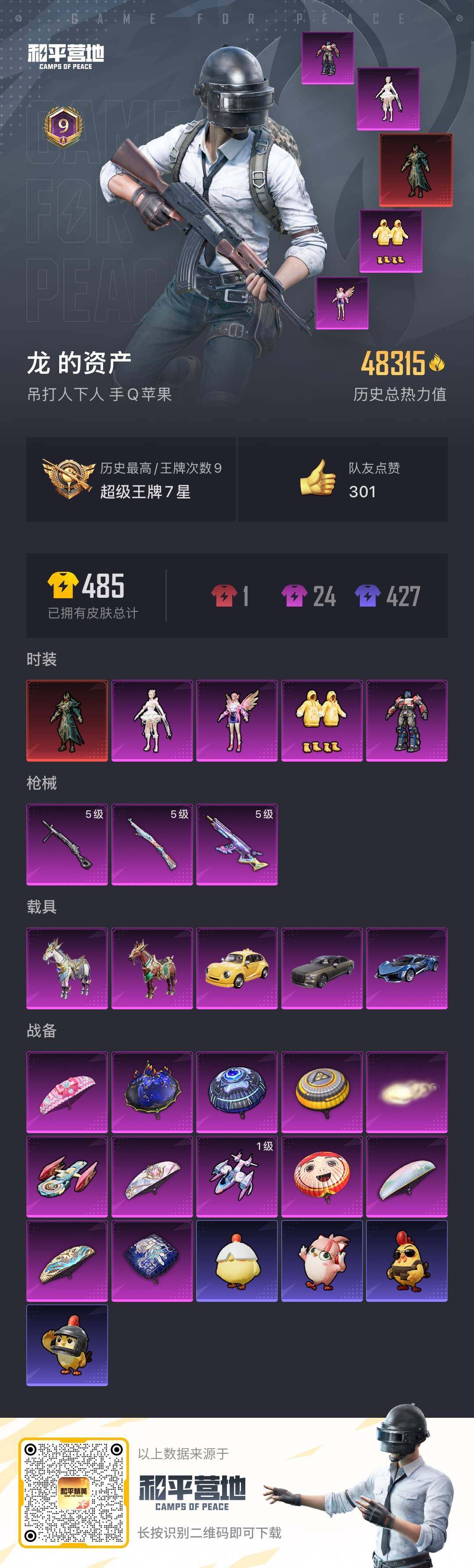 [13630464]苹果 手Q-1神装-4粉装-3特效枪-5载具-3粉色飞行器-48315热力值-9王牌印记-95套装-130枪皮