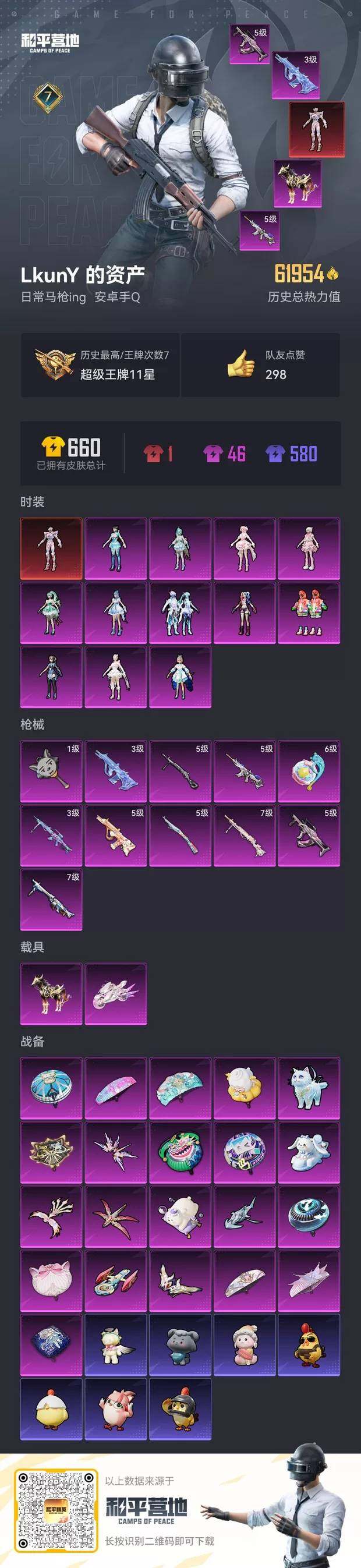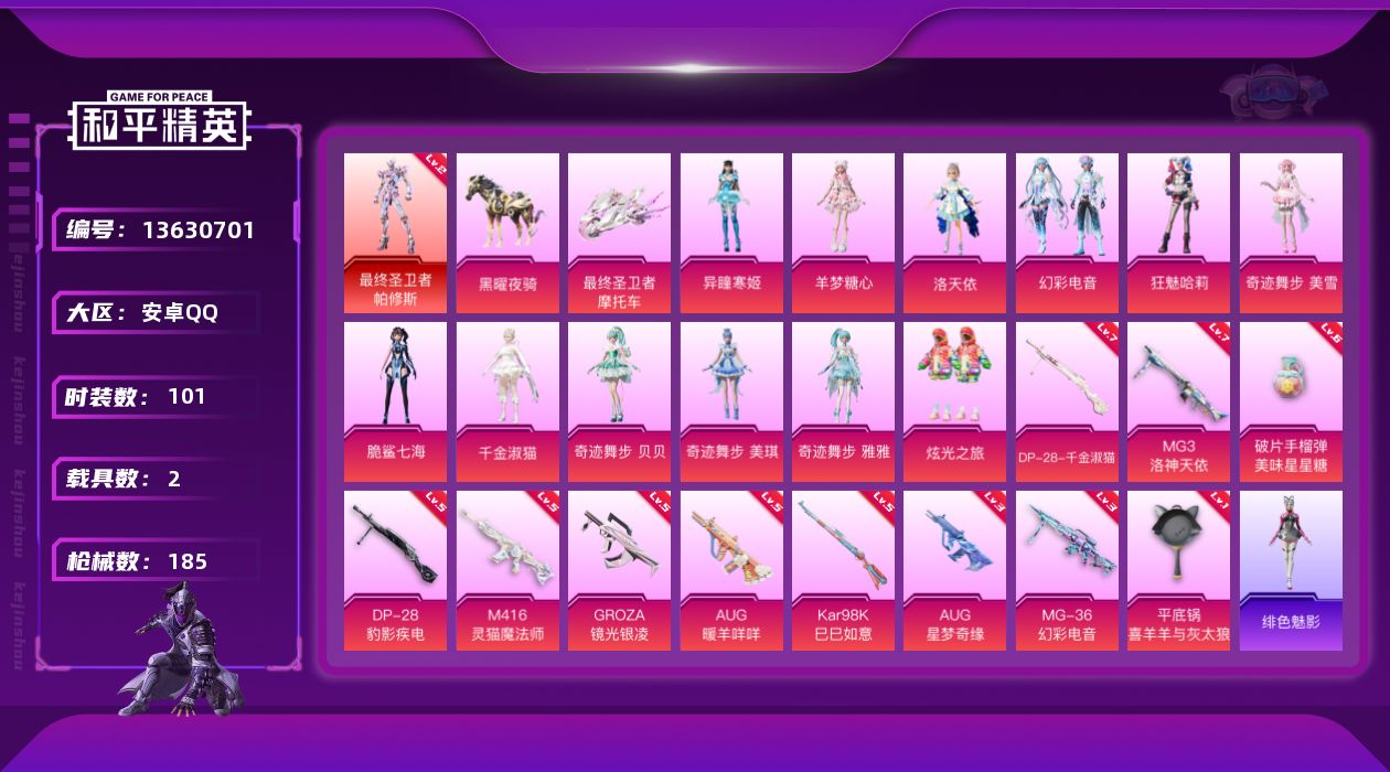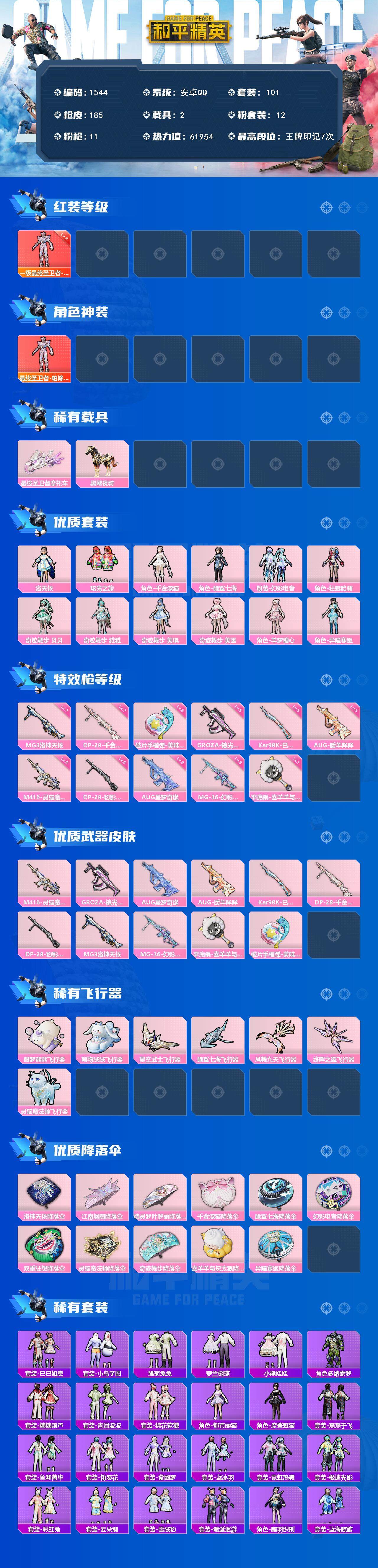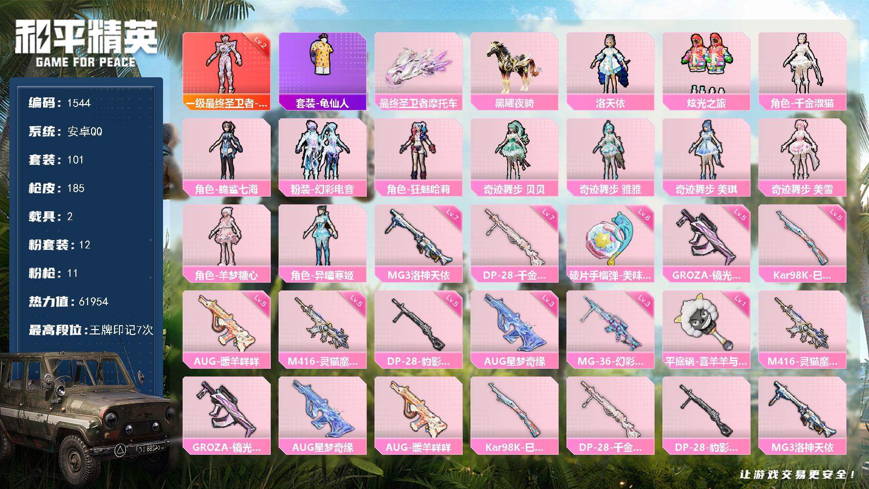 [13630701]安卓 手Q-1神装-12粉装-11特效枪-2载具-9粉色飞行器-61954热力值-7王牌印记-101套装-185枪皮